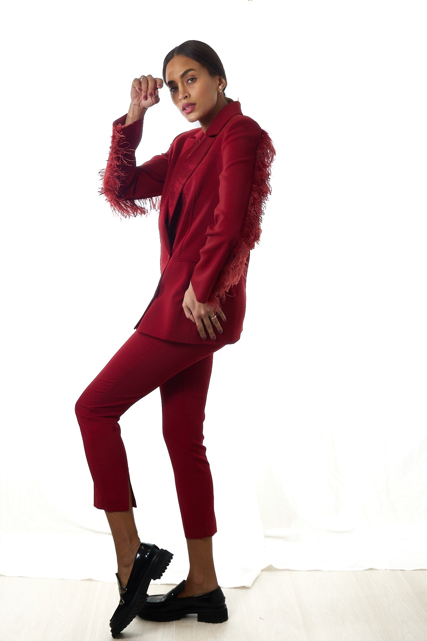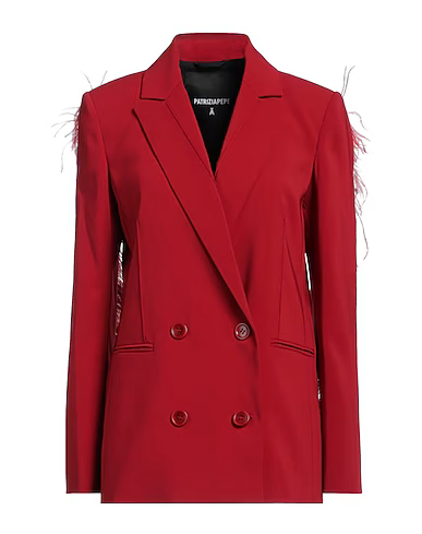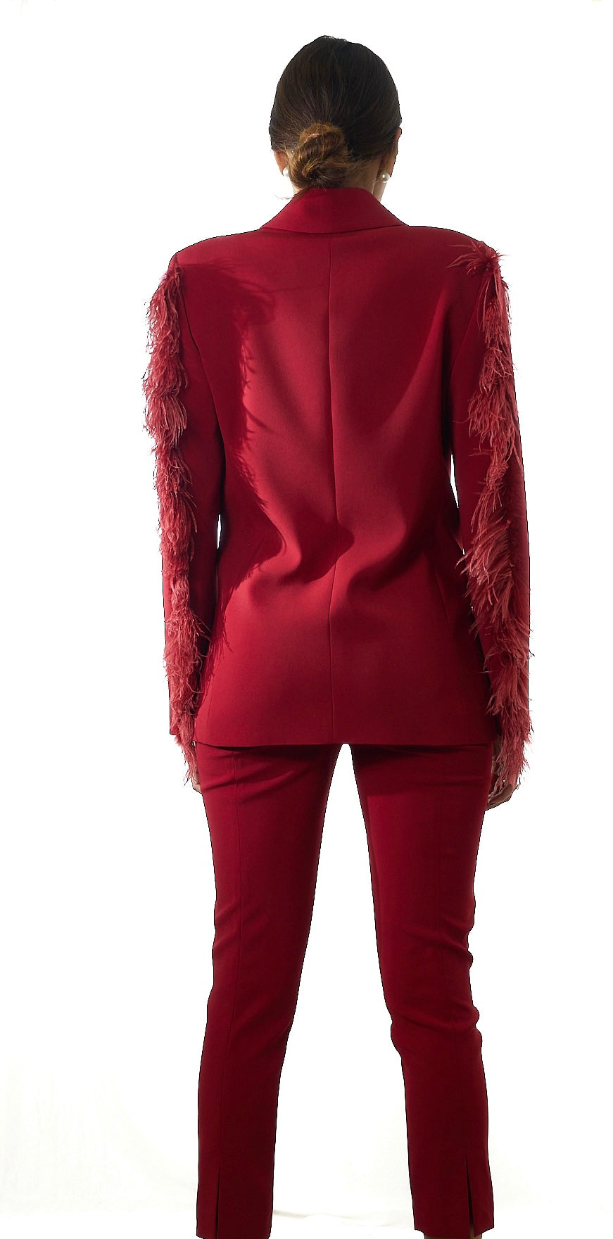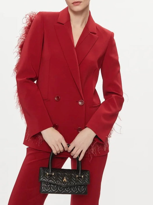 Giacca blazer doppiopetto crepe, con dettagli in piume, tinta unita, collo con revers, maniche lunghe, interno foderato, chiusura con bottoni, tasche a filetto, elasticizzato.