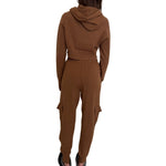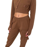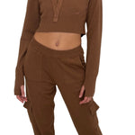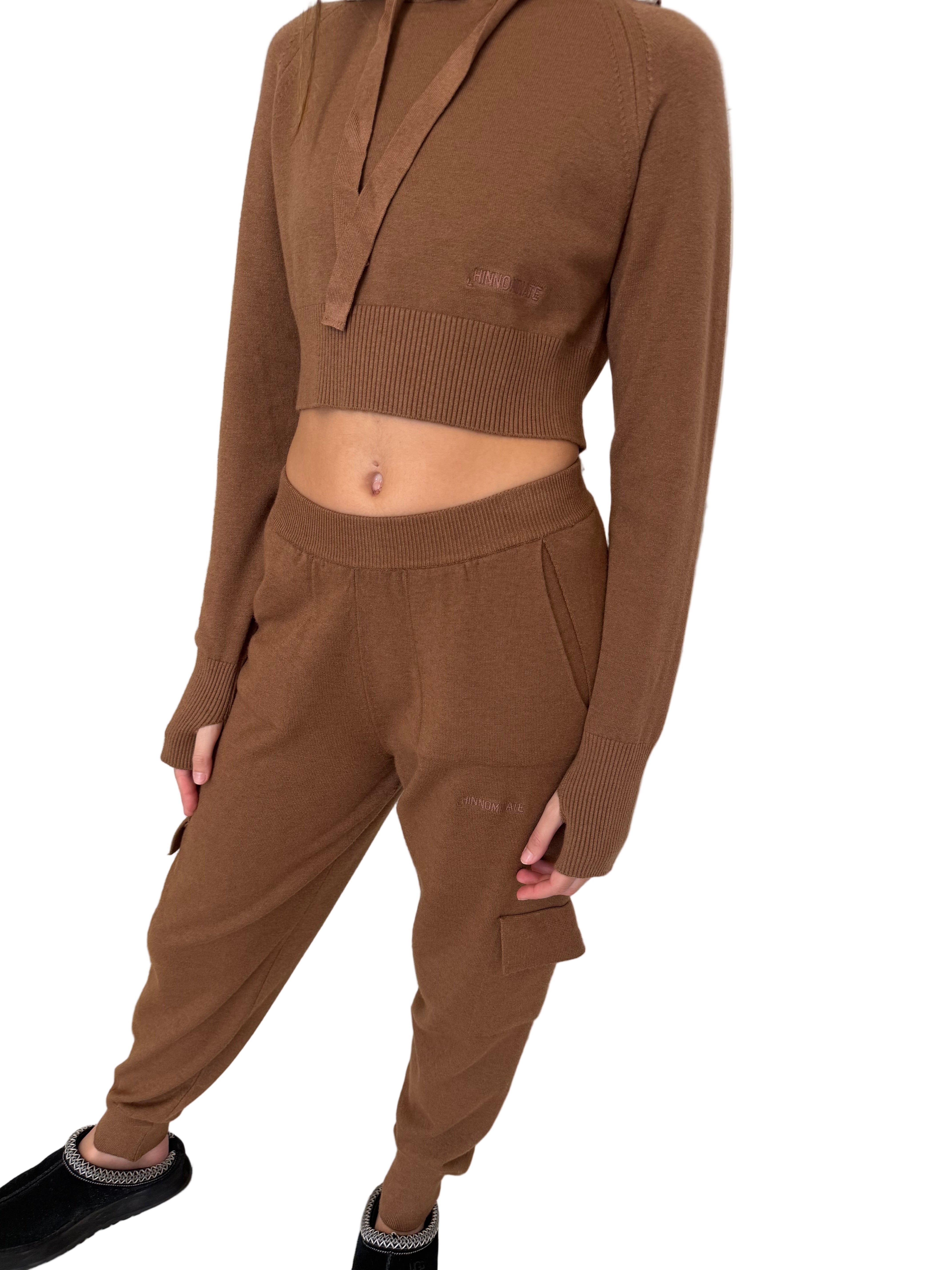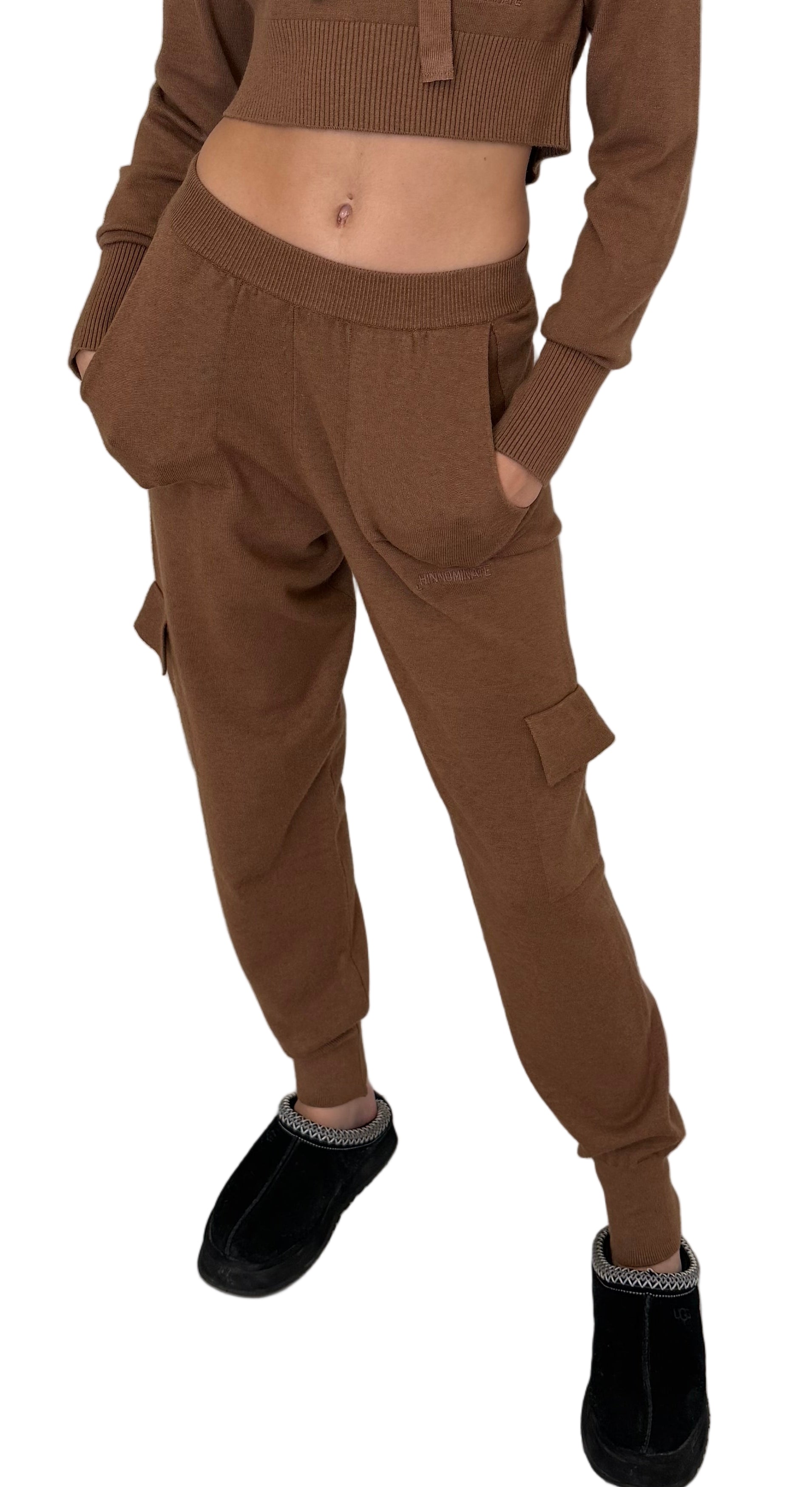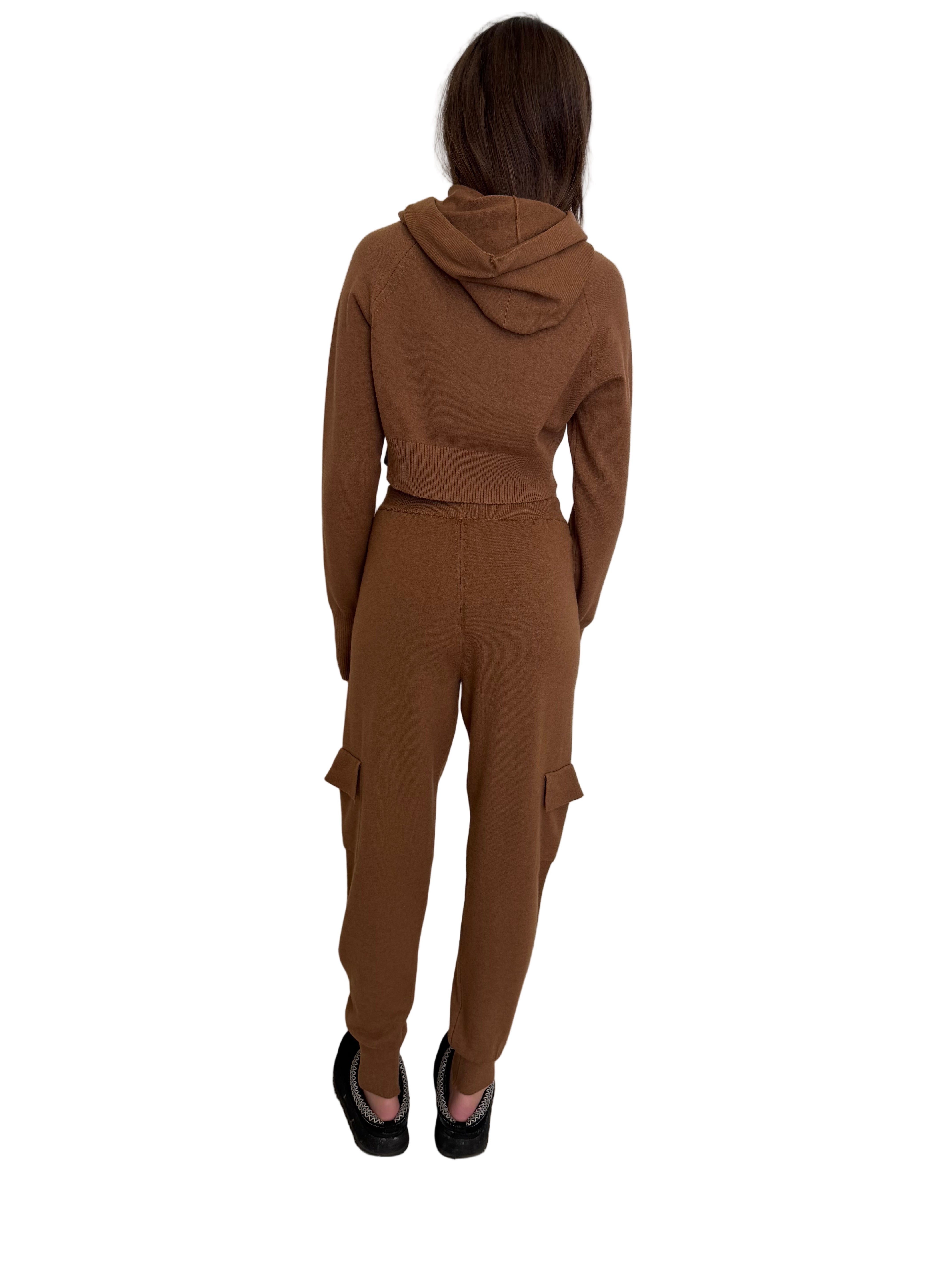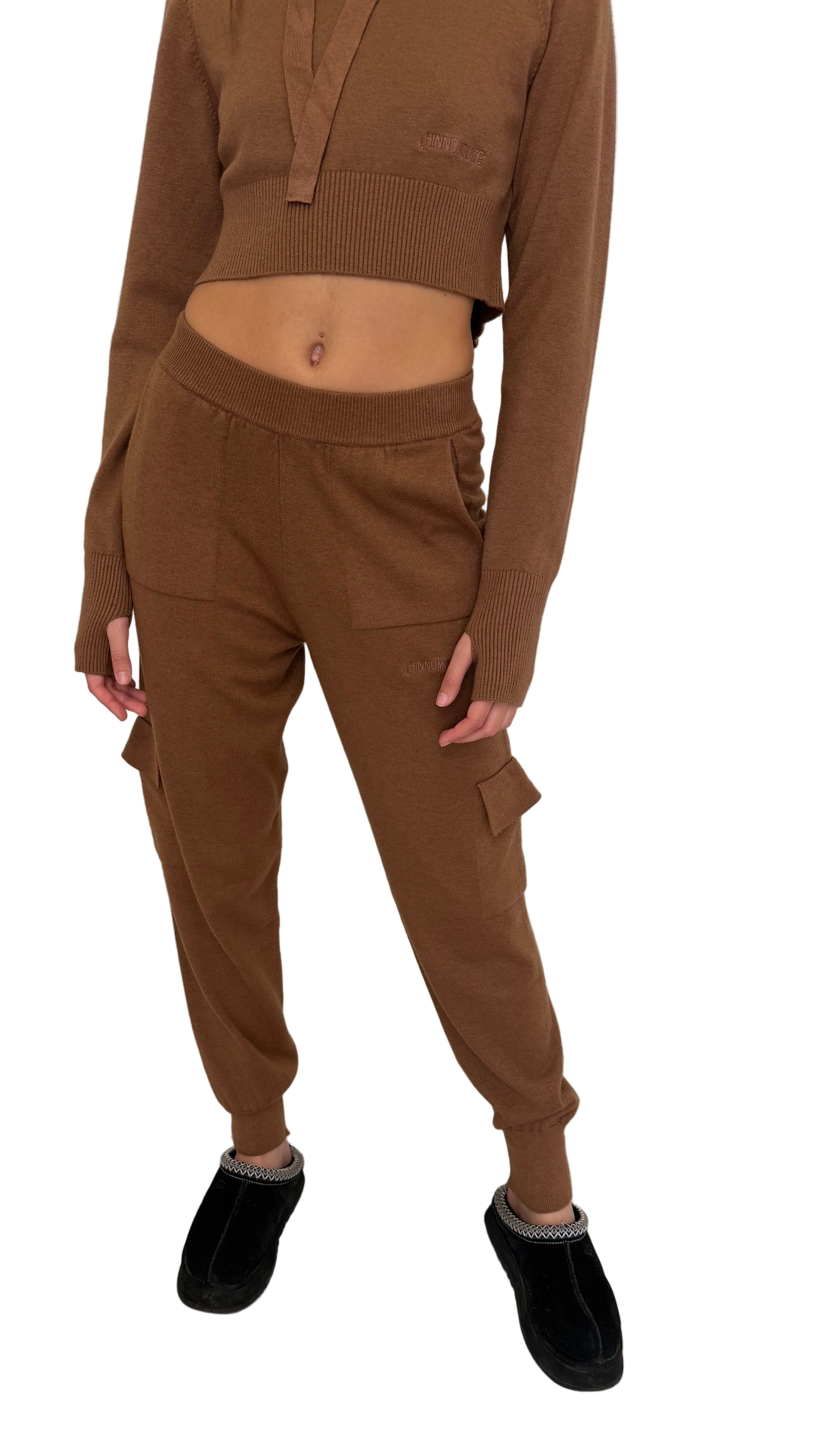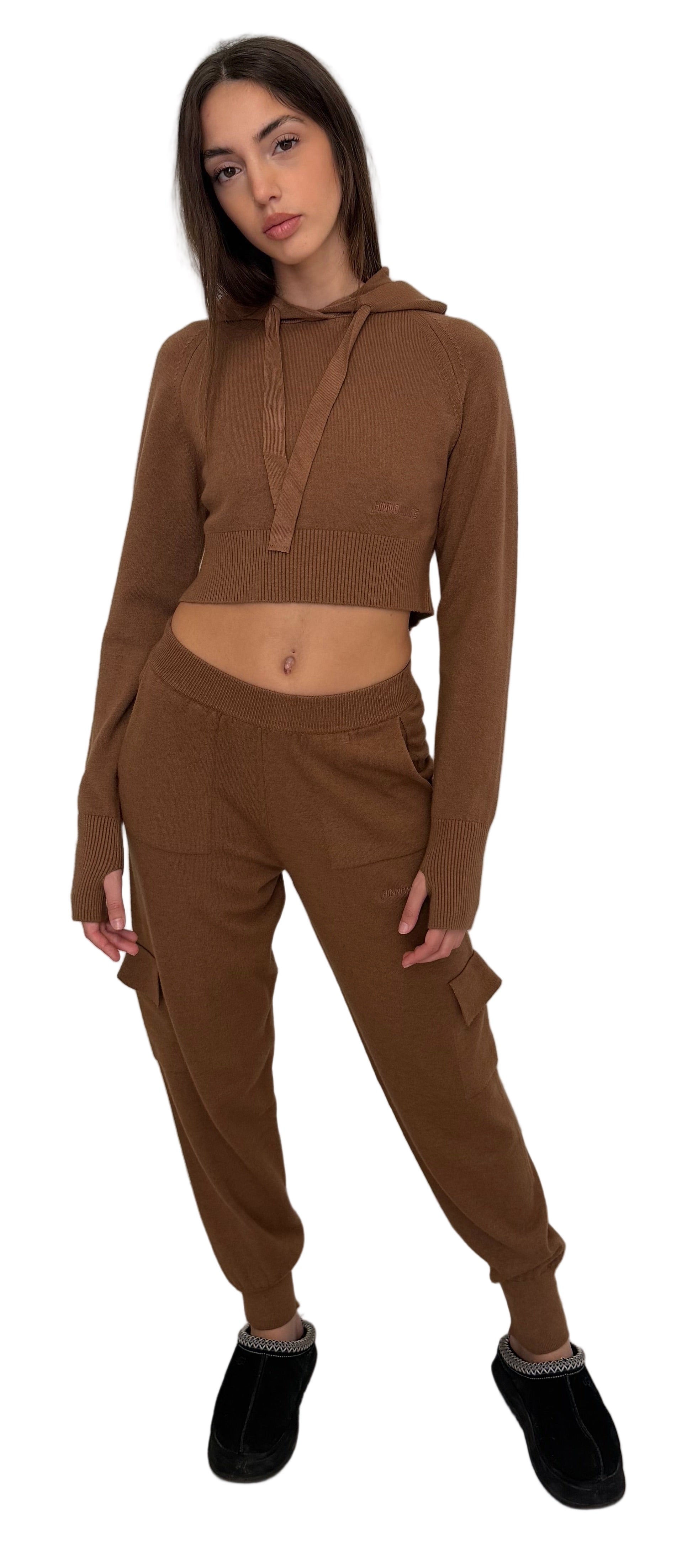 Set in maglia composto da felpa crop con cappuccio e pantalone cargo. La felpa è morbida, confortevole e rifinita con logo tono su tono.Il pantalone presenta tasche cargo, vita elastica e fondo caviglia aderente per un look casual e moderno.