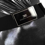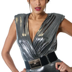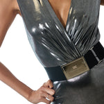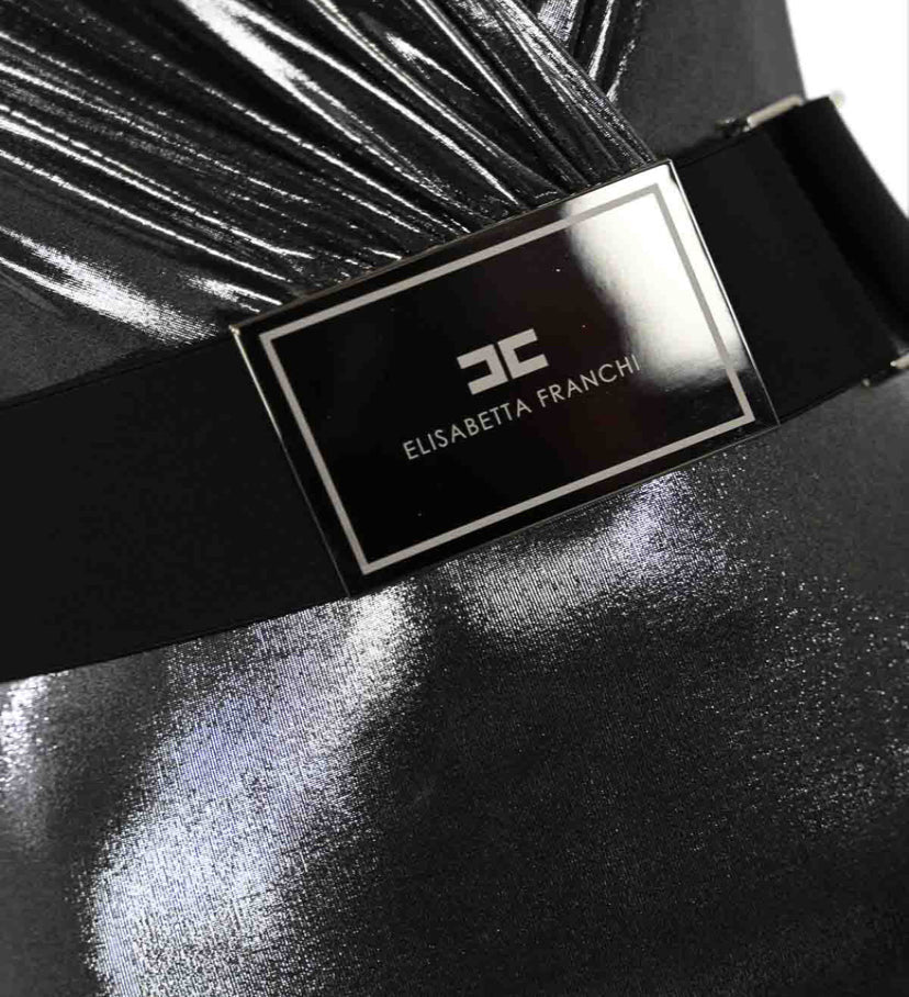Tuta smanicata in jersey laminato con profonda scollatura drappeggiata e pantalone leggings. Il punto vita è enfatizzato da una cintura in materiale sintetico effetto pelle con fibbia in metallo silver.