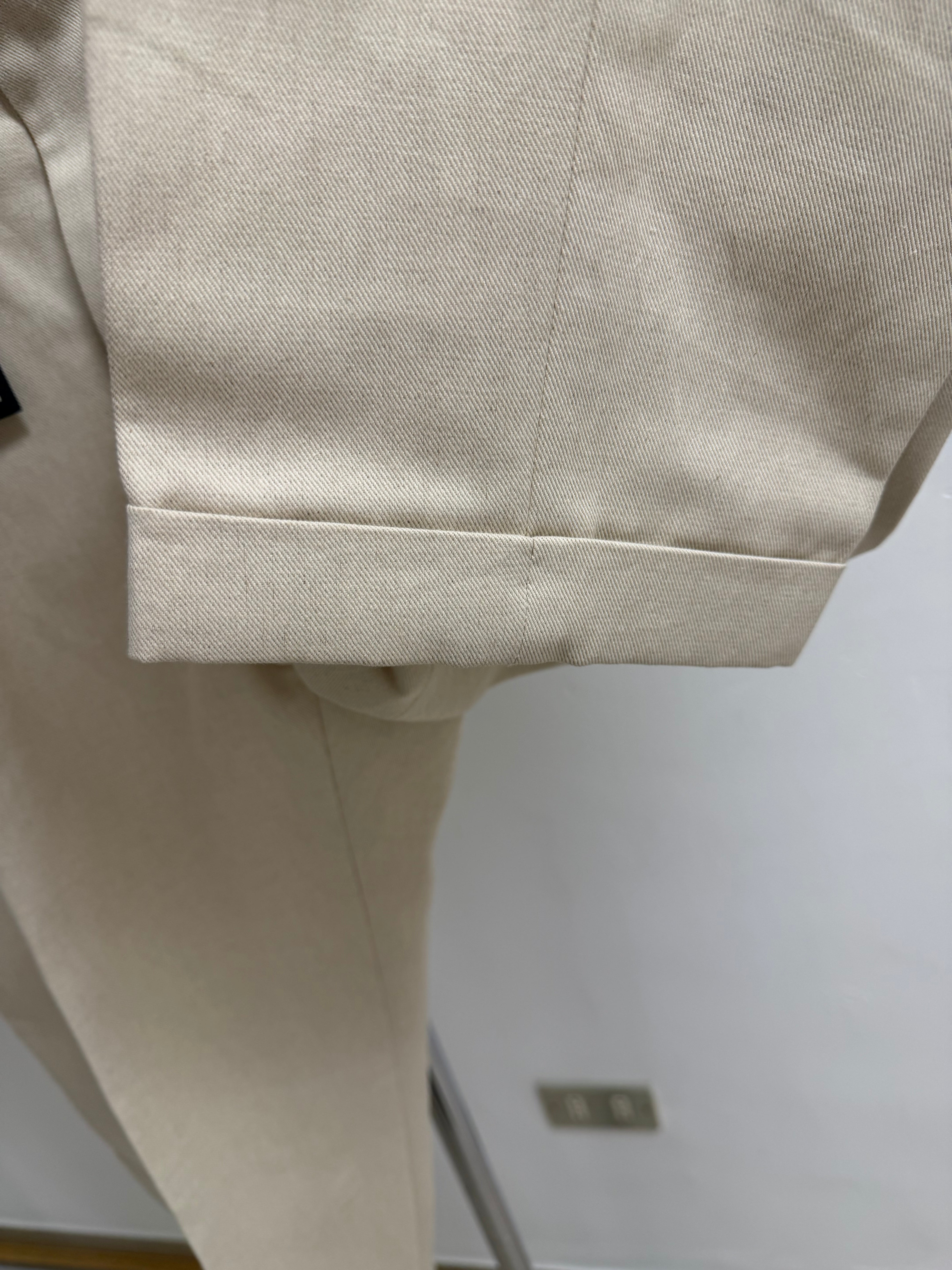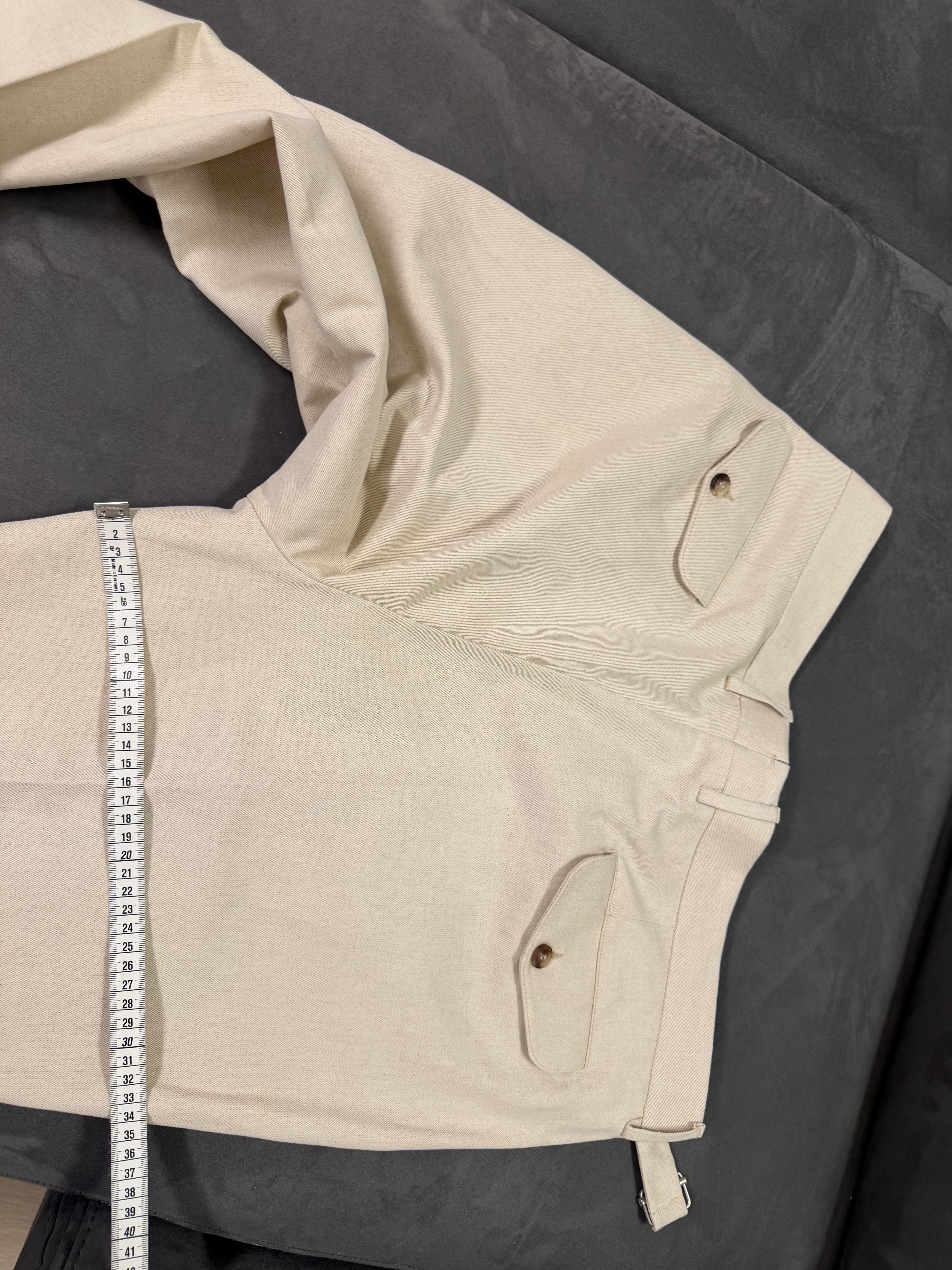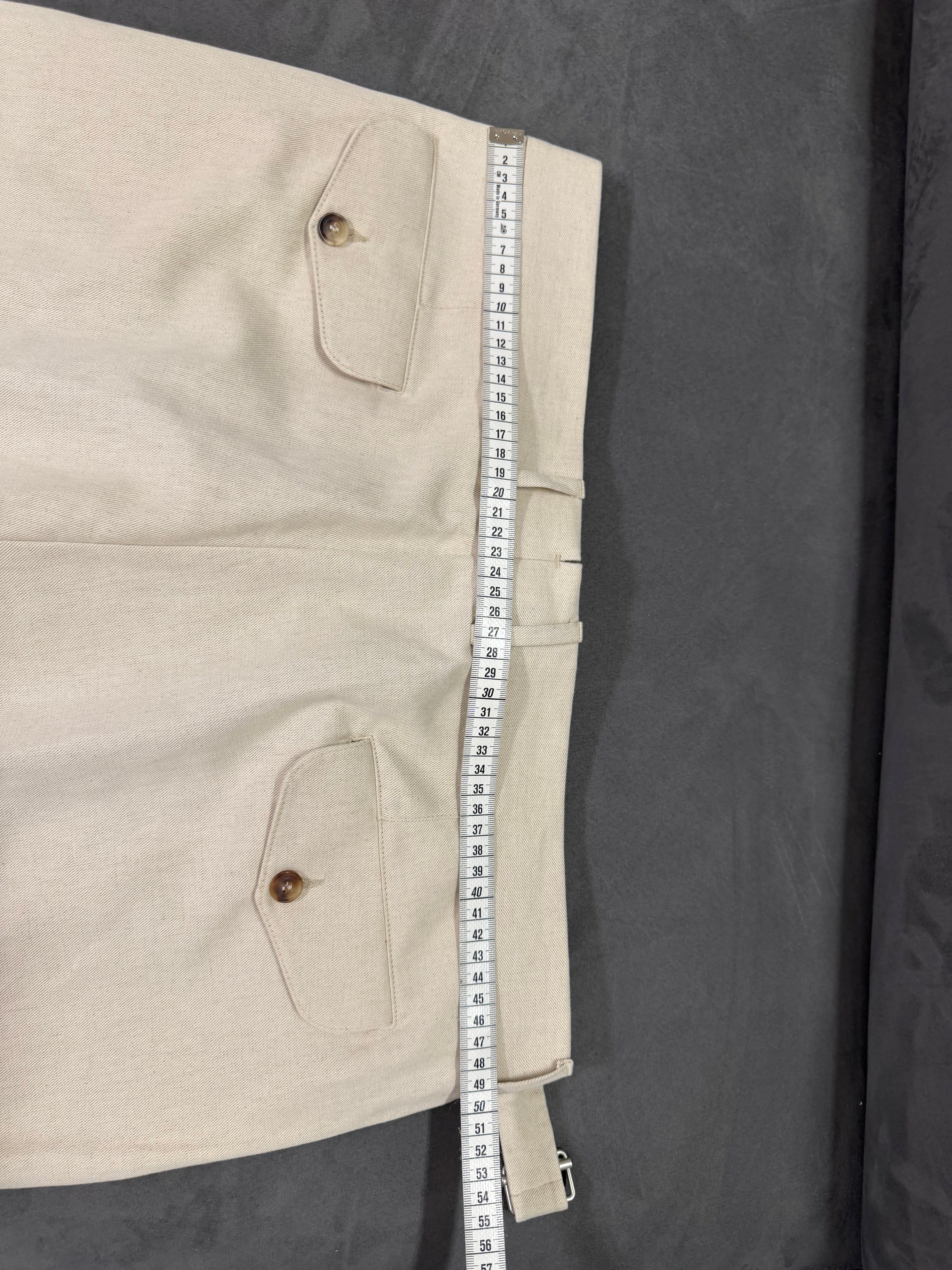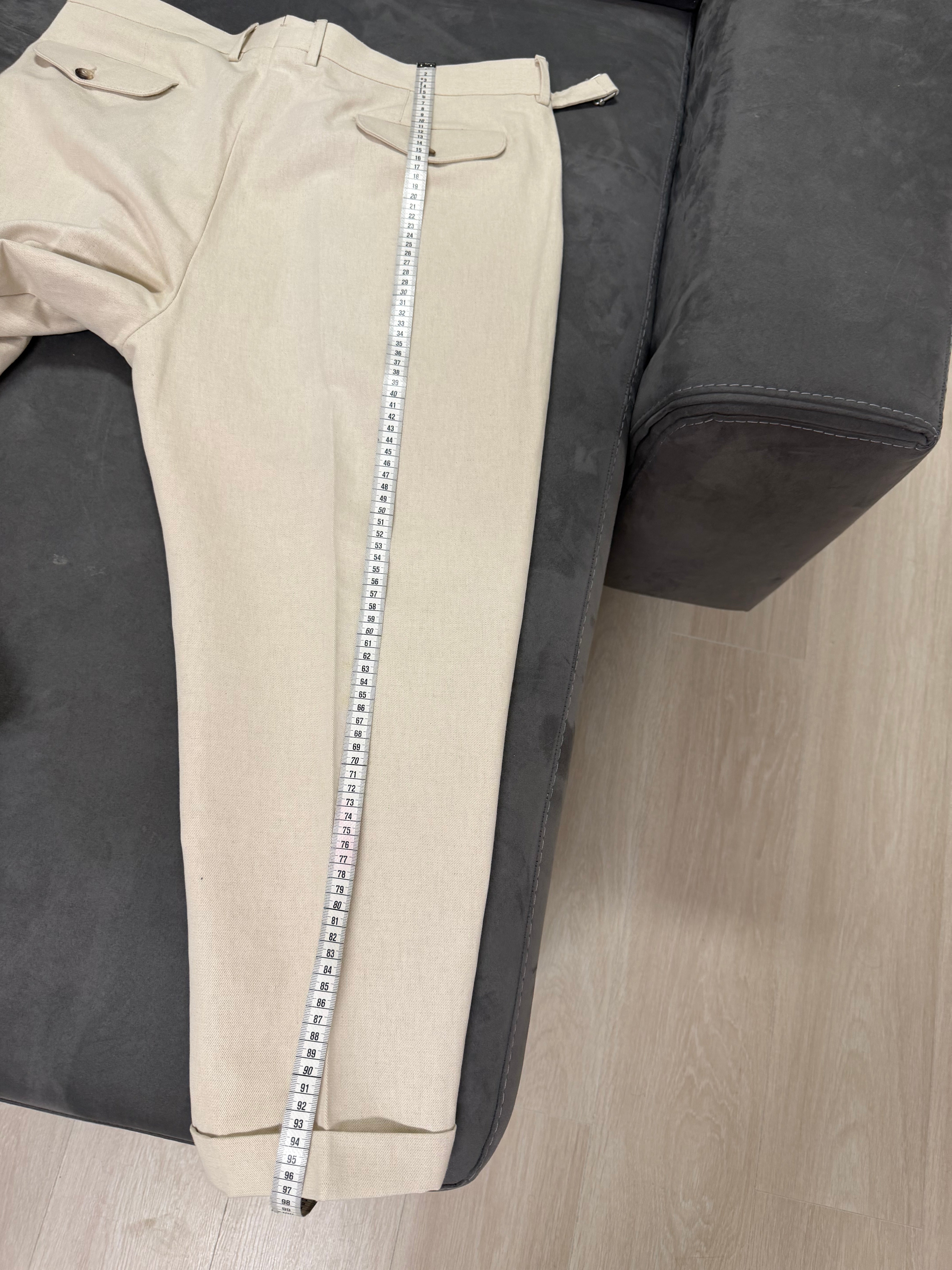 • Dettaglio Cinturino: Caratterizzati da un prolungamento della cintura in vita con chiusura a scomparsa, un tocco distintivo della sartoria di alto livello.