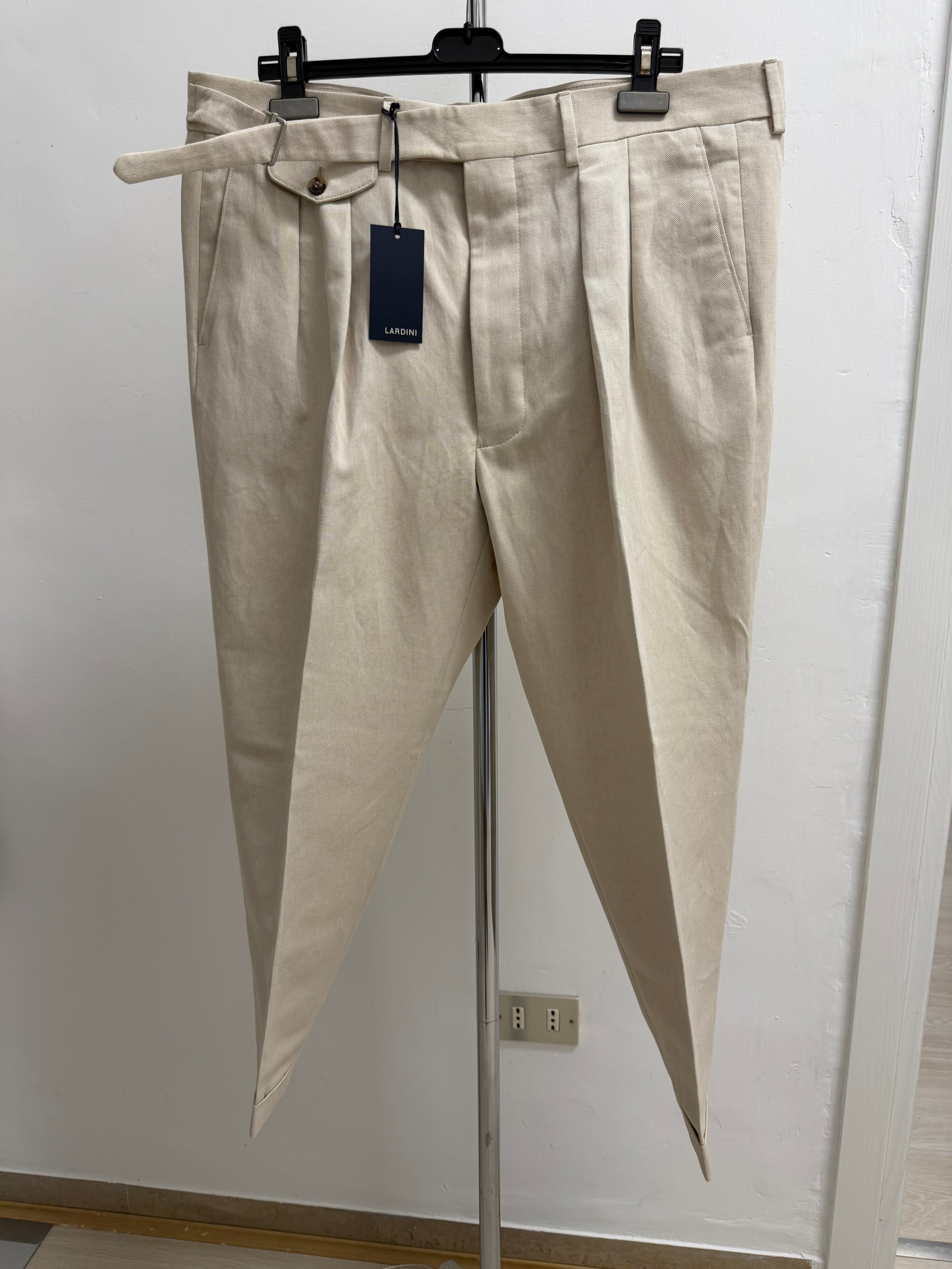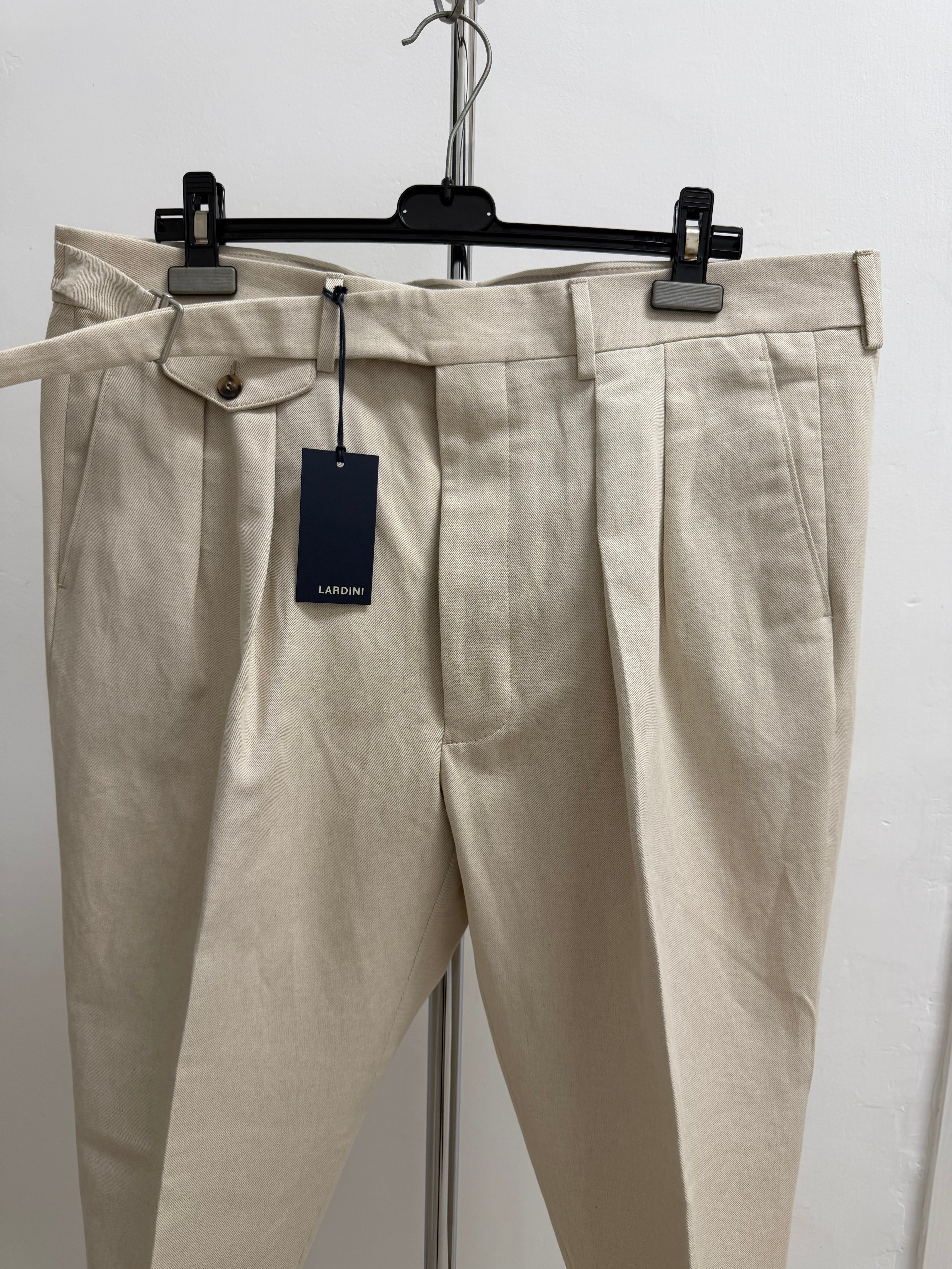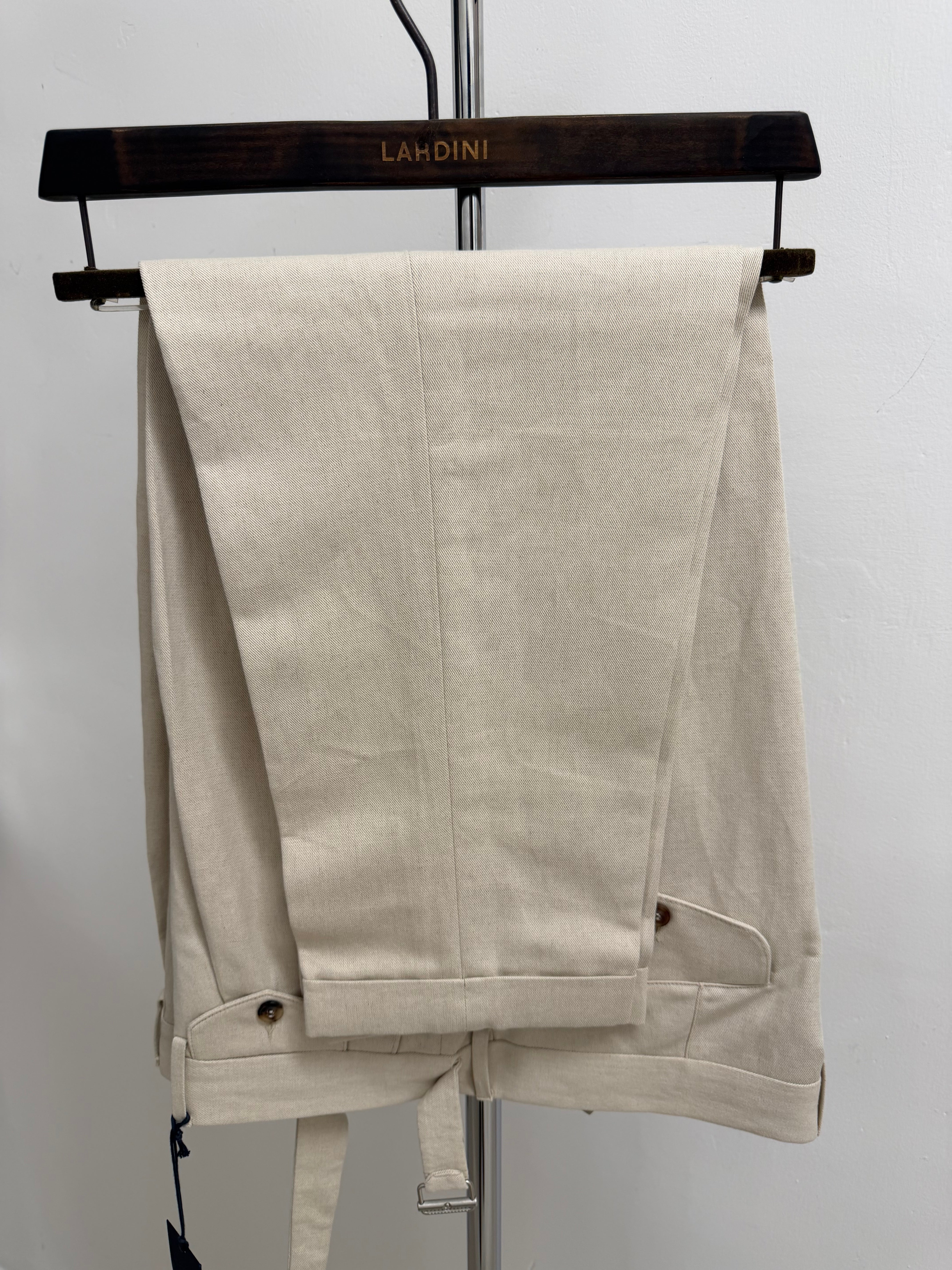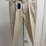 Questi pantaloni rappresentano l'essenza dell'eleganza sartoriale italiana di Lardini. Realizzati in un pregiato tessuto di cotone color beige chiaro, offrono un equilibrio perfetto tra comfort e stile strutturato.