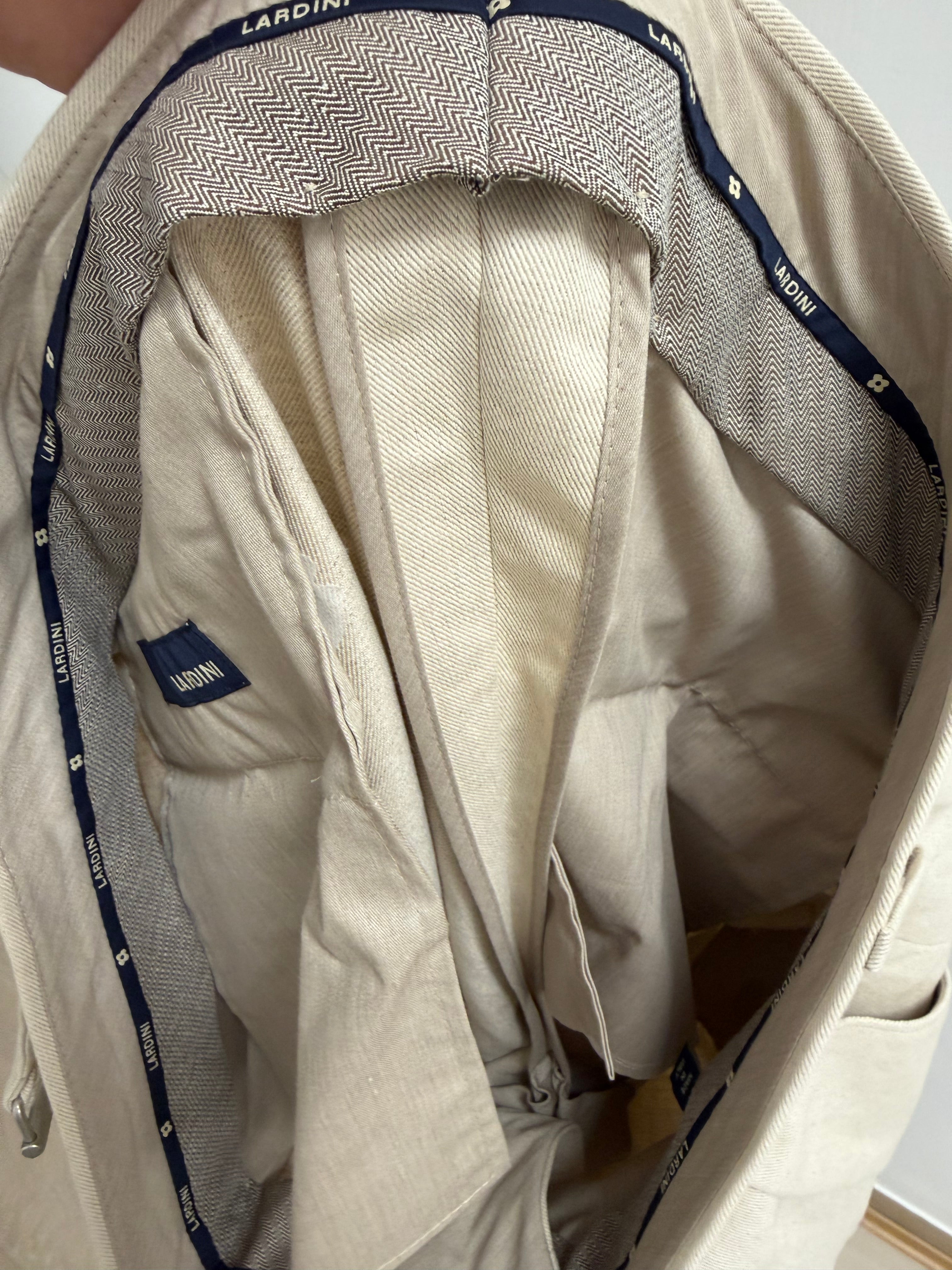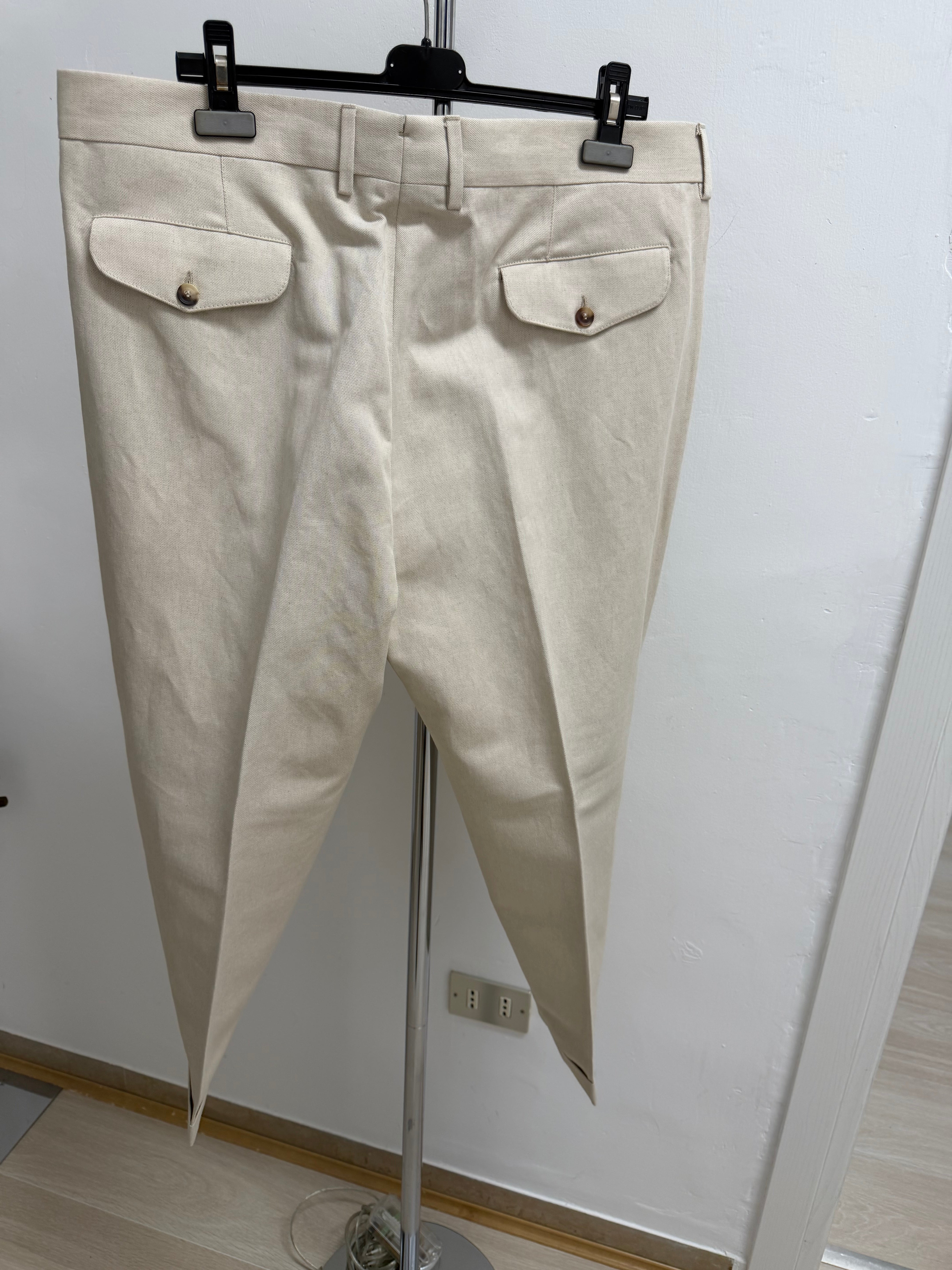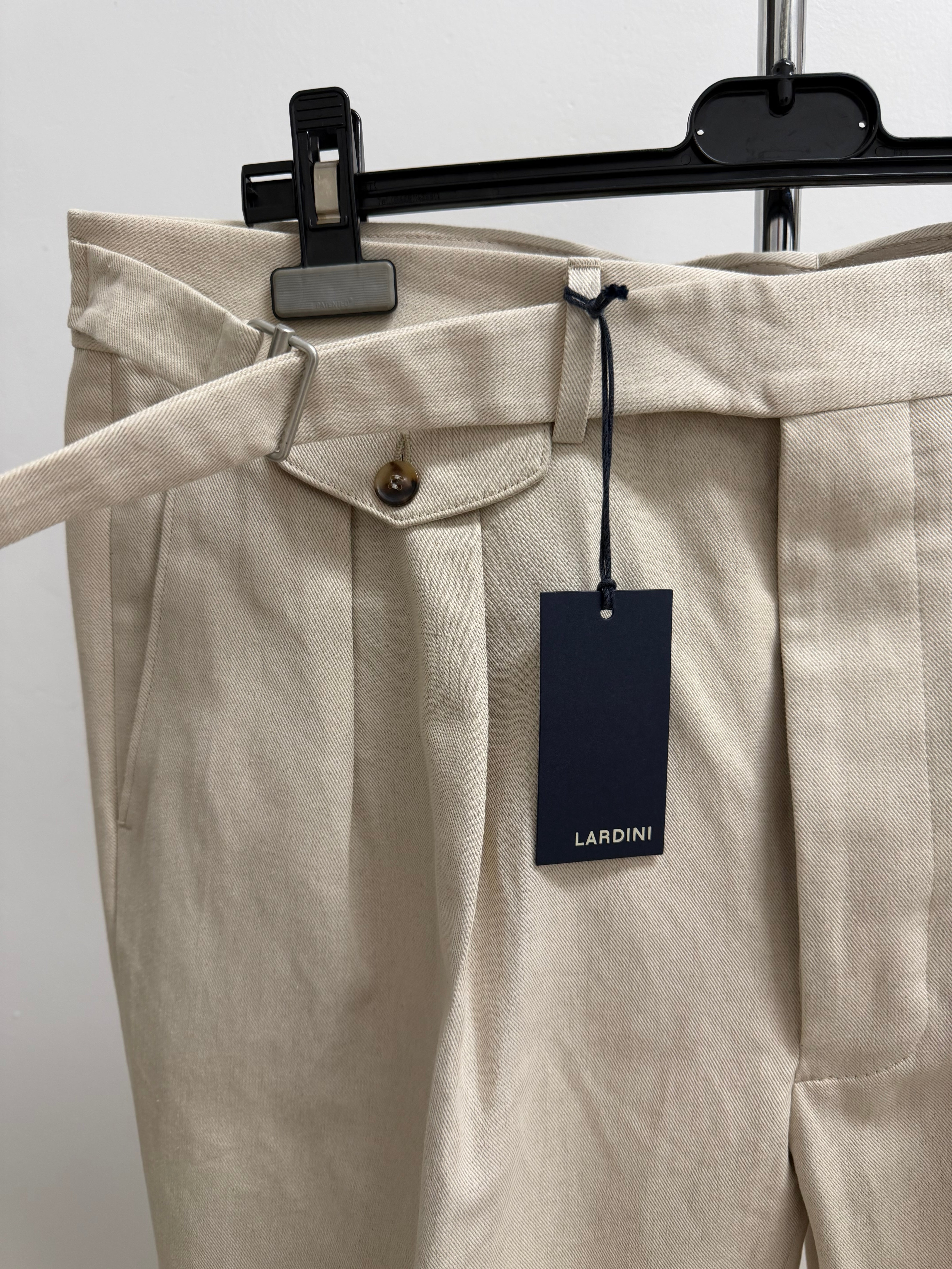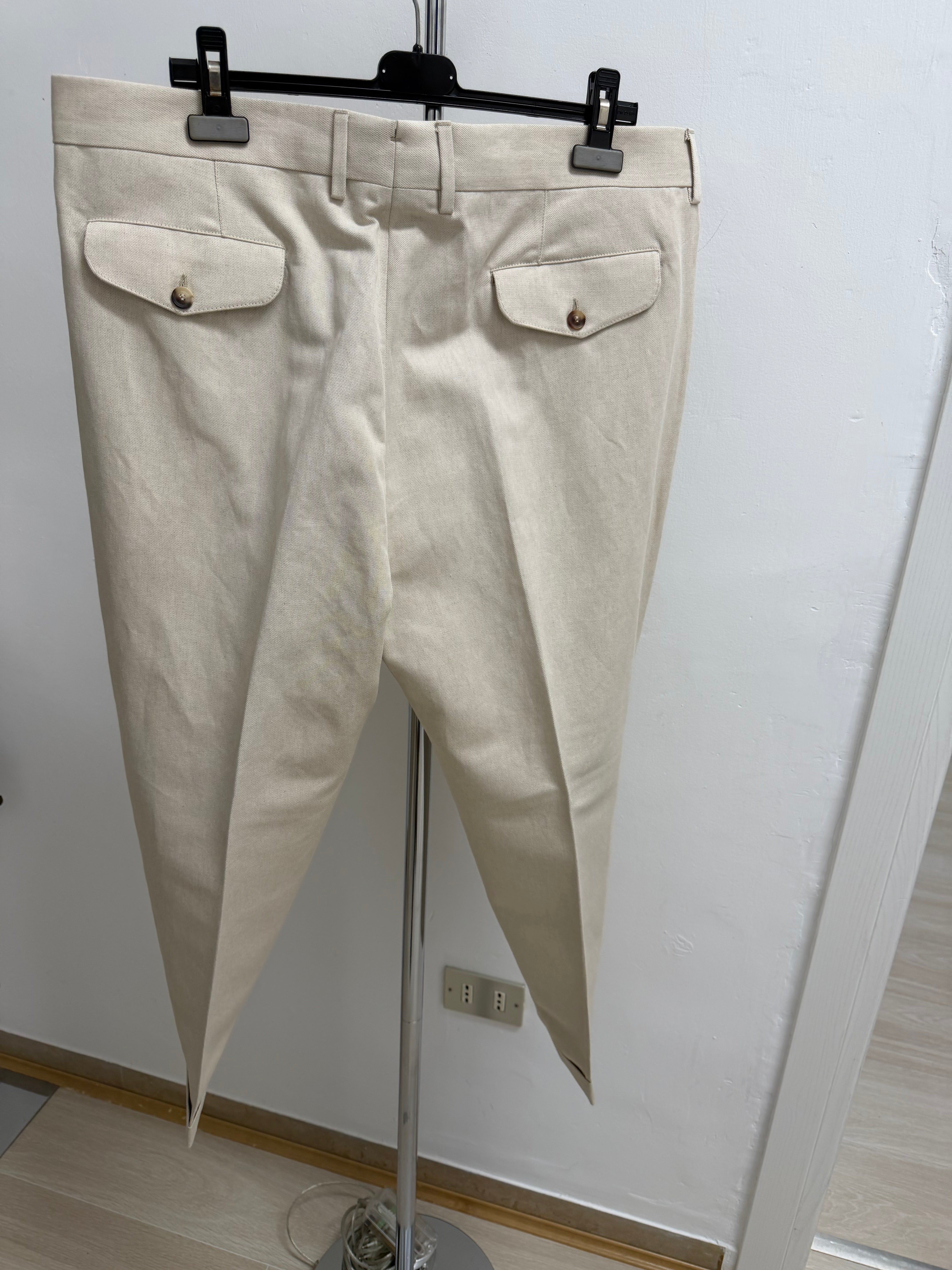 Questi pantaloni rappresentano l'essenza dell'eleganza sartoriale italiana di Lardini. Realizzati in un pregiato tessuto di cotone color beige chiaro, offrono un equilibrio perfetto tra comfort e stile strutturato.