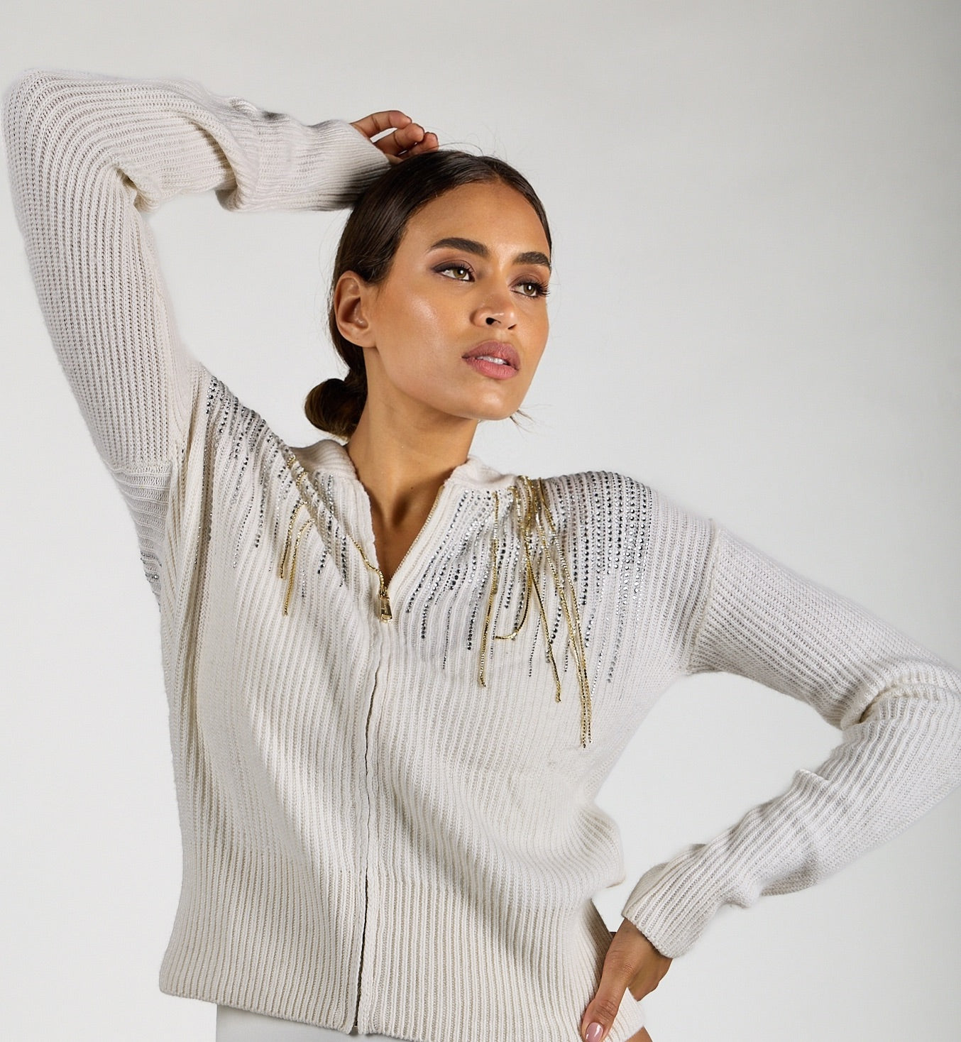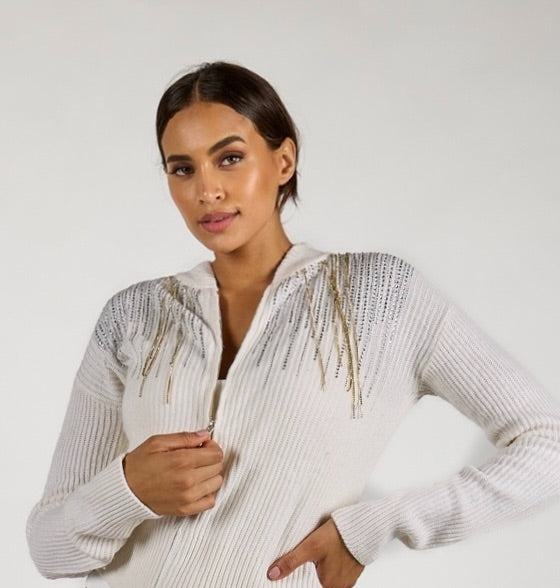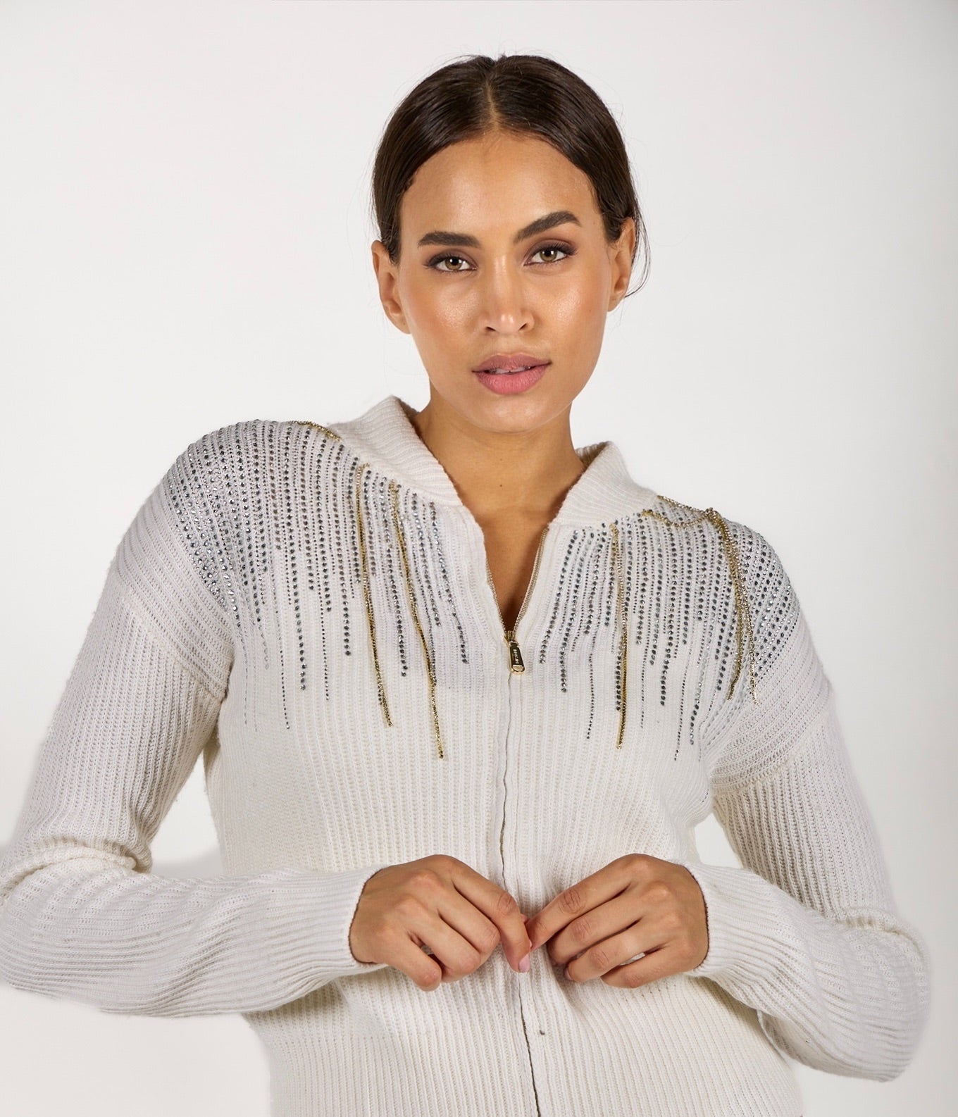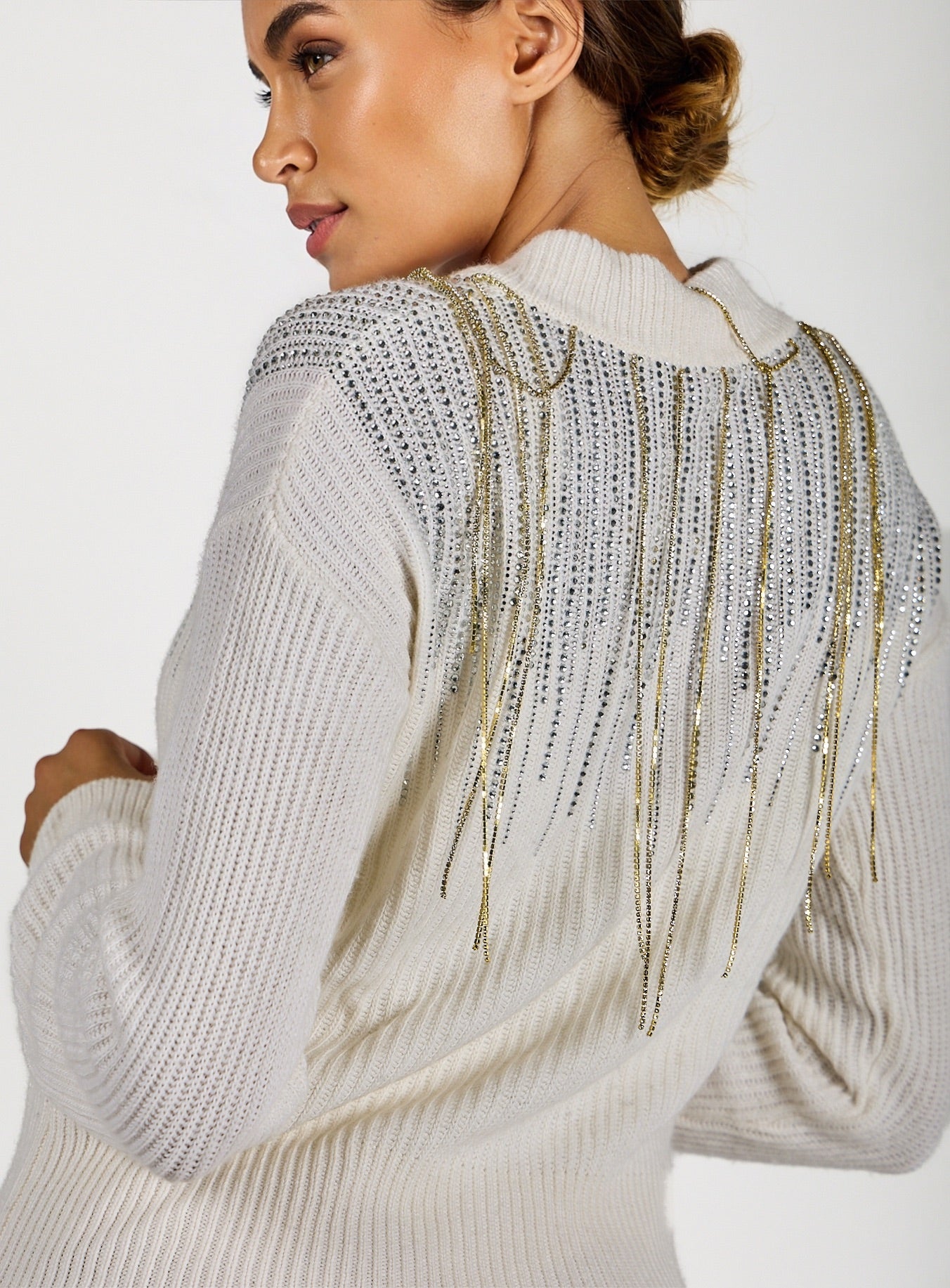 Maglia in misto lana, viscosa e cachemire lavorata con cristalli applicati a frange catene ,linea morbida ,maniche lunghe .