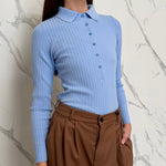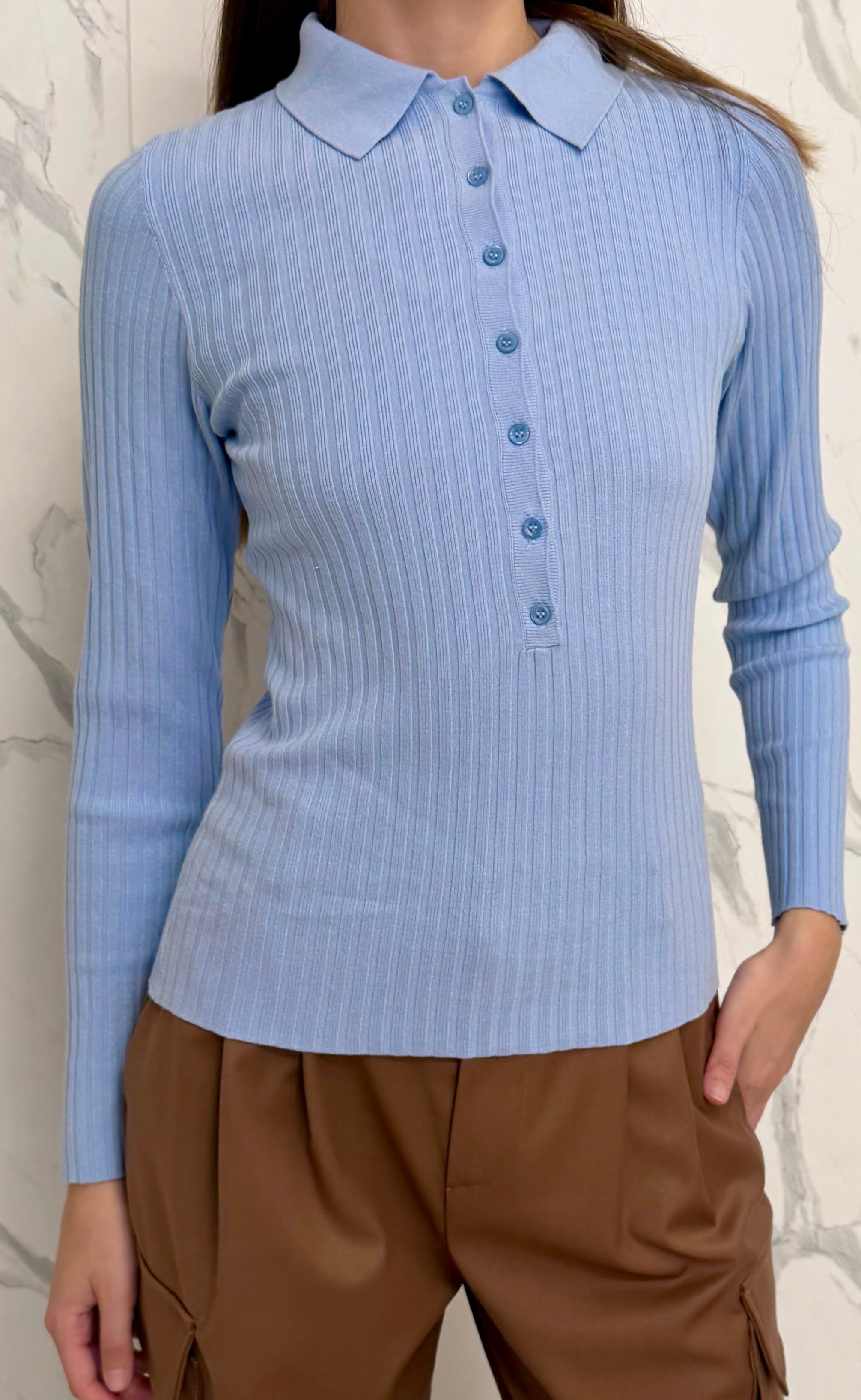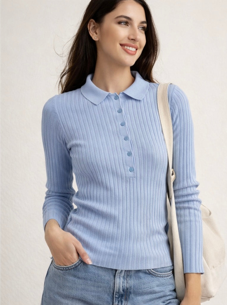 Il design con colletto polo e abbottonatura frontale dona un tocco raffinato e femminile, perfetto sia per look eleganti che per abbinamenti più casual.