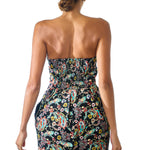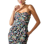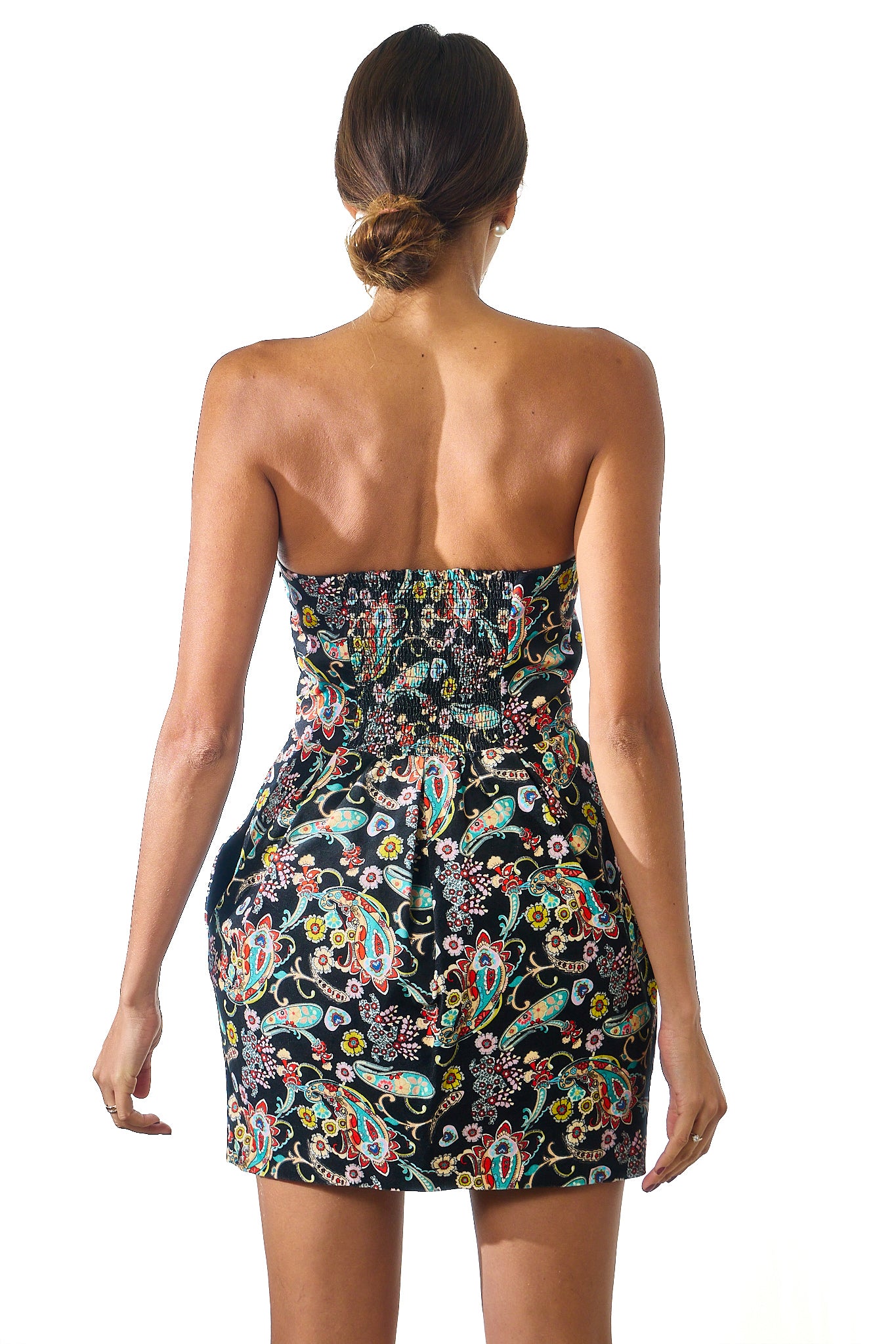 Abito corto bustier Aniye By dal taglio femminile e grintoso. Realizzato in tessuto a fantasia cachemire multicolor su base nera, presenta una scollatura a cuore che valorizza il décolleté e una gonna strutturata con pieghe che dona volume e movimento.