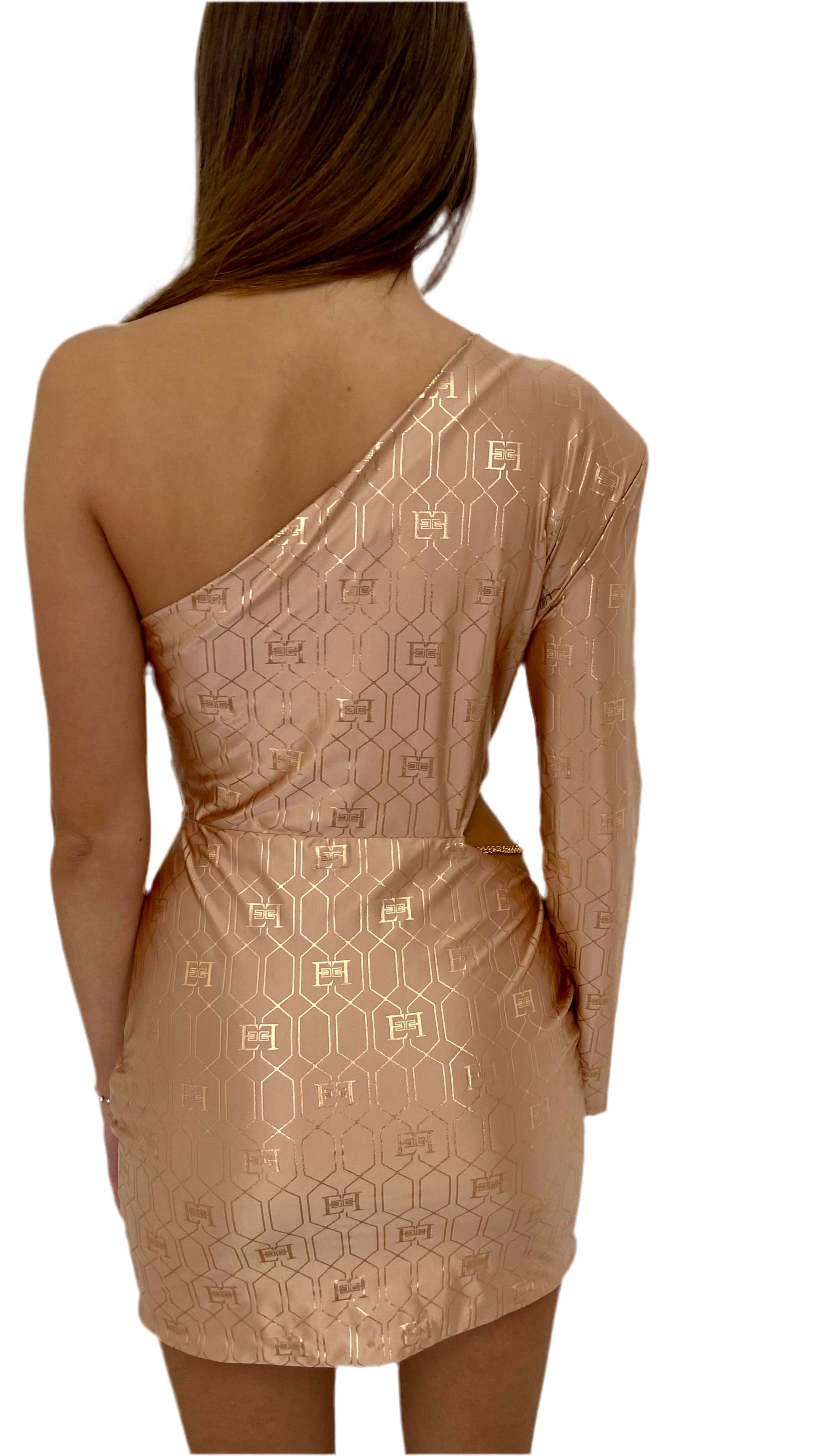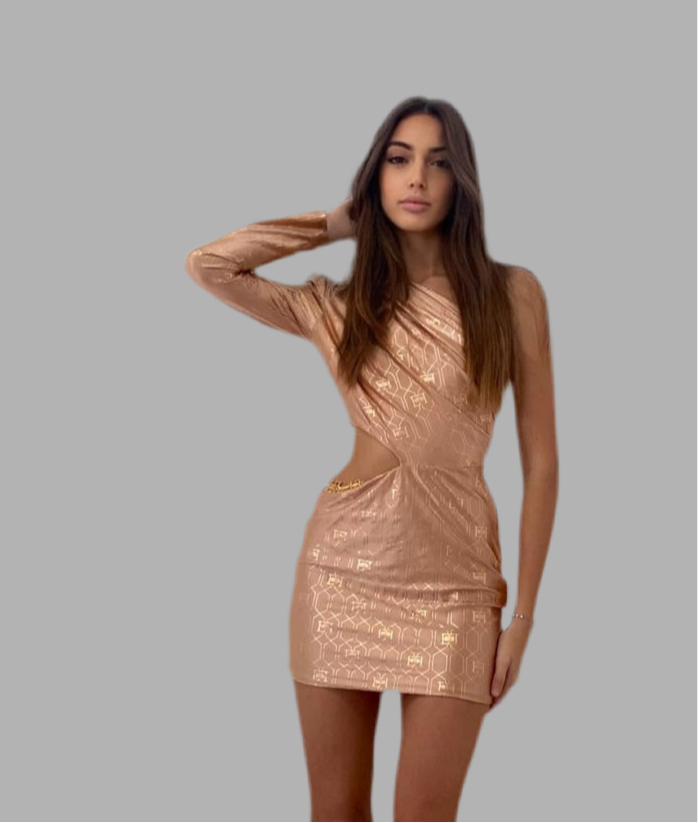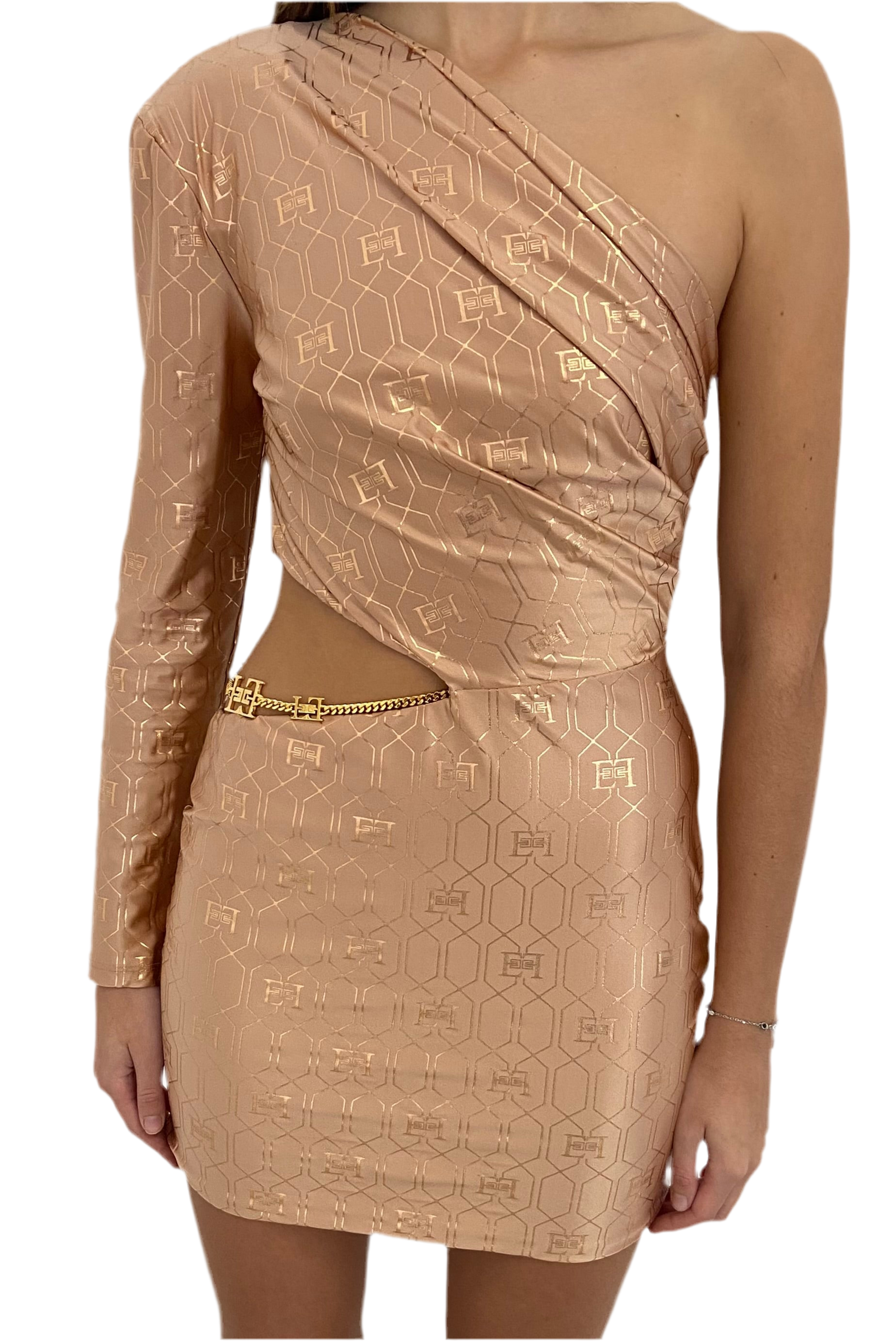 Miniabito asimmetrico in tessuto Lycra lucido con stampa laminata logo all-over. Presenta un motivo cut-out sul davanti impreziosito da una catena in metallo dorato .