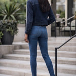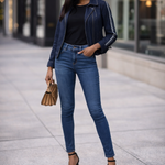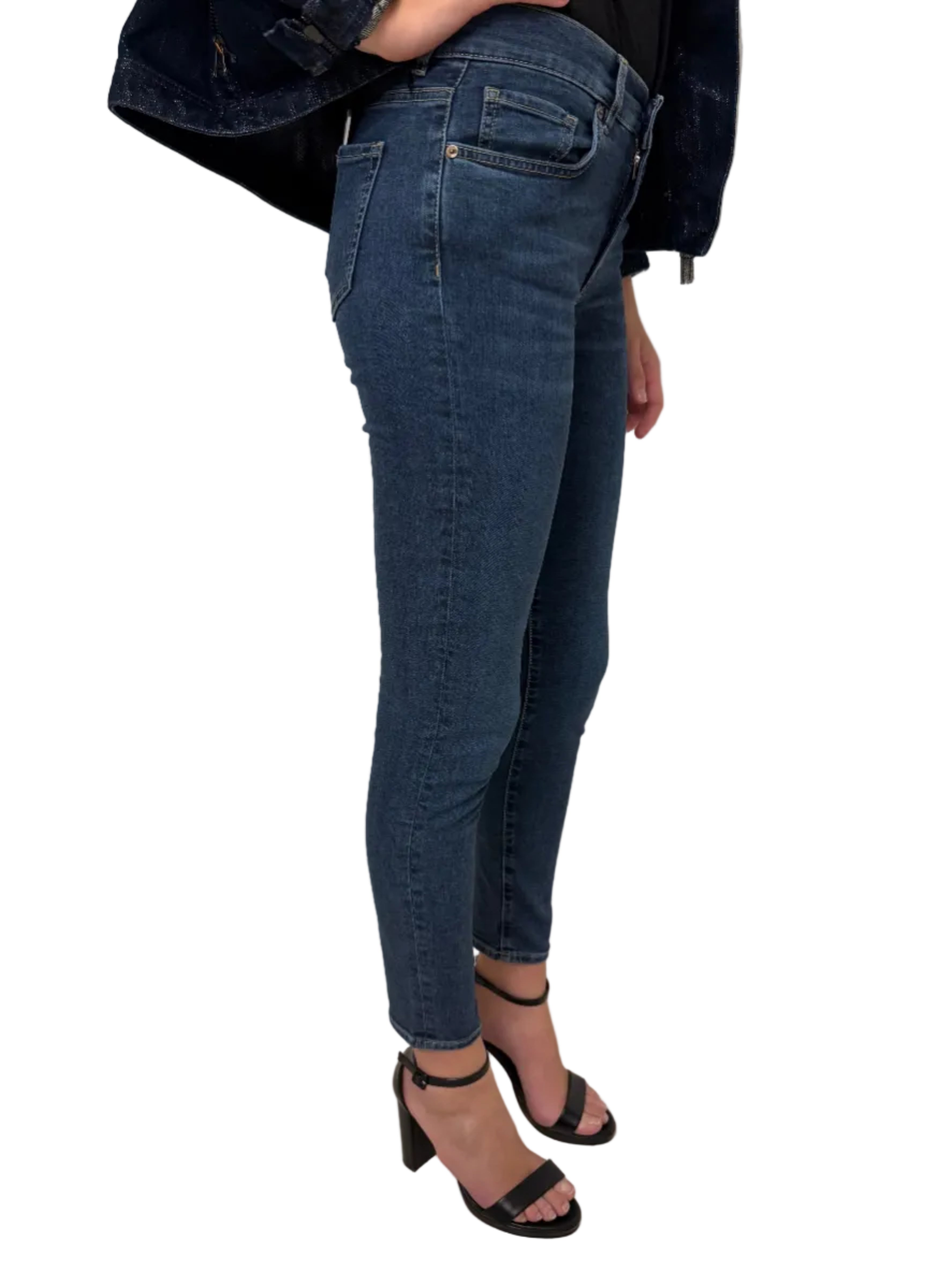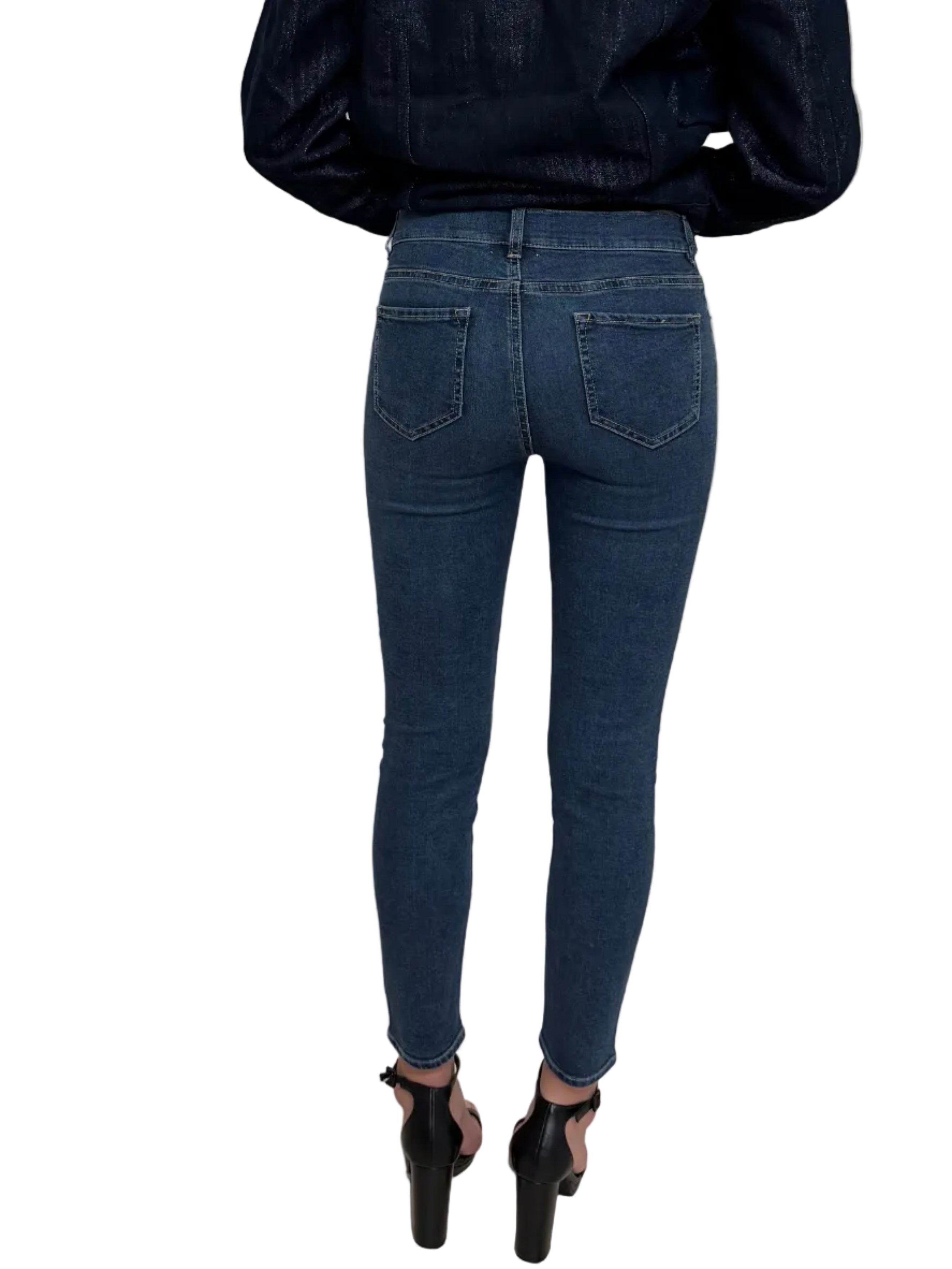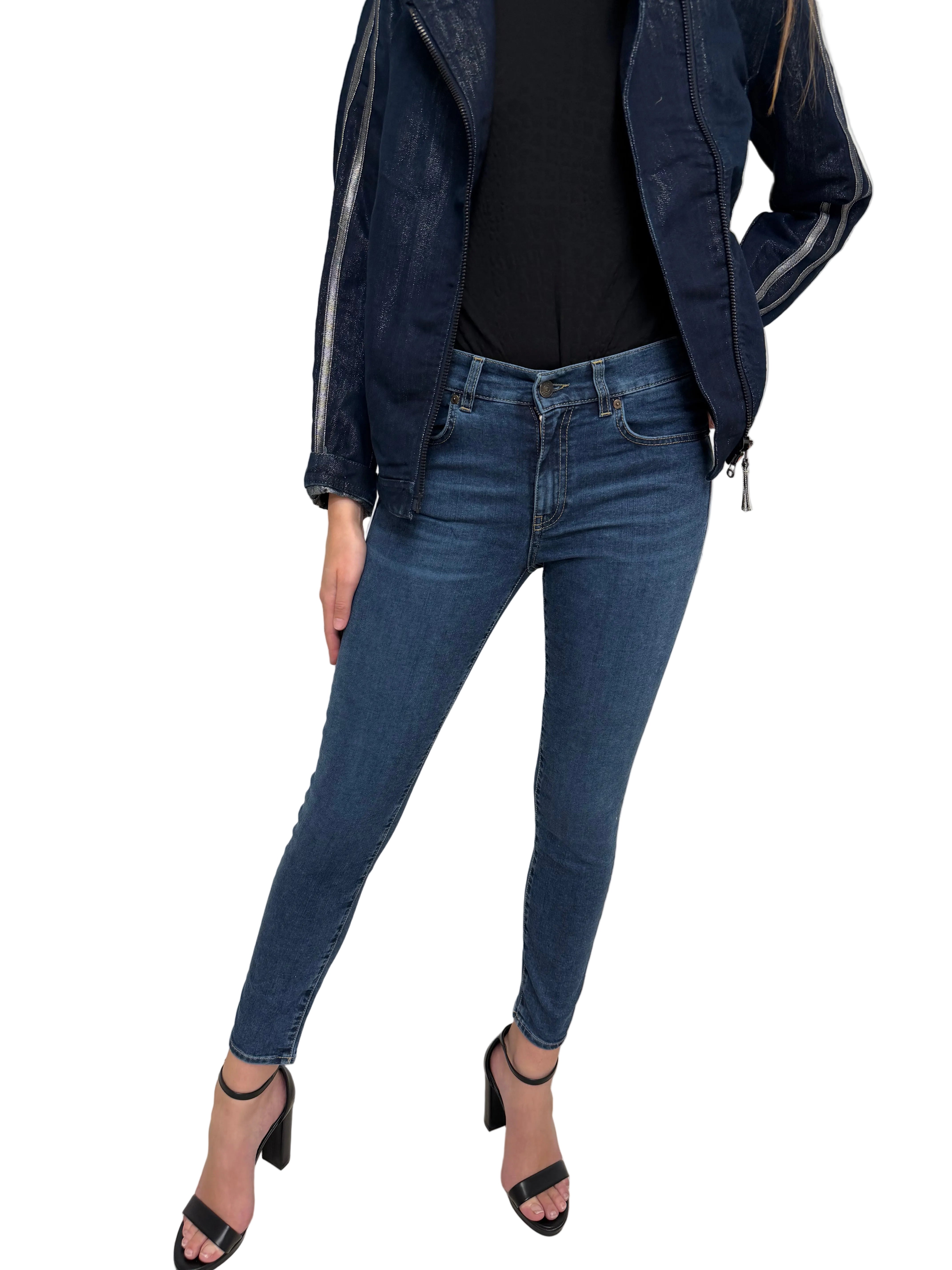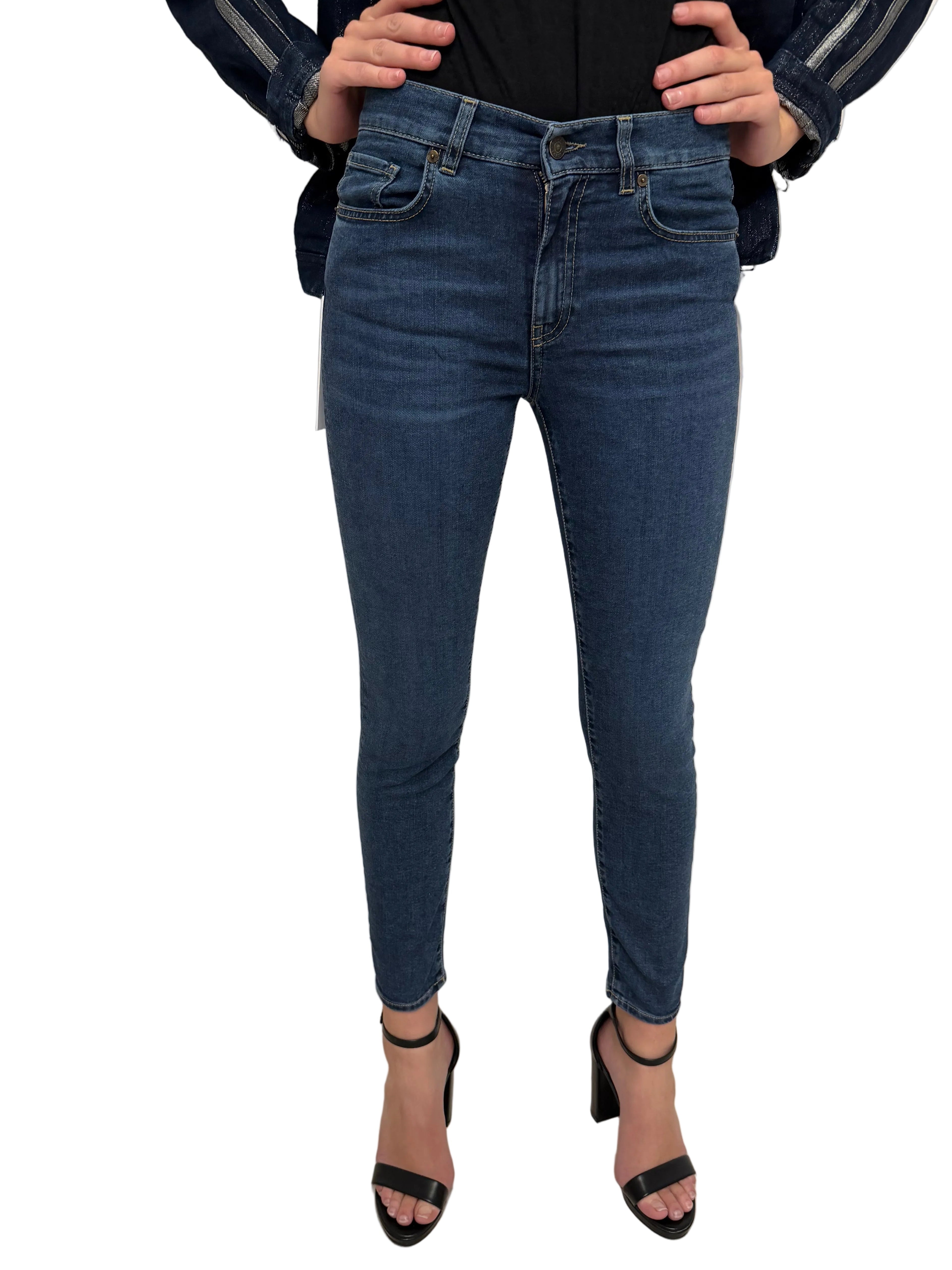 Questo jeans valorizza la silhouette grazie alla linea affusolata lungo la gamba e alla struttura modellante che segue le forme senza costringere. Il lavaggio denim blue medio lo rende versatile e perfetto sia per outfit casual che per look più eleganti con tacchi o blazer.