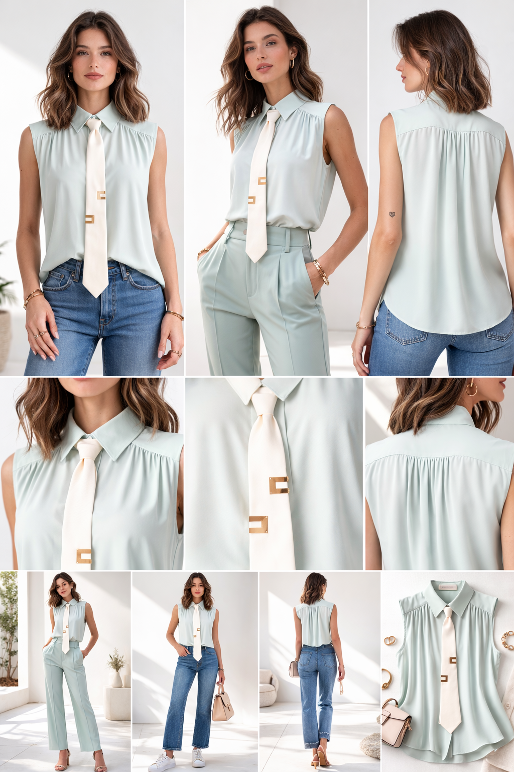 Elemento distintivo è la cravatta in contrasto removibile, che permette di trasformare il look in pochi gesti: più formale con la cravatta, essenziale e minimal senza.