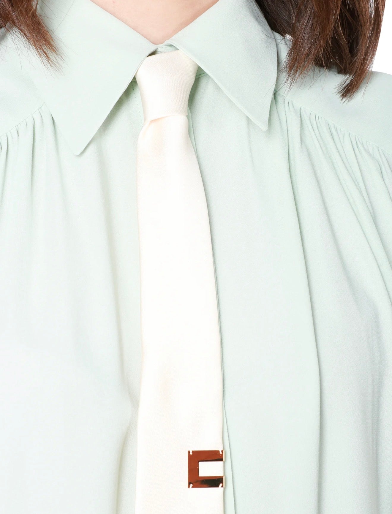 Camicia collo Francia in georgette di viscosa con arricciature sulle spalle. È caratterizzata da cravatta in twill impreziosito da placche logo in metallo dorato.