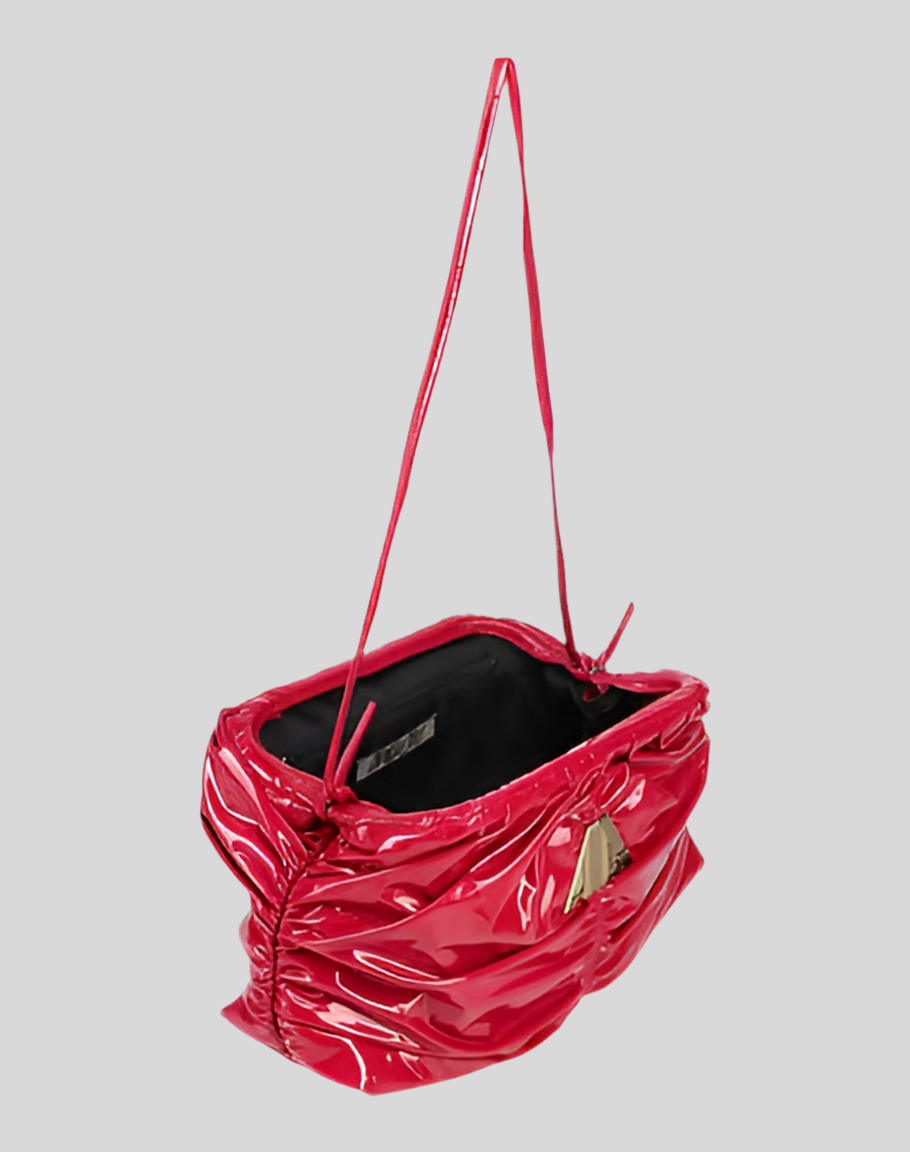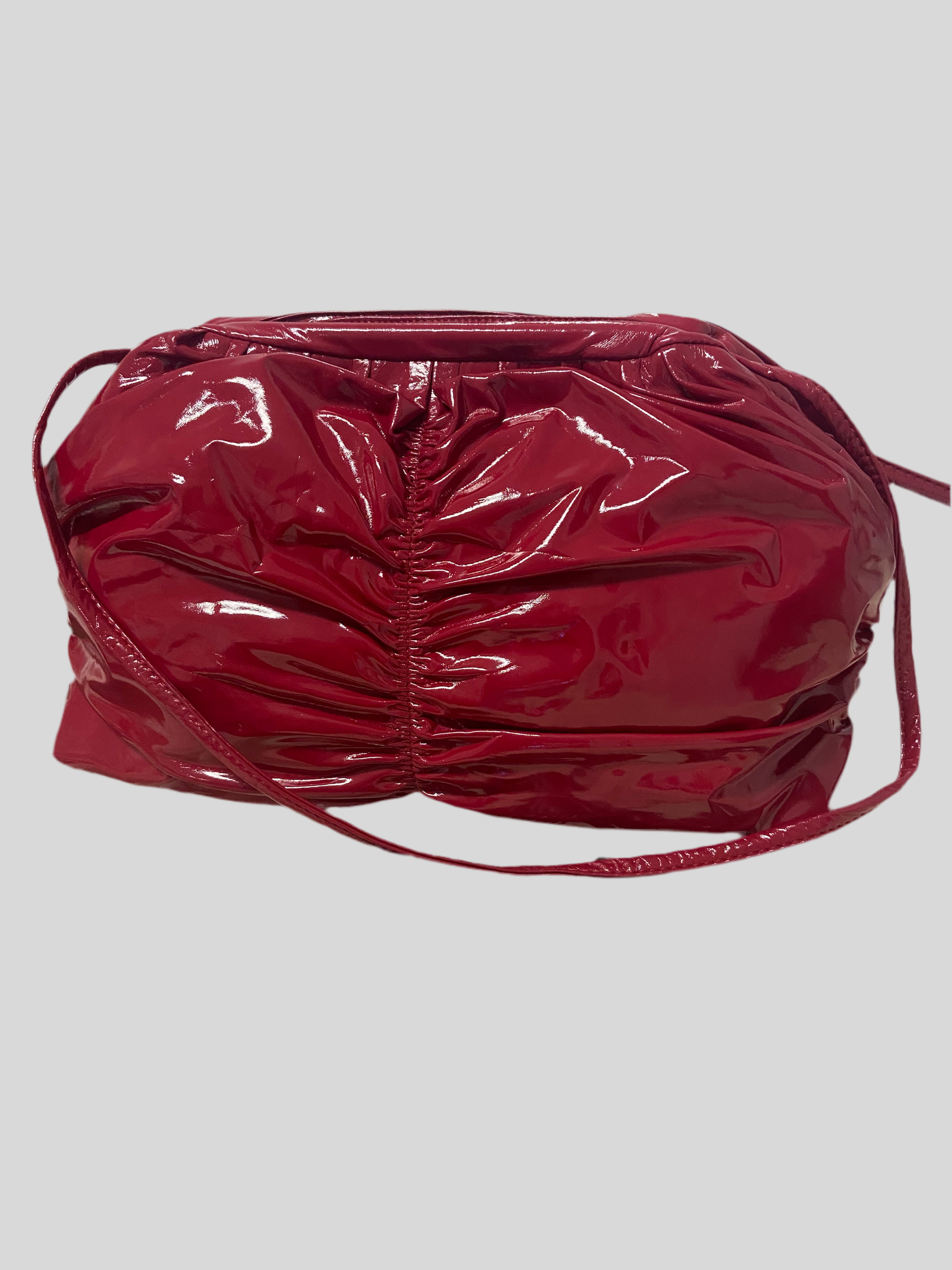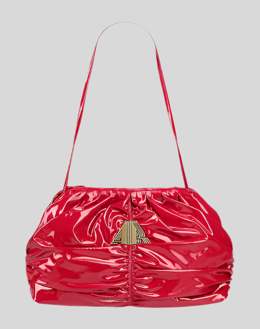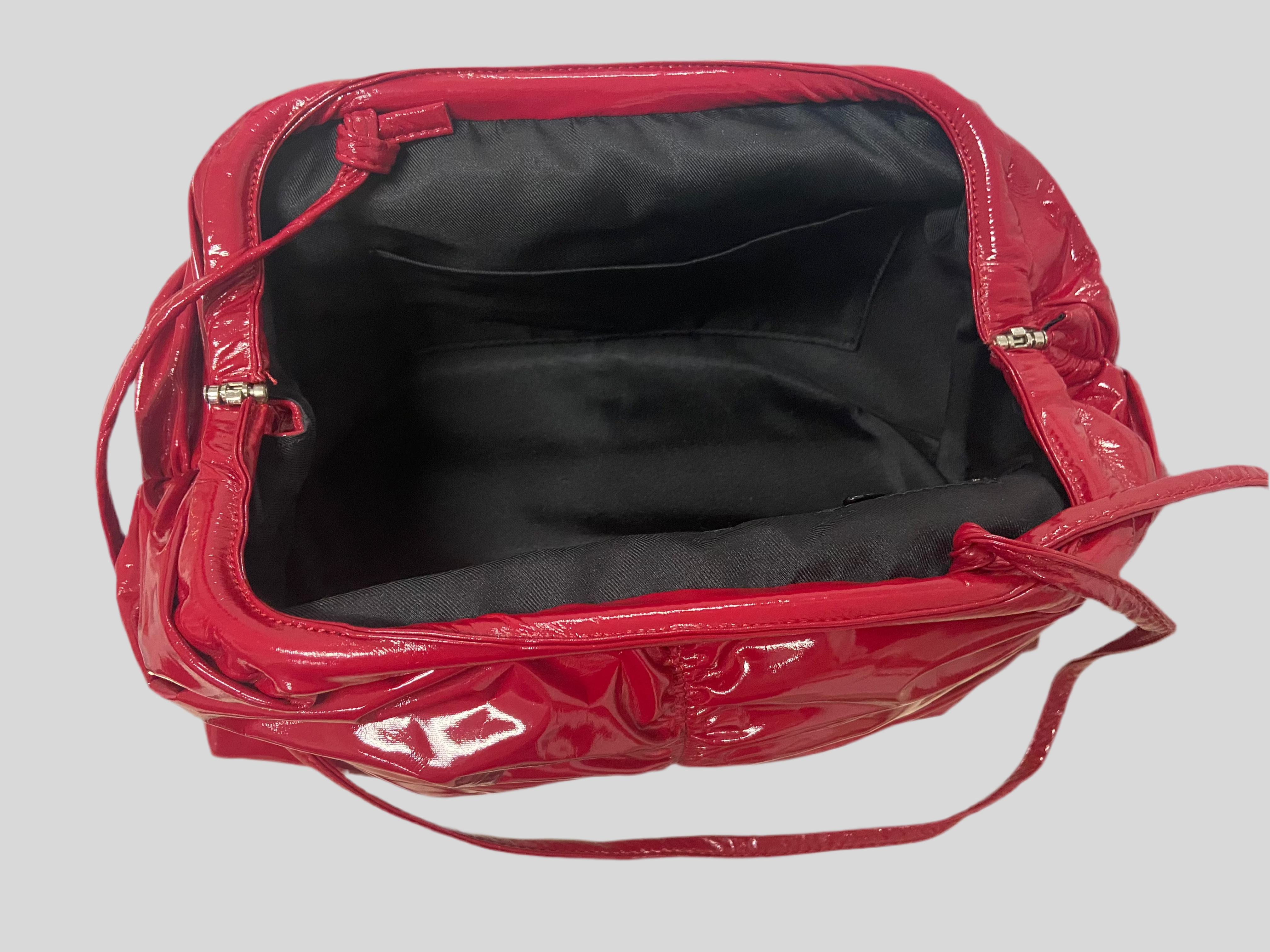 Handbag in tessuto spalmato, pieghe, brand logo, tinta unita, interno foderato, chiusura a scatto, tasca interna con zip e tracolla rimovibile.