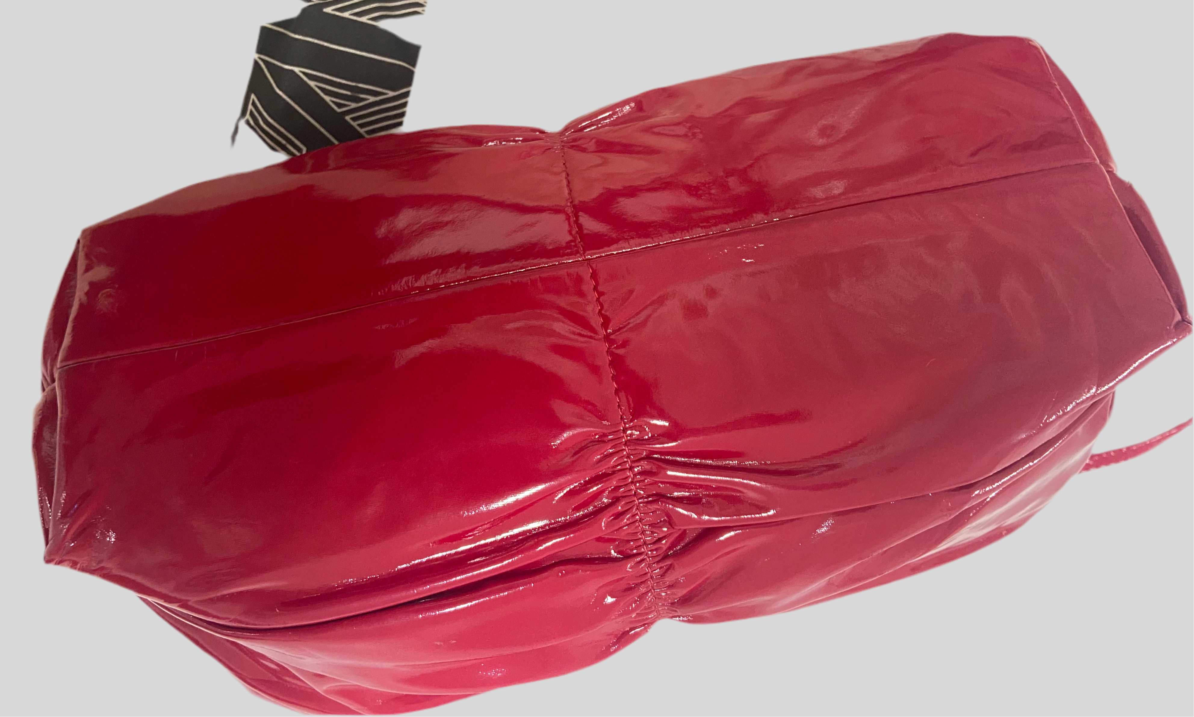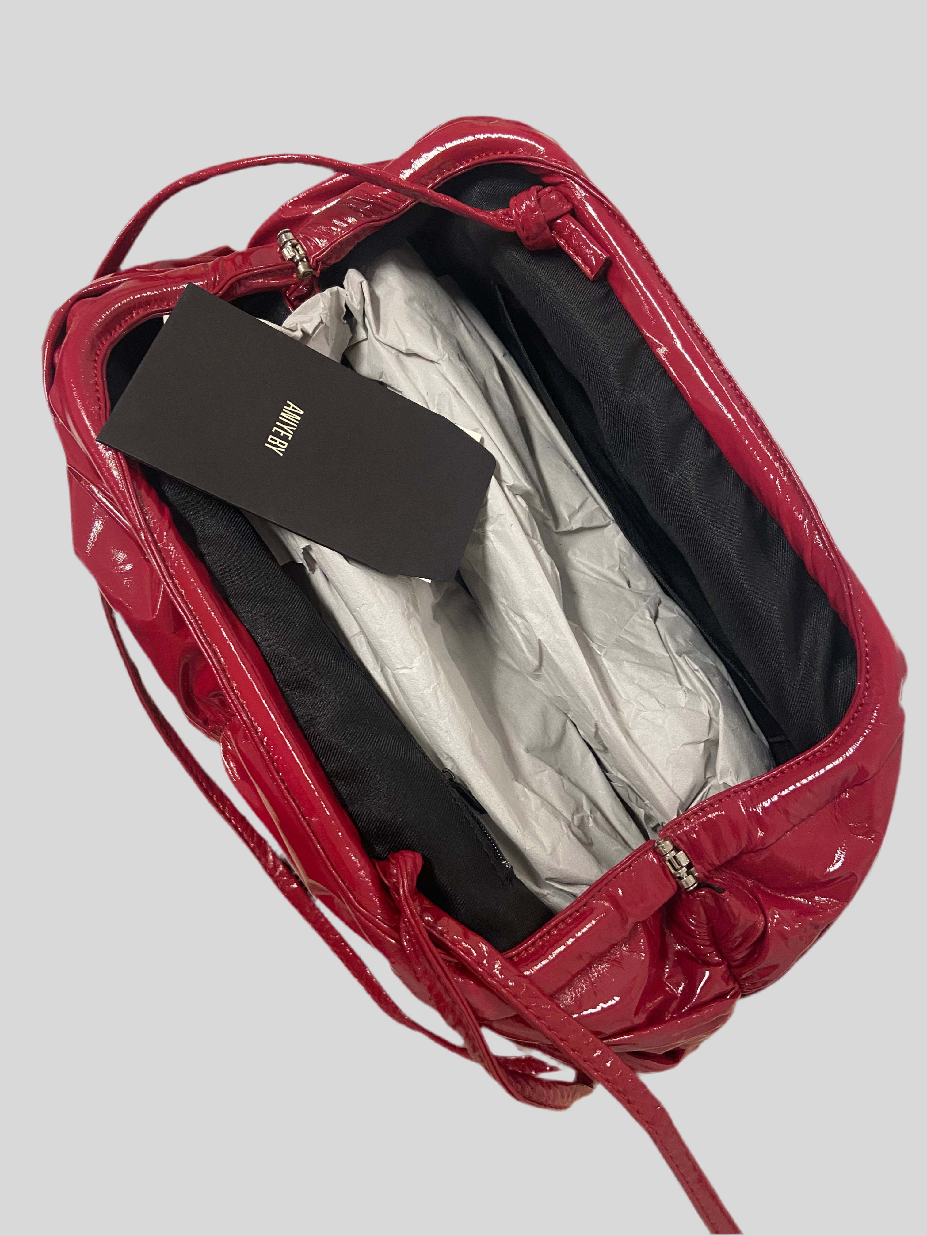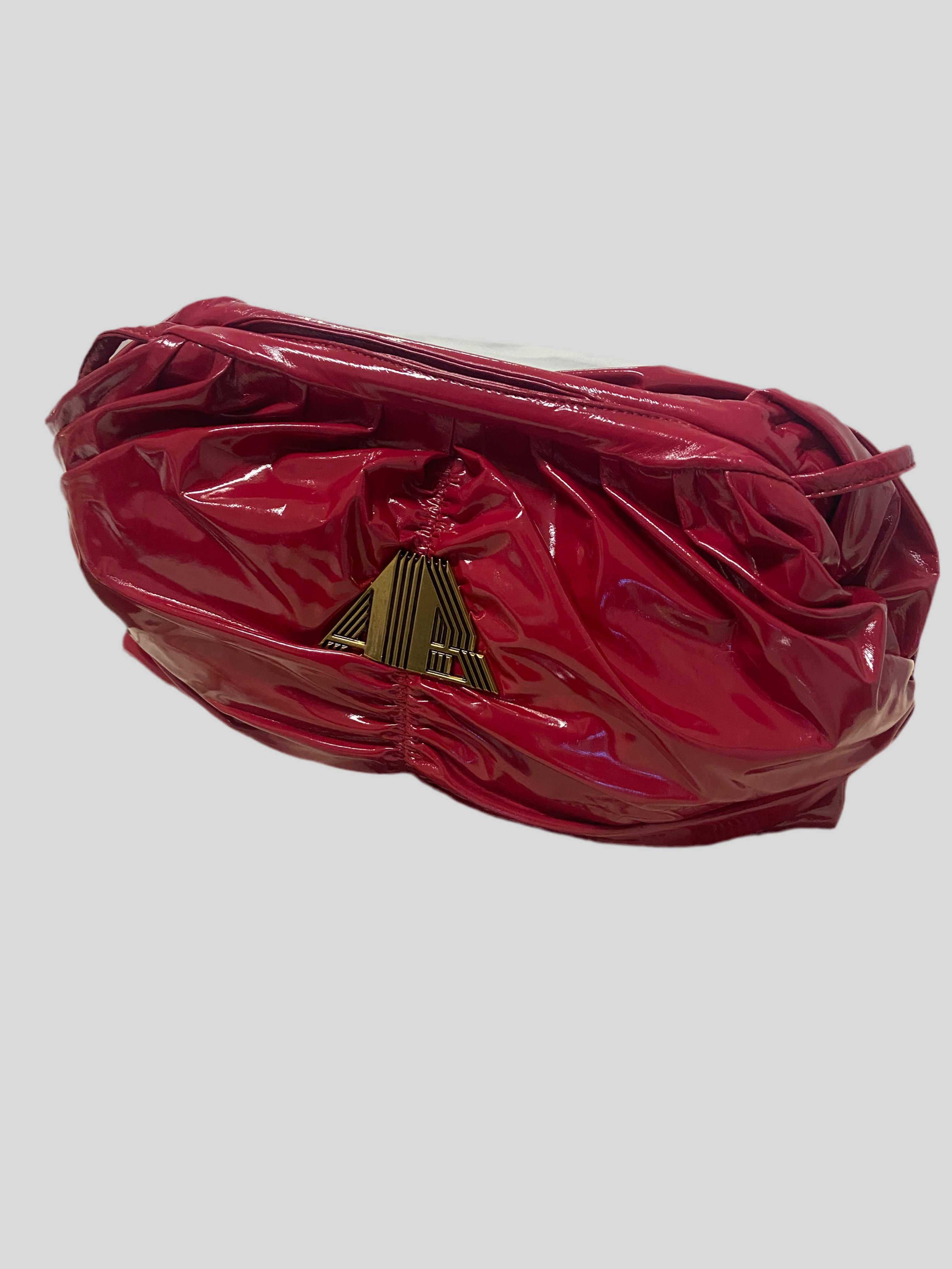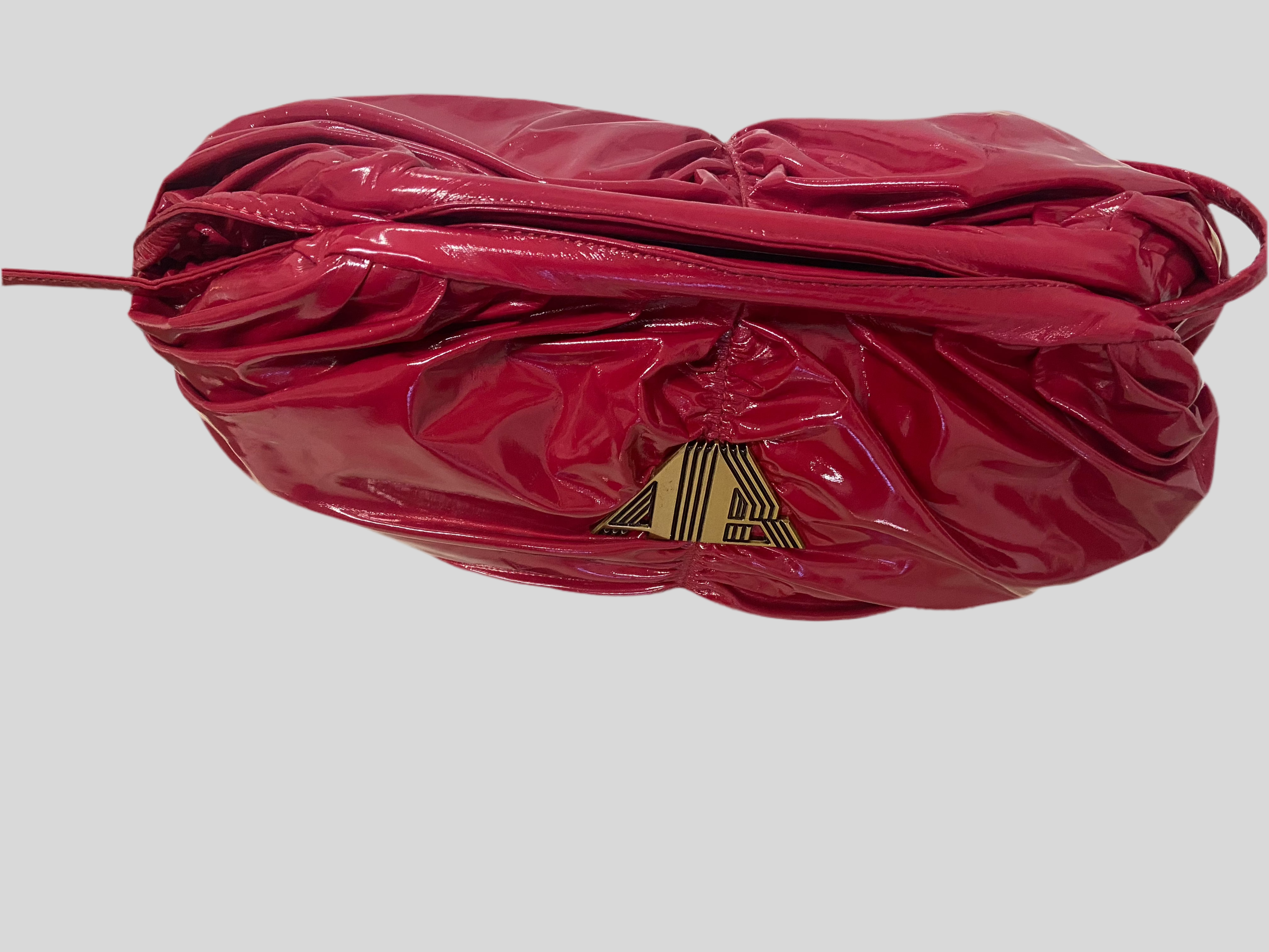 Handbag in tessuto spalmato, pieghe, brand logo, tinta unita, interno foderato, chiusura a scatto, tasca interna con zip e tracolla rimovibile.