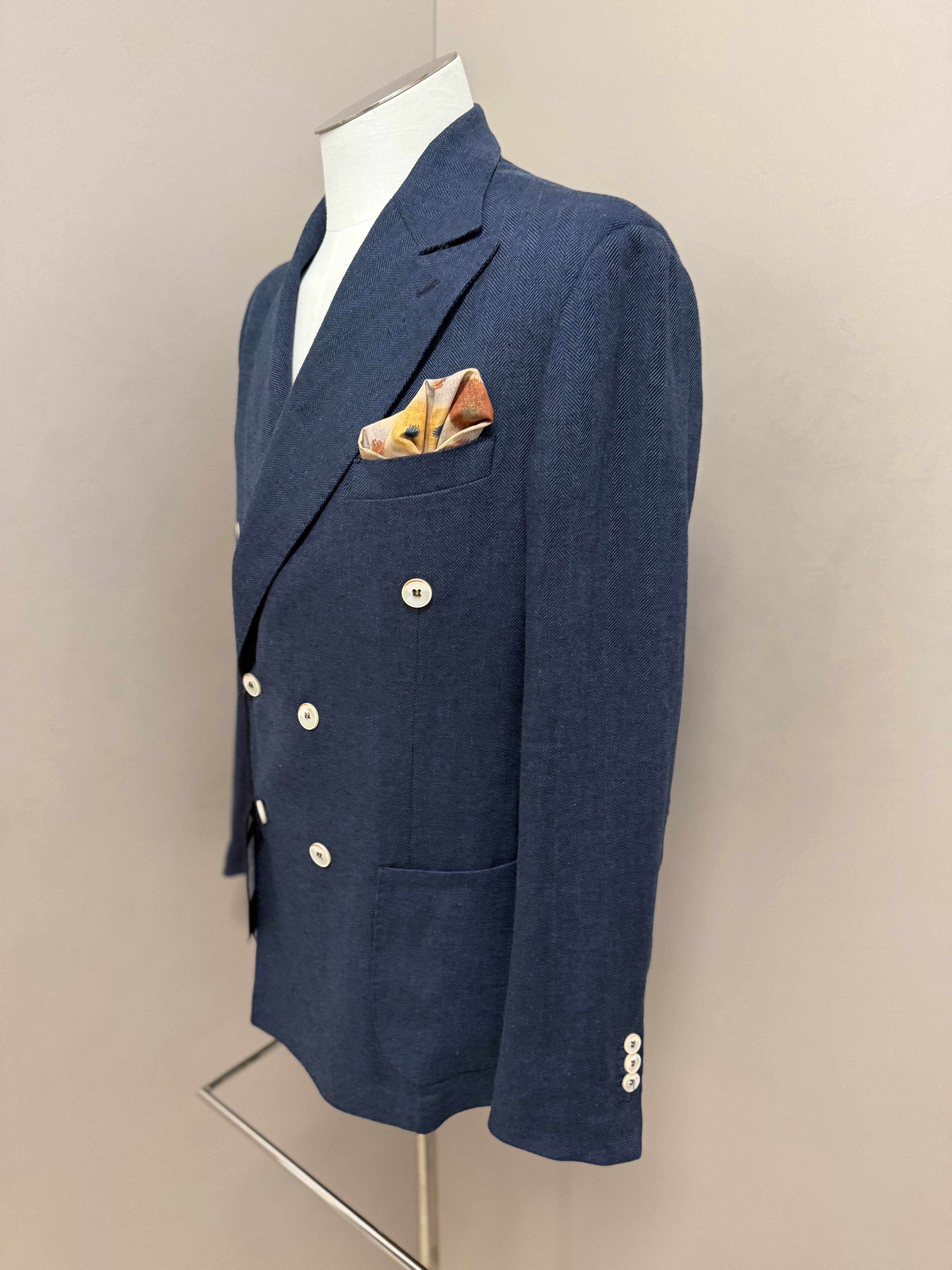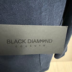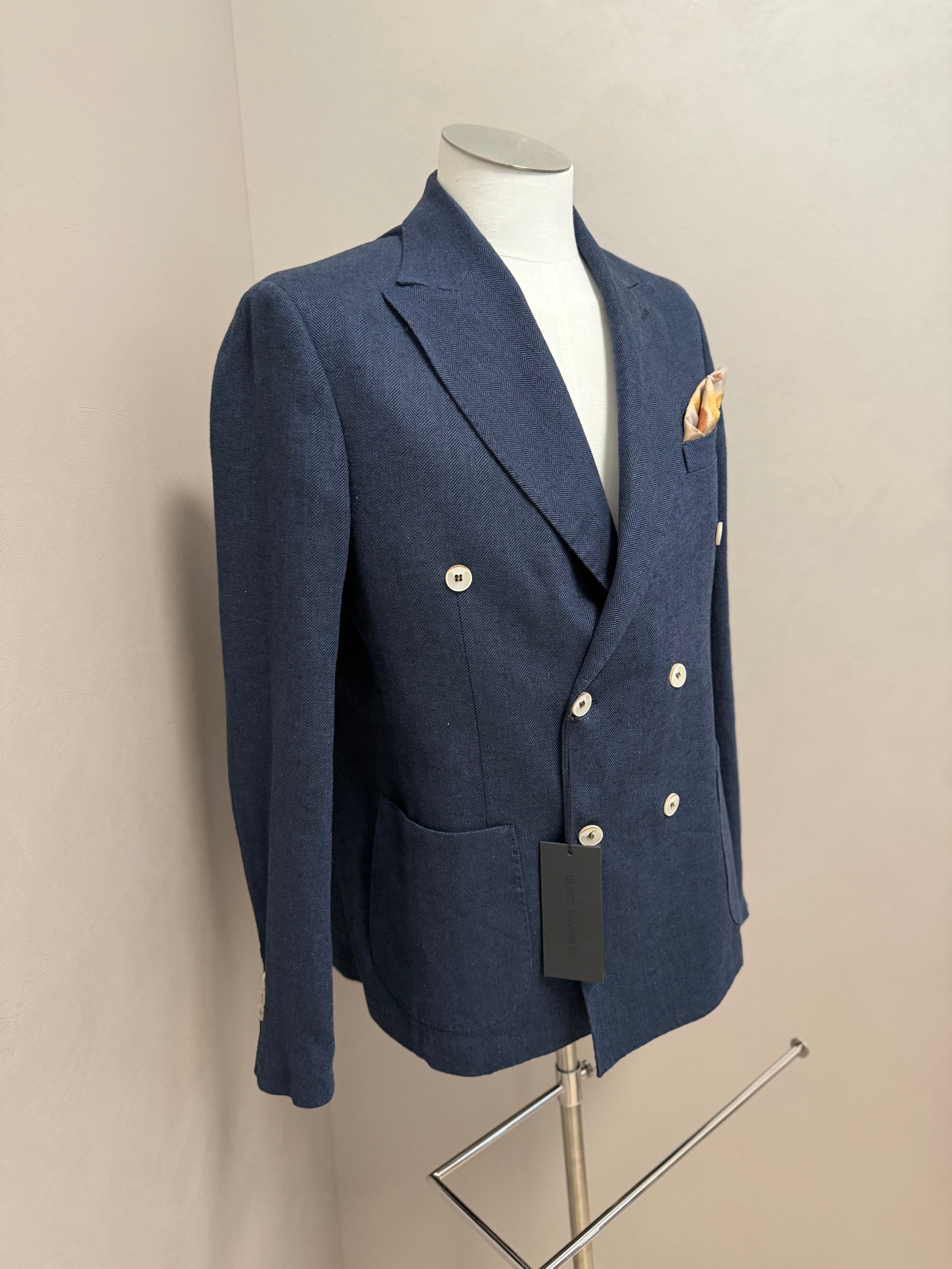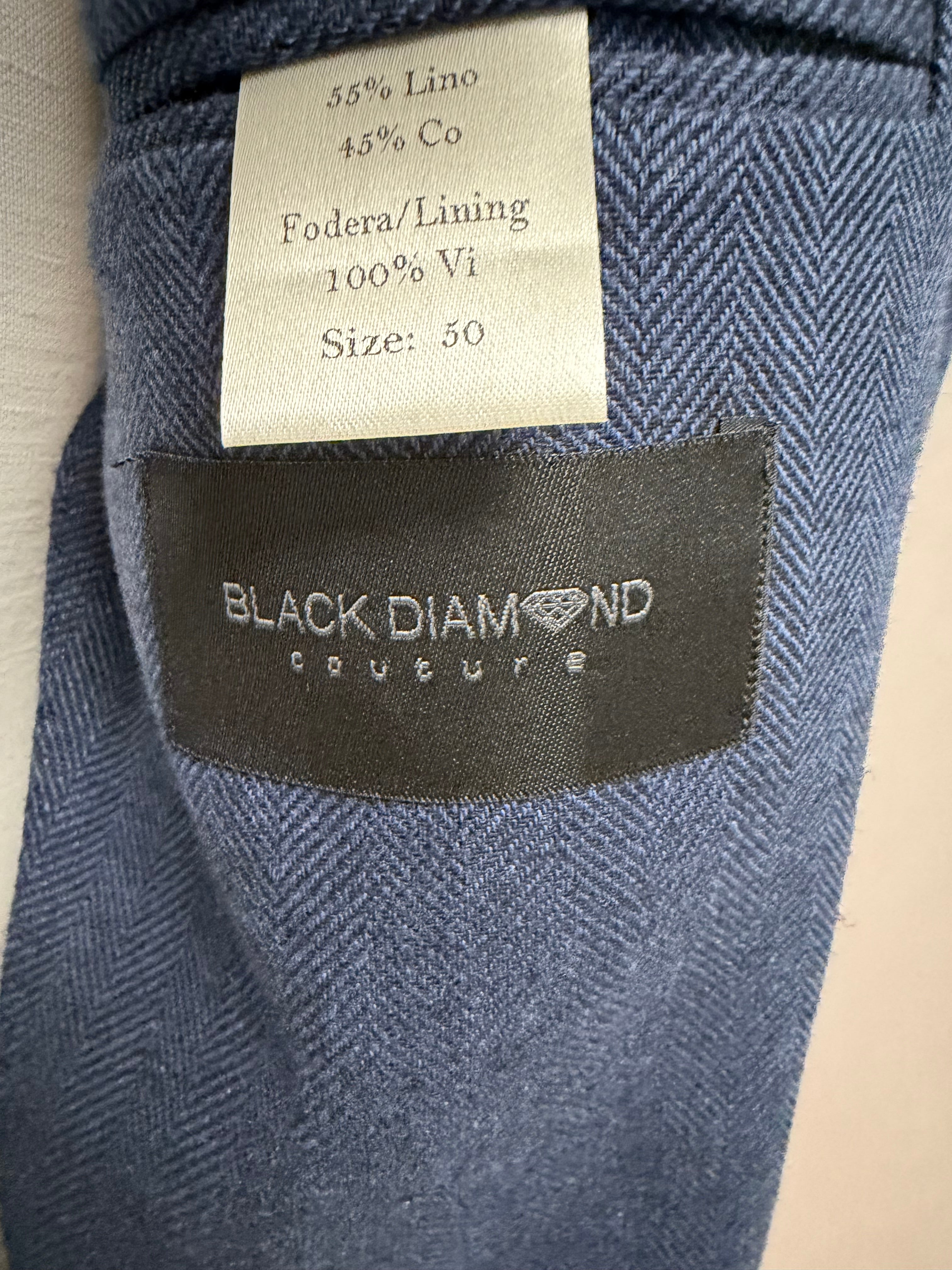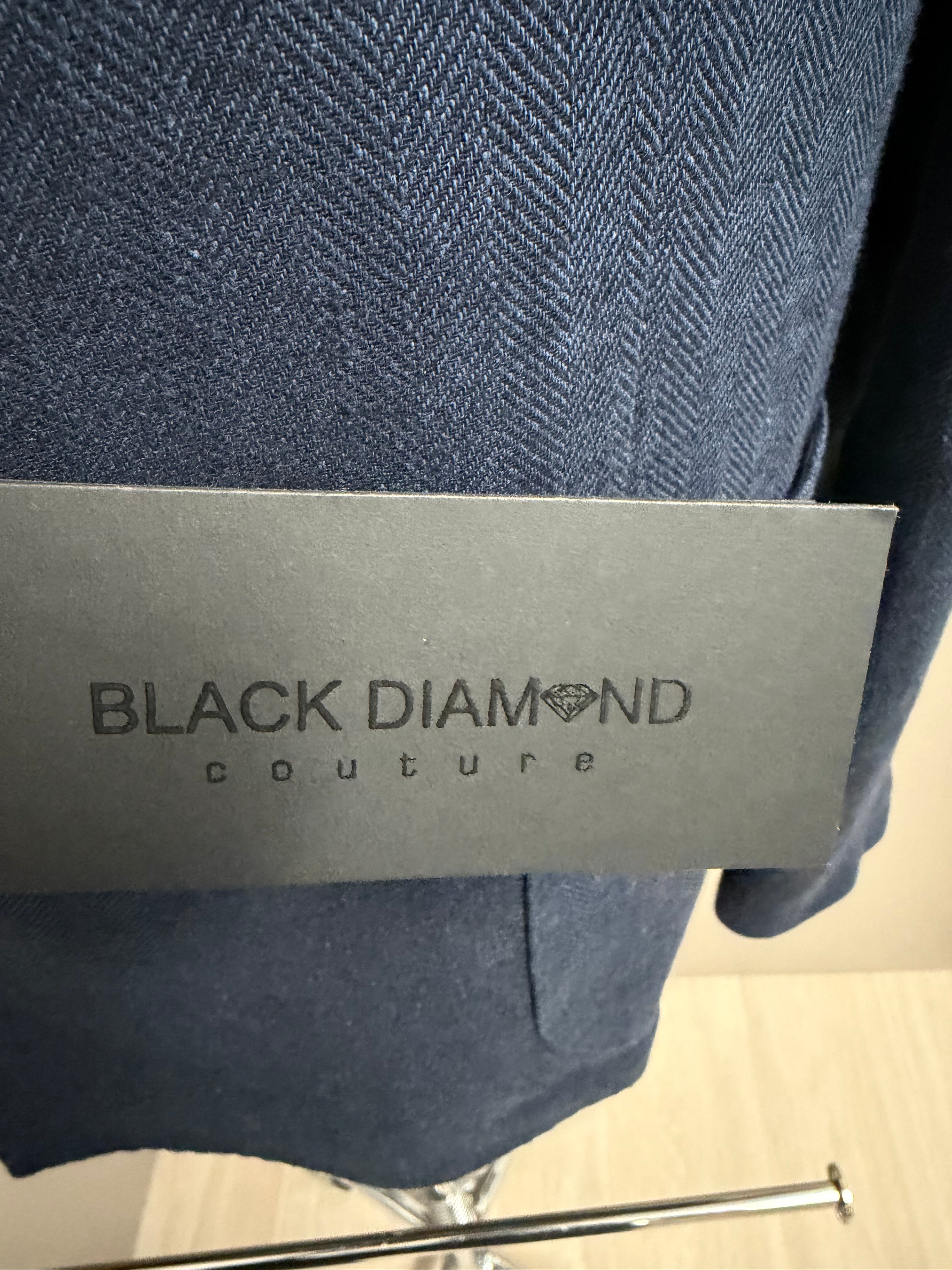 giacca doppiopetto firmata Black Diamond Couture. Caratterizzata da una classica trama herringbone (spina di pesce) in una versatile tonalità di blu, rappresenta l'equilibrio perfetto tra eleganza tradizionale e comfort moderno.