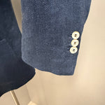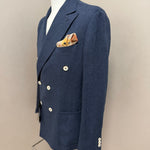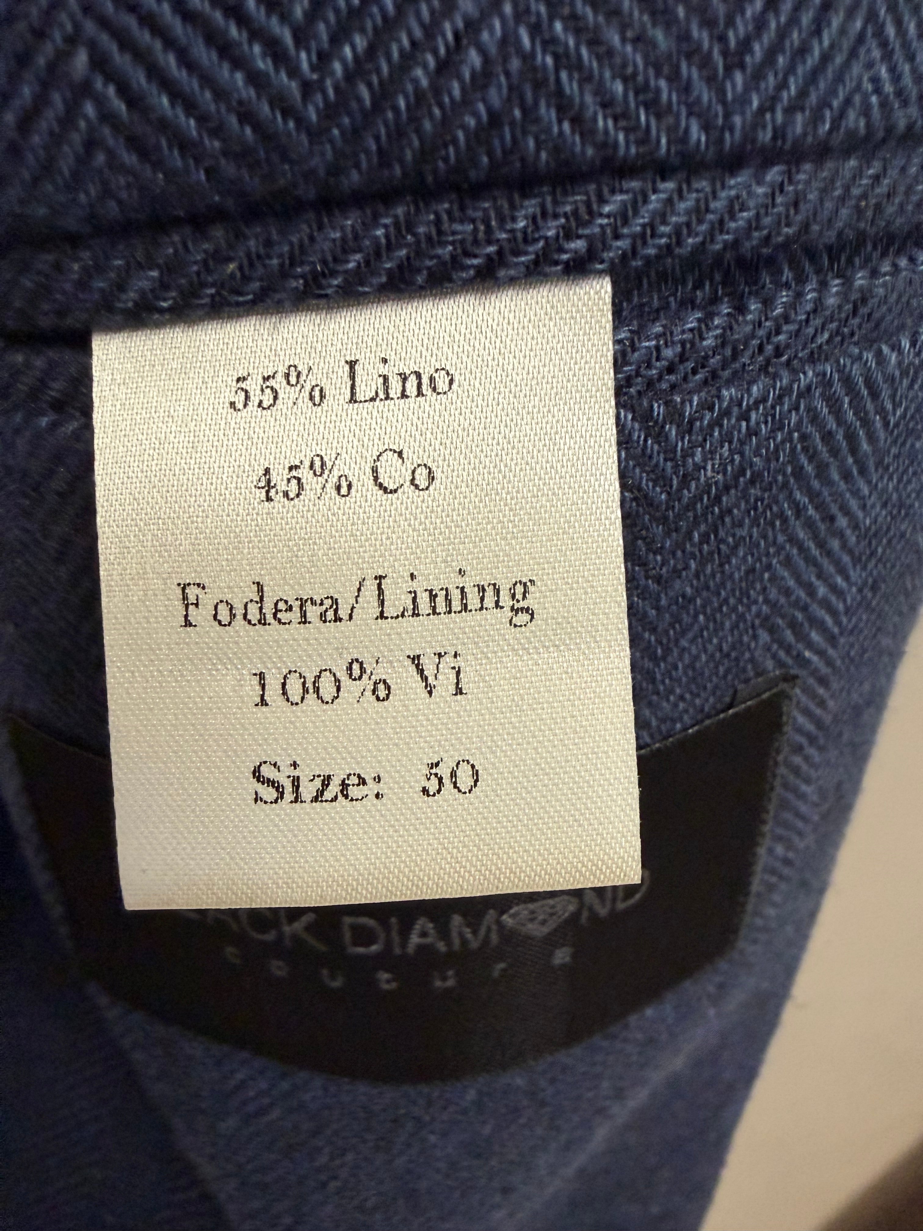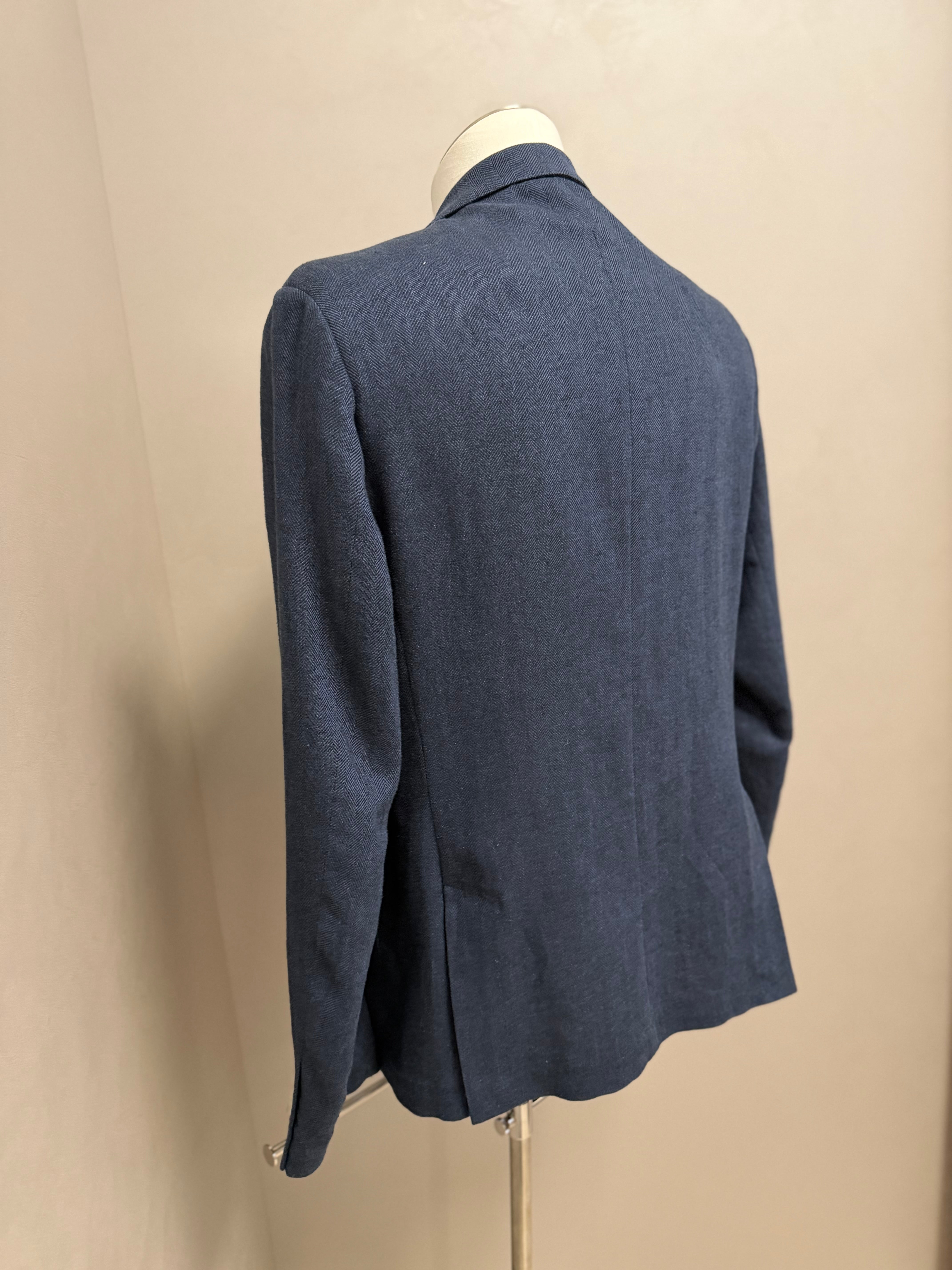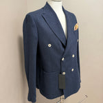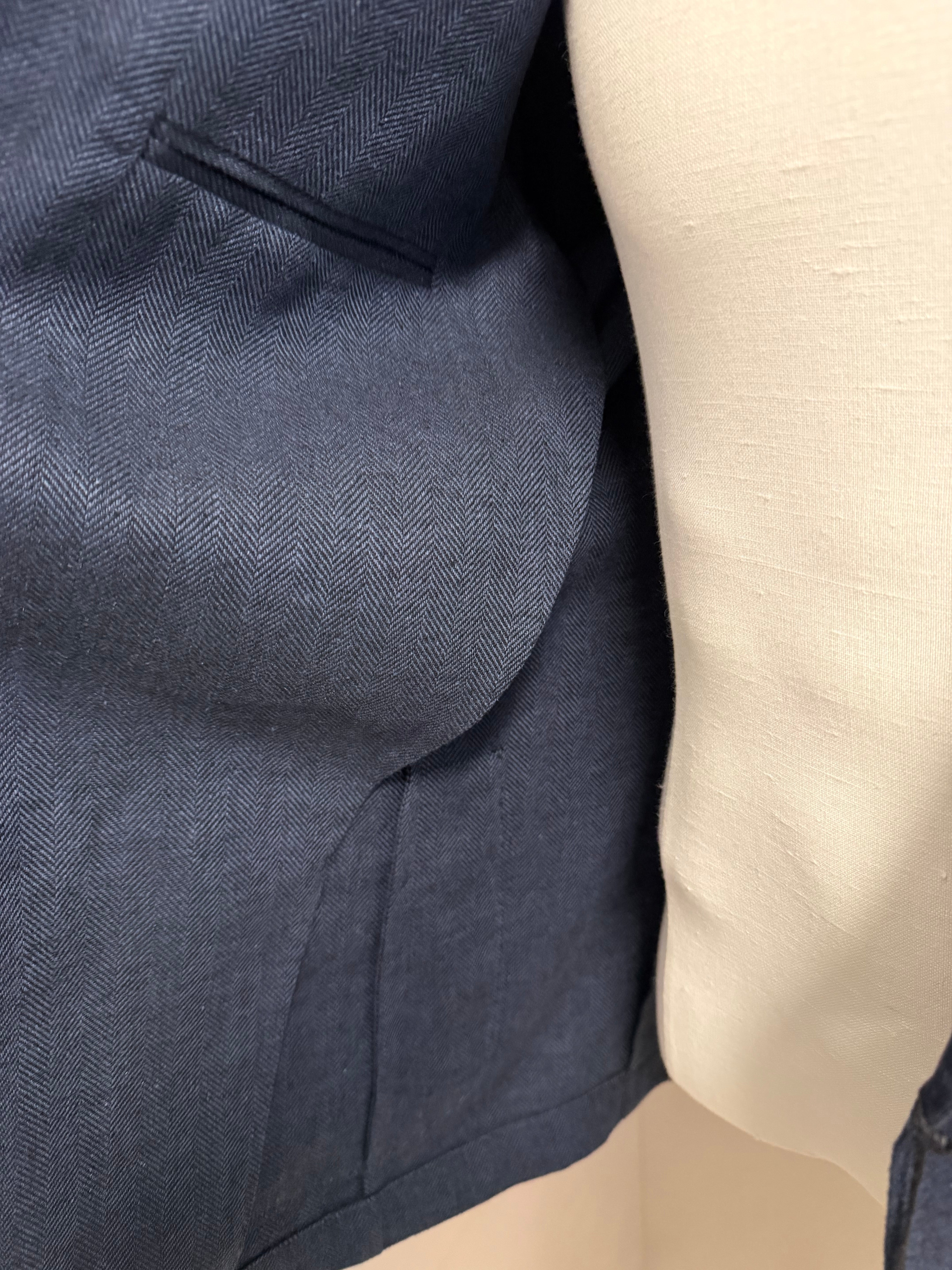 giacca doppiopetto firmata Black Diamond Couture. Caratterizzata da una classica trama herringbone (spina di pesce) in una versatile tonalità di blu, rappresenta l'equilibrio perfetto tra eleganza tradizionale e comfort moderno.