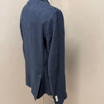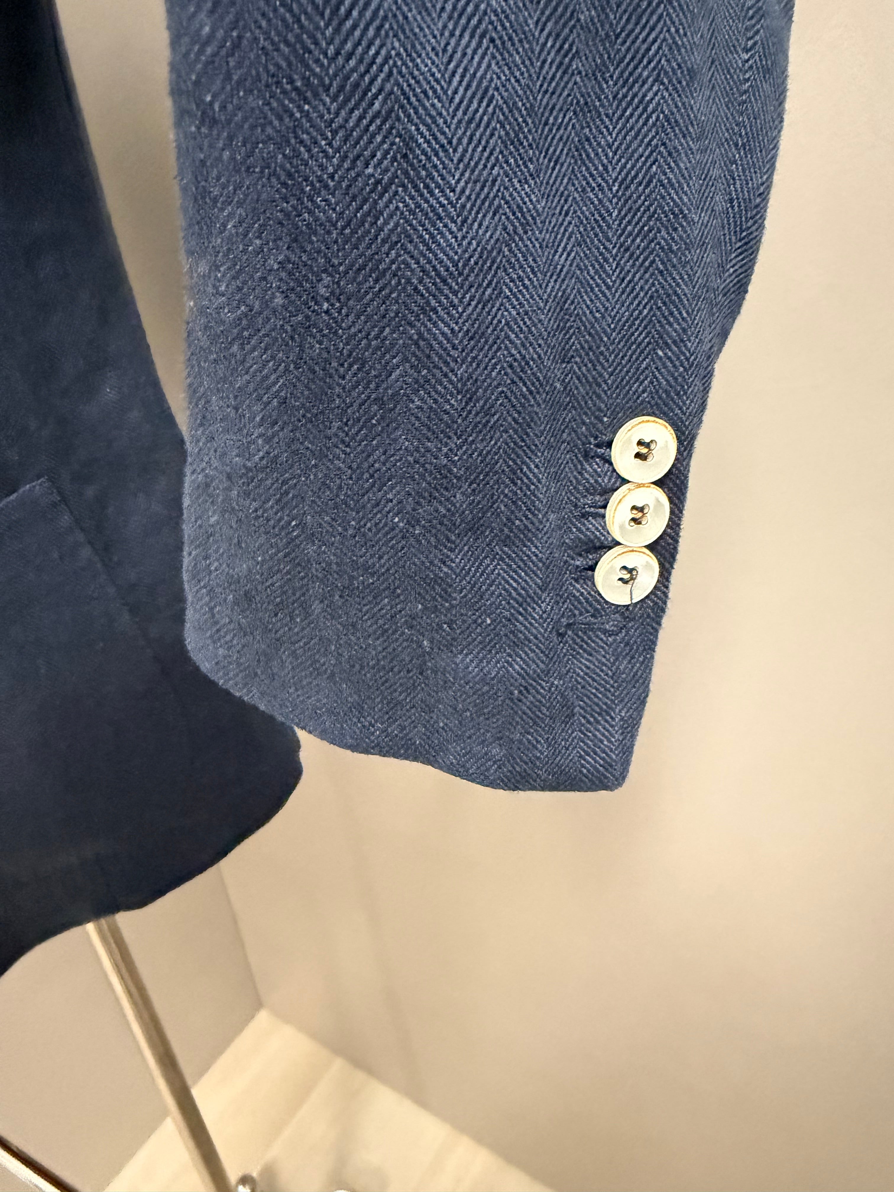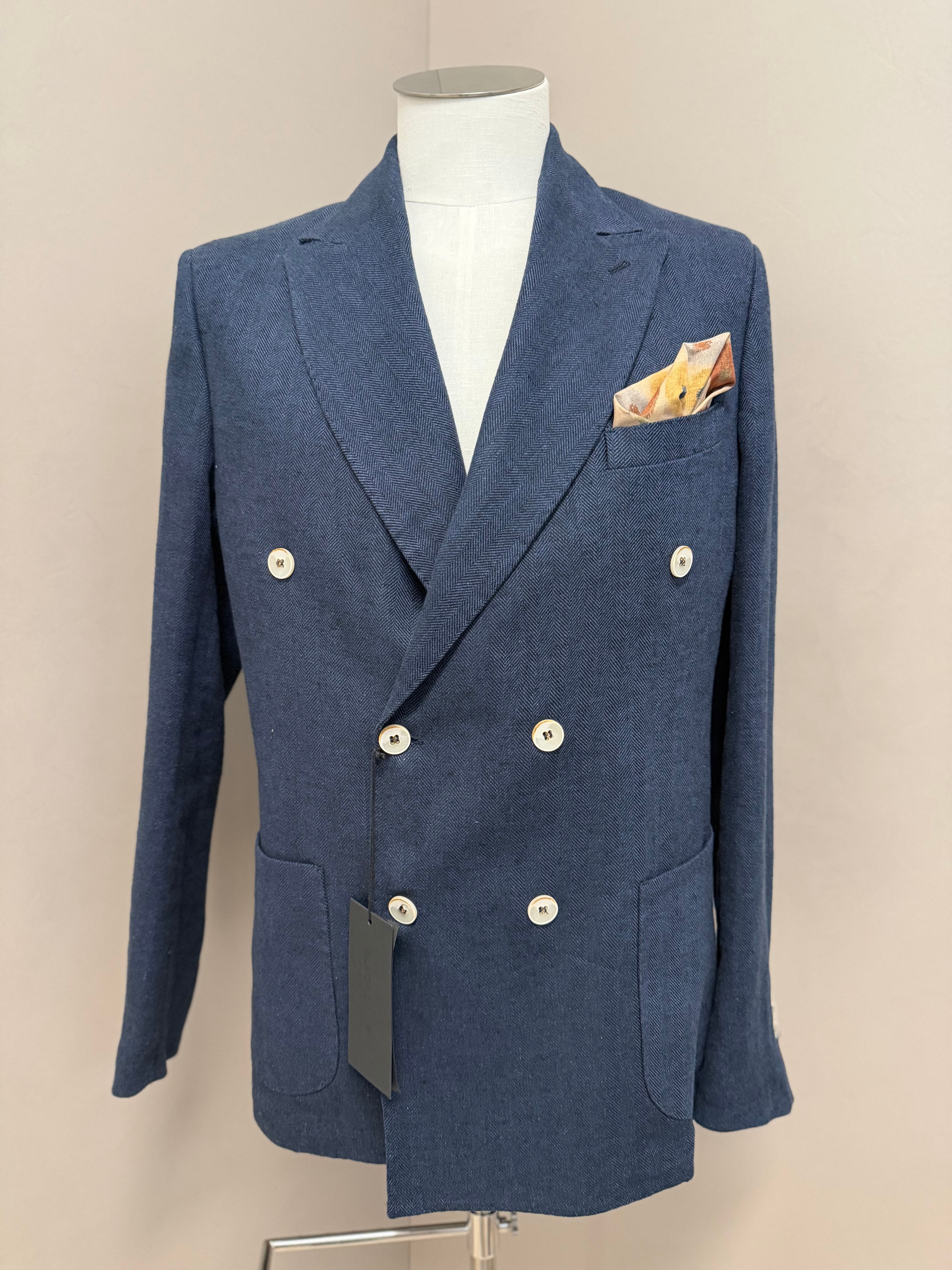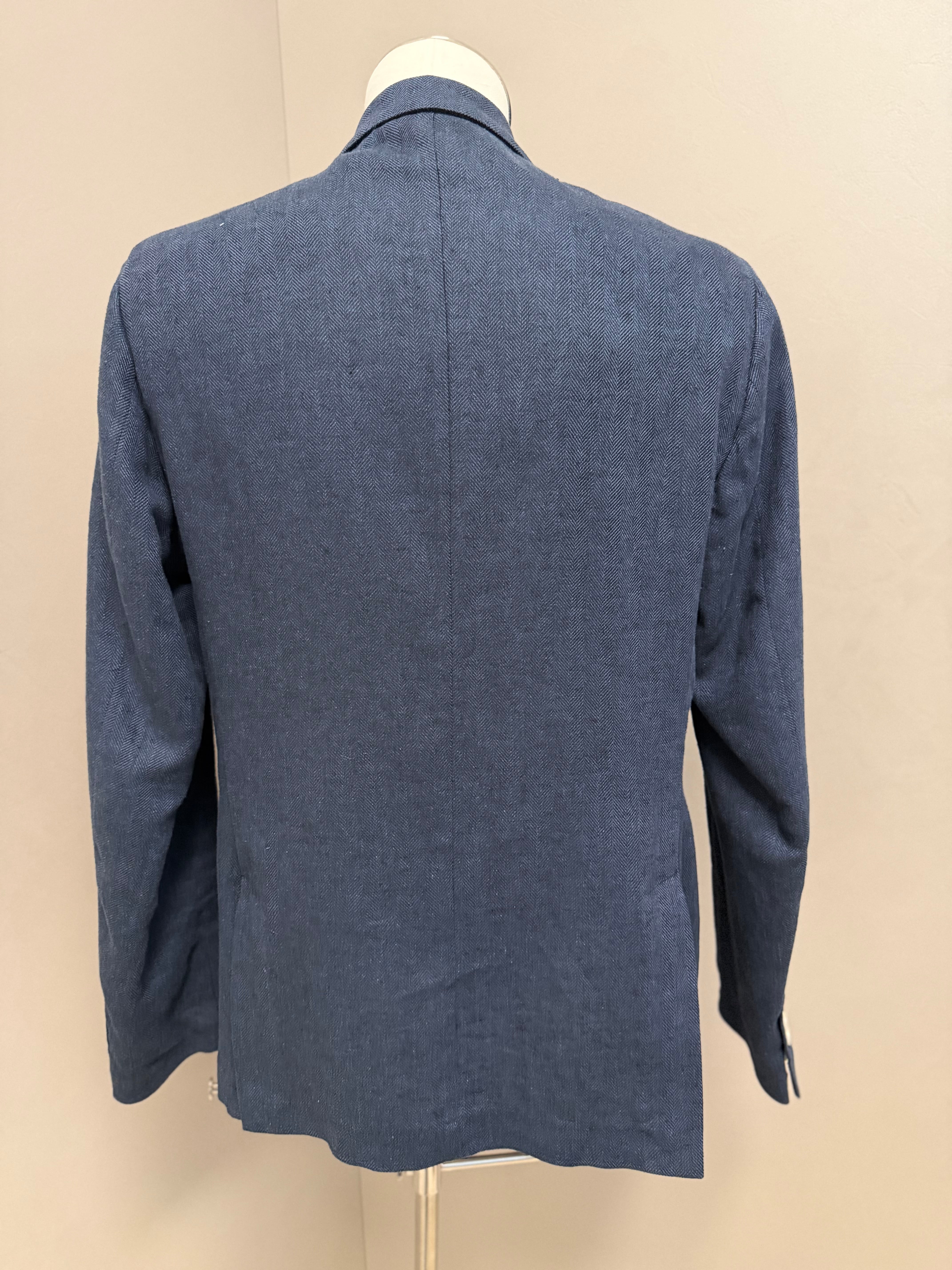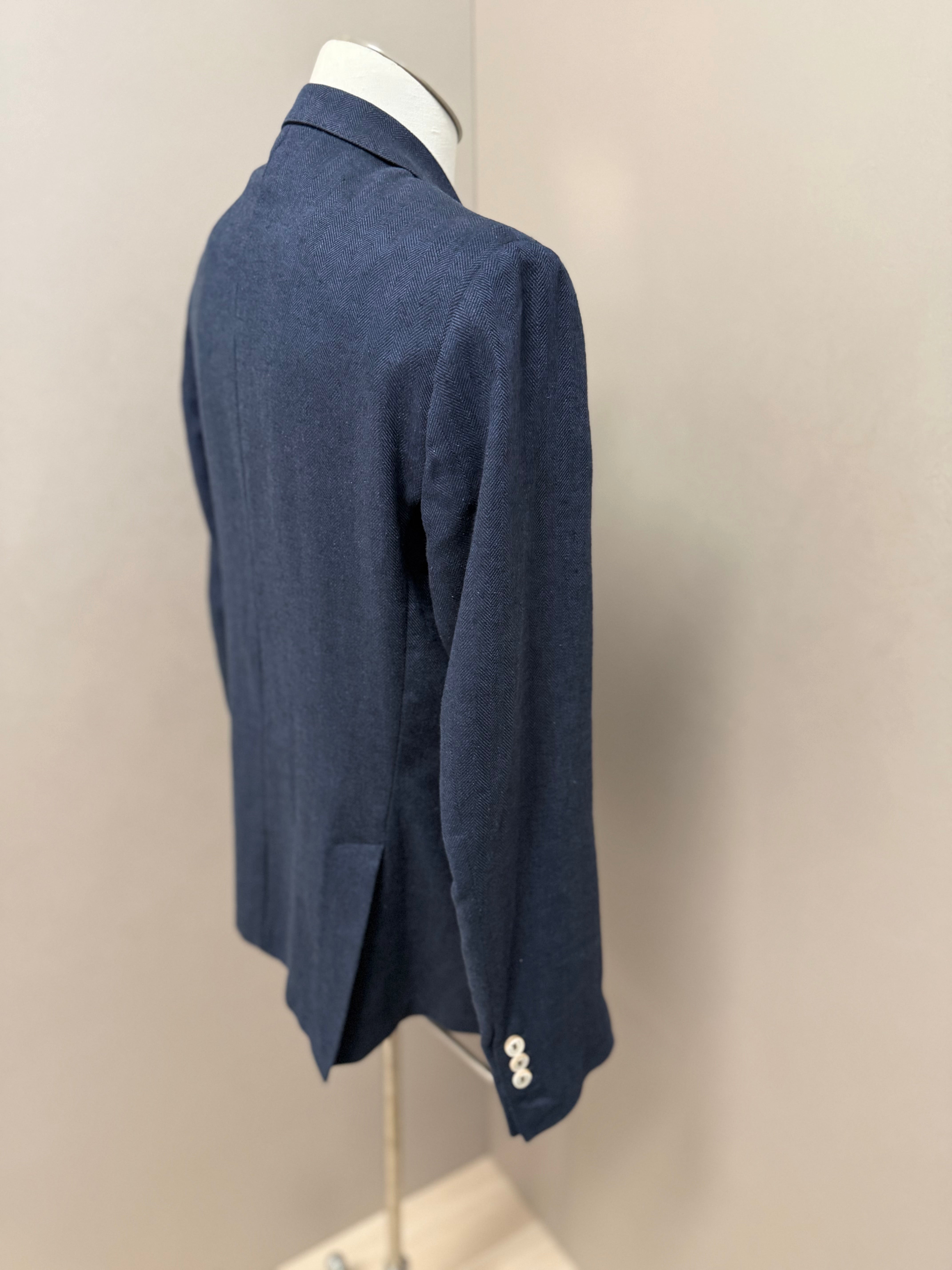 giacca doppiopetto firmata Black Diamond Couture. Caratterizzata da una classica trama herringbone (spina di pesce) in una versatile tonalità di blu, rappresenta l'equilibrio perfetto tra eleganza tradizionale e comfort moderno.