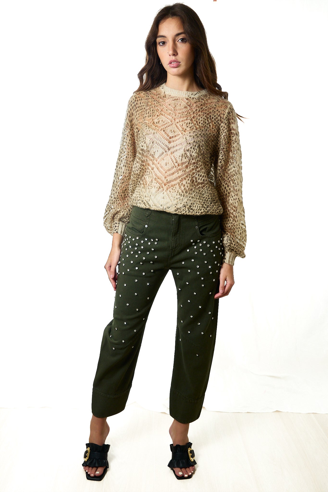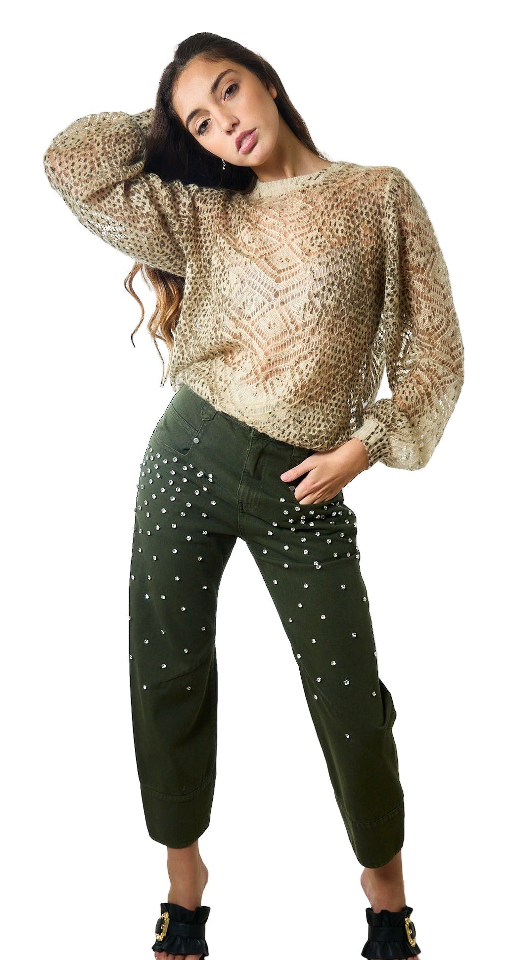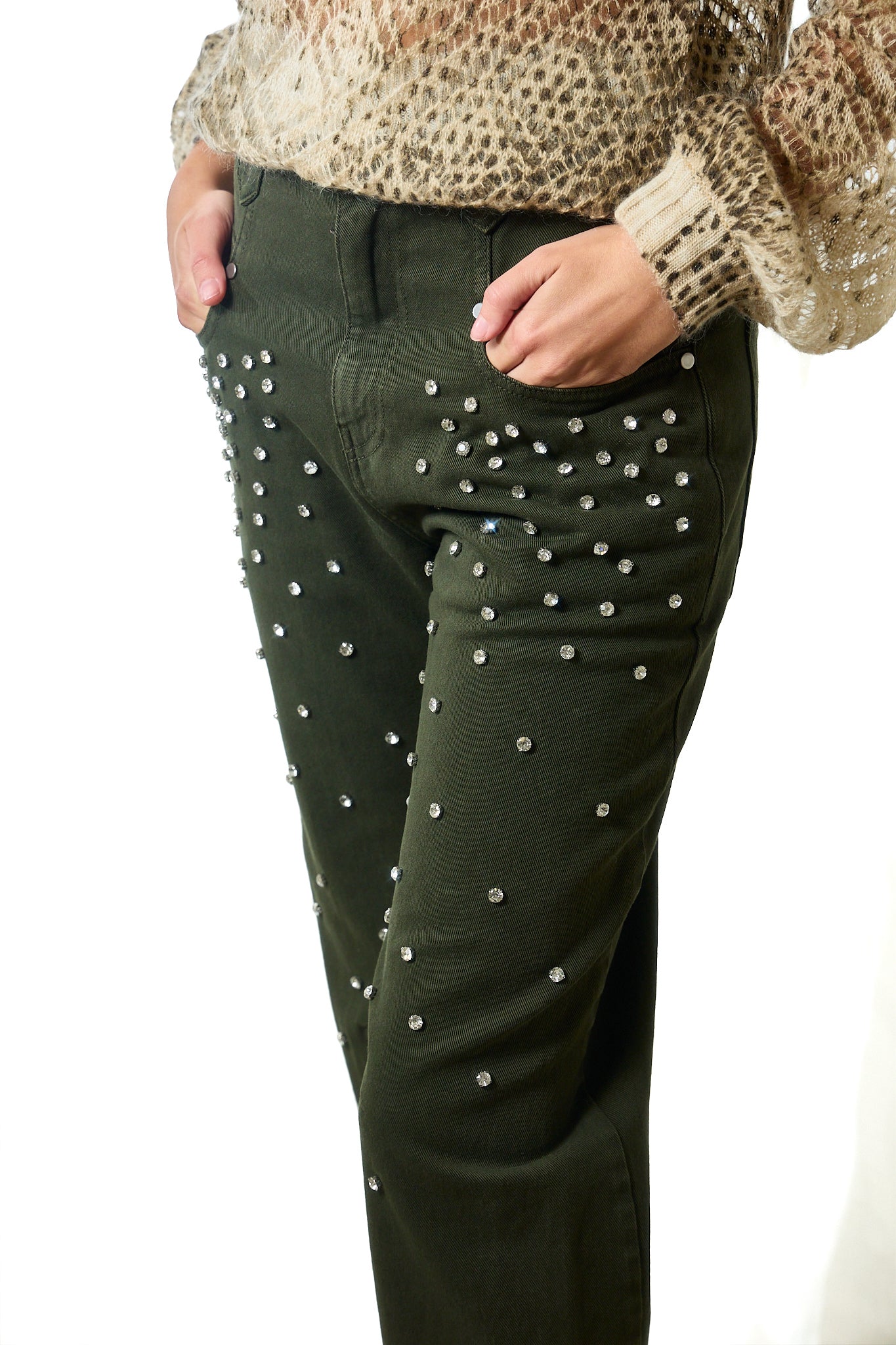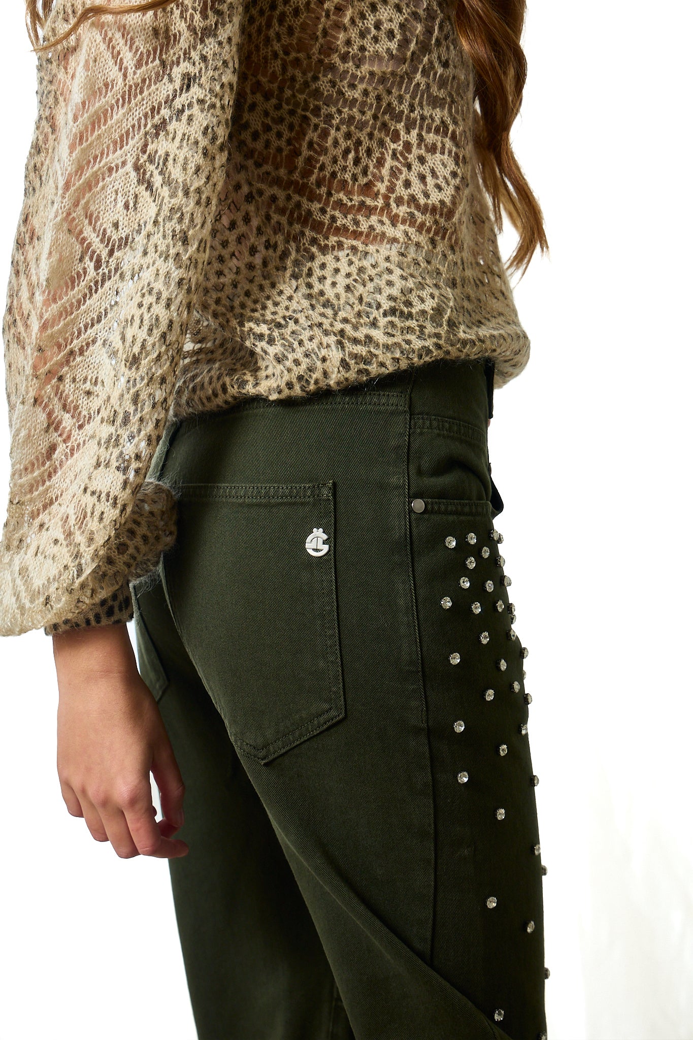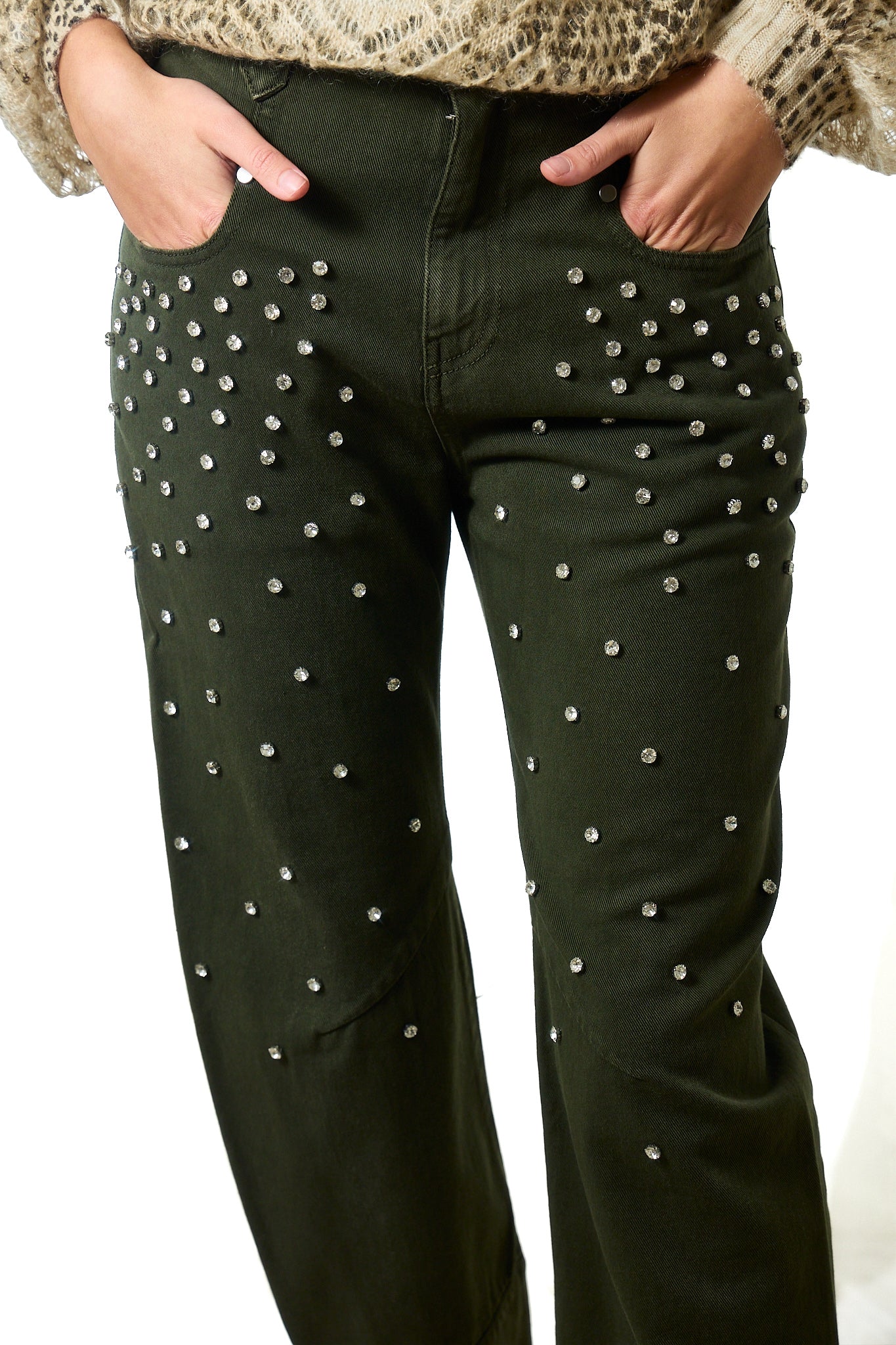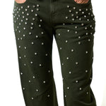 Il design affusolato valorizza la silhouette, mentre il lavaggio colorato e i dettagli con cristalli donano un tocco luminoso e distintivo. La vita alta con passanti, la chiusura con zip e bottone e la vestibilità regular fit assicurano comfort e versatilità.