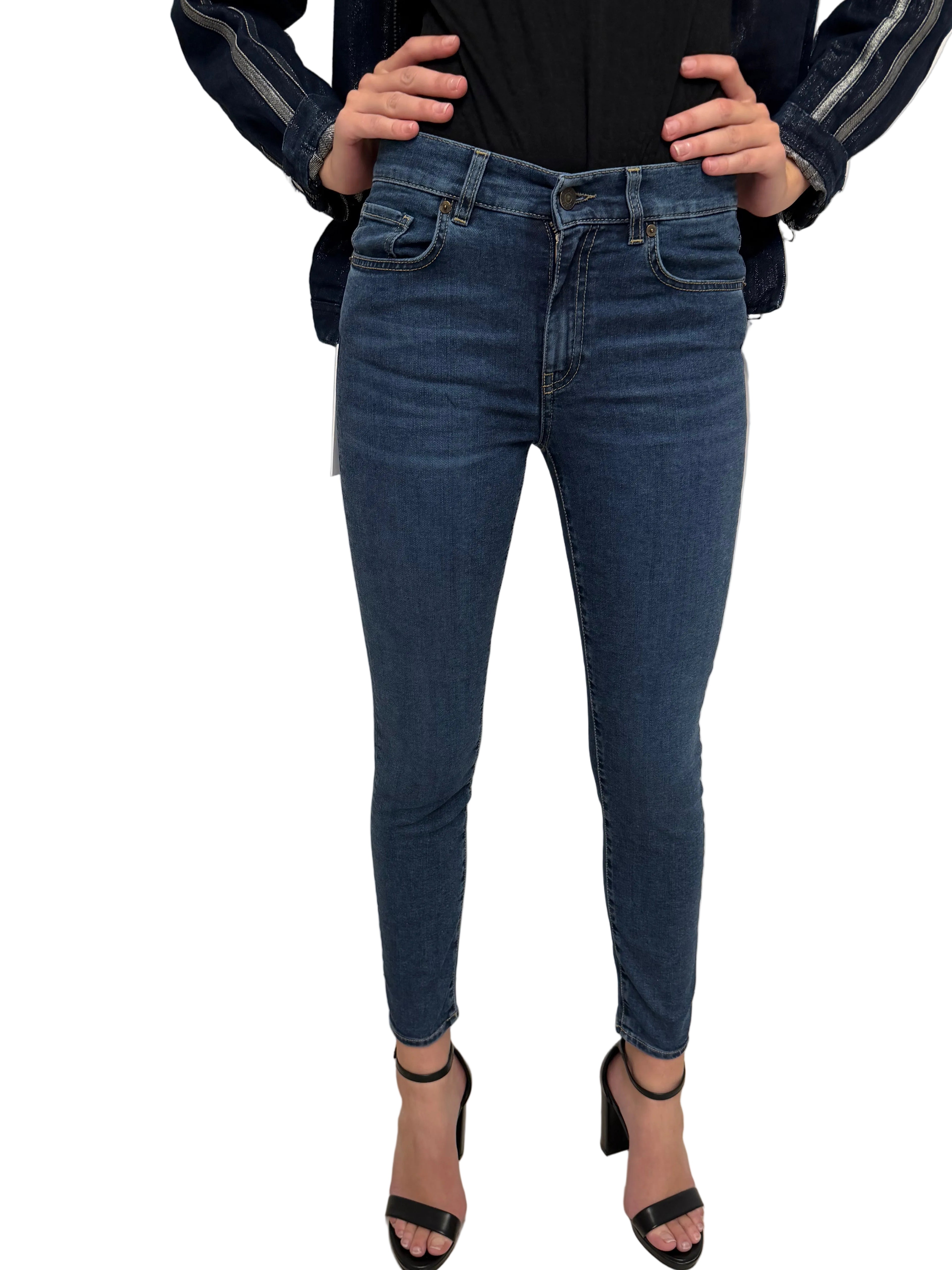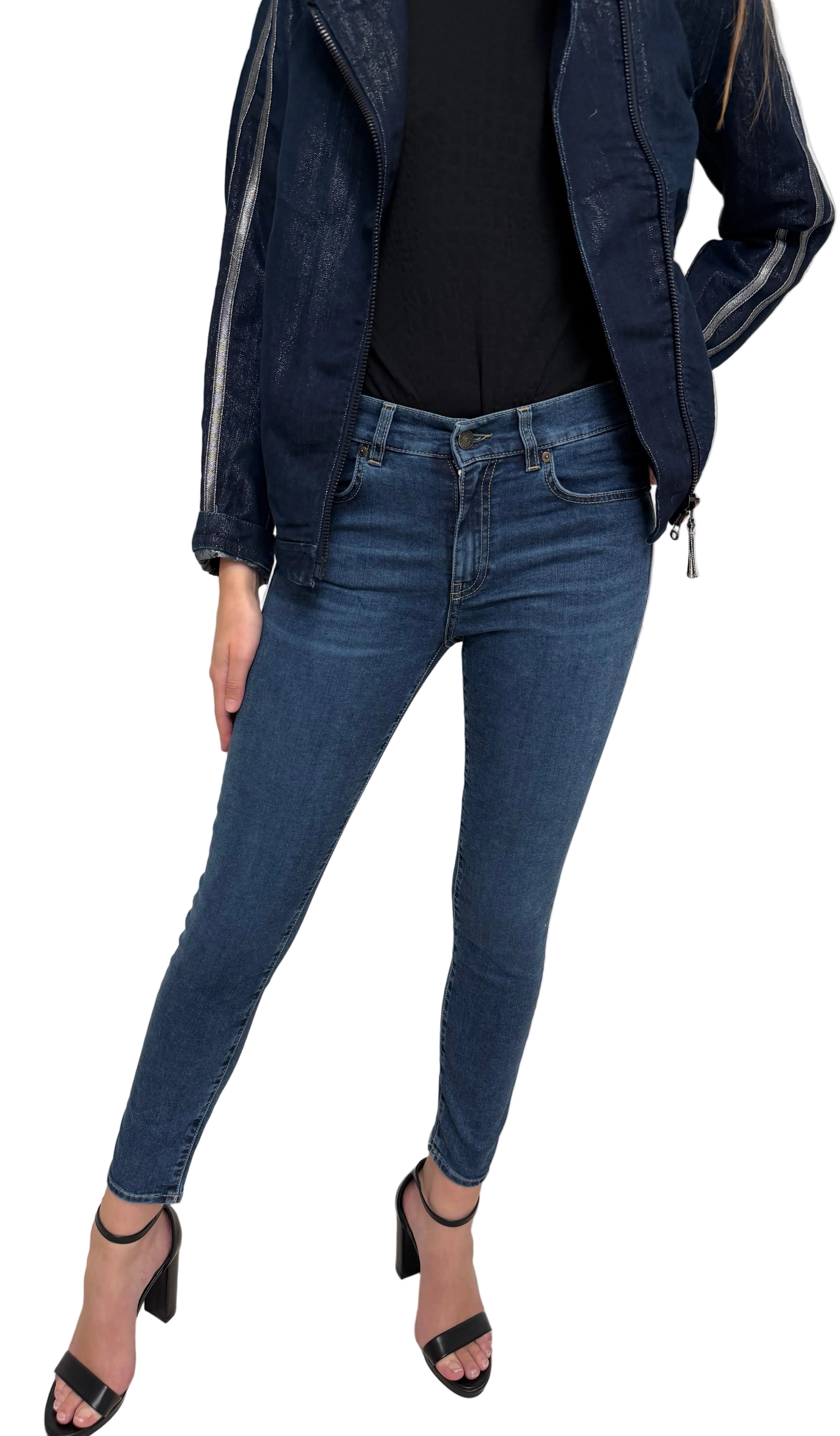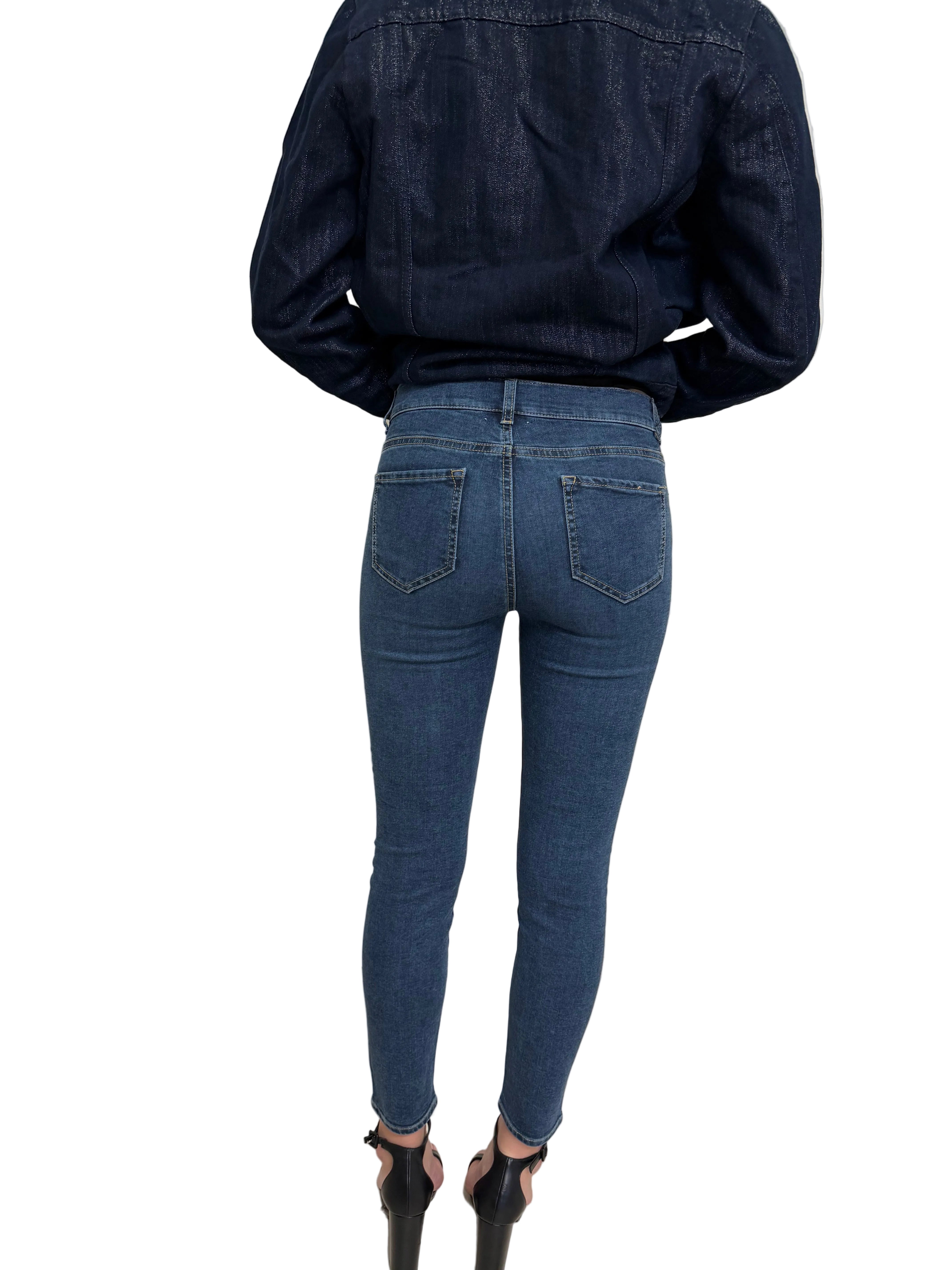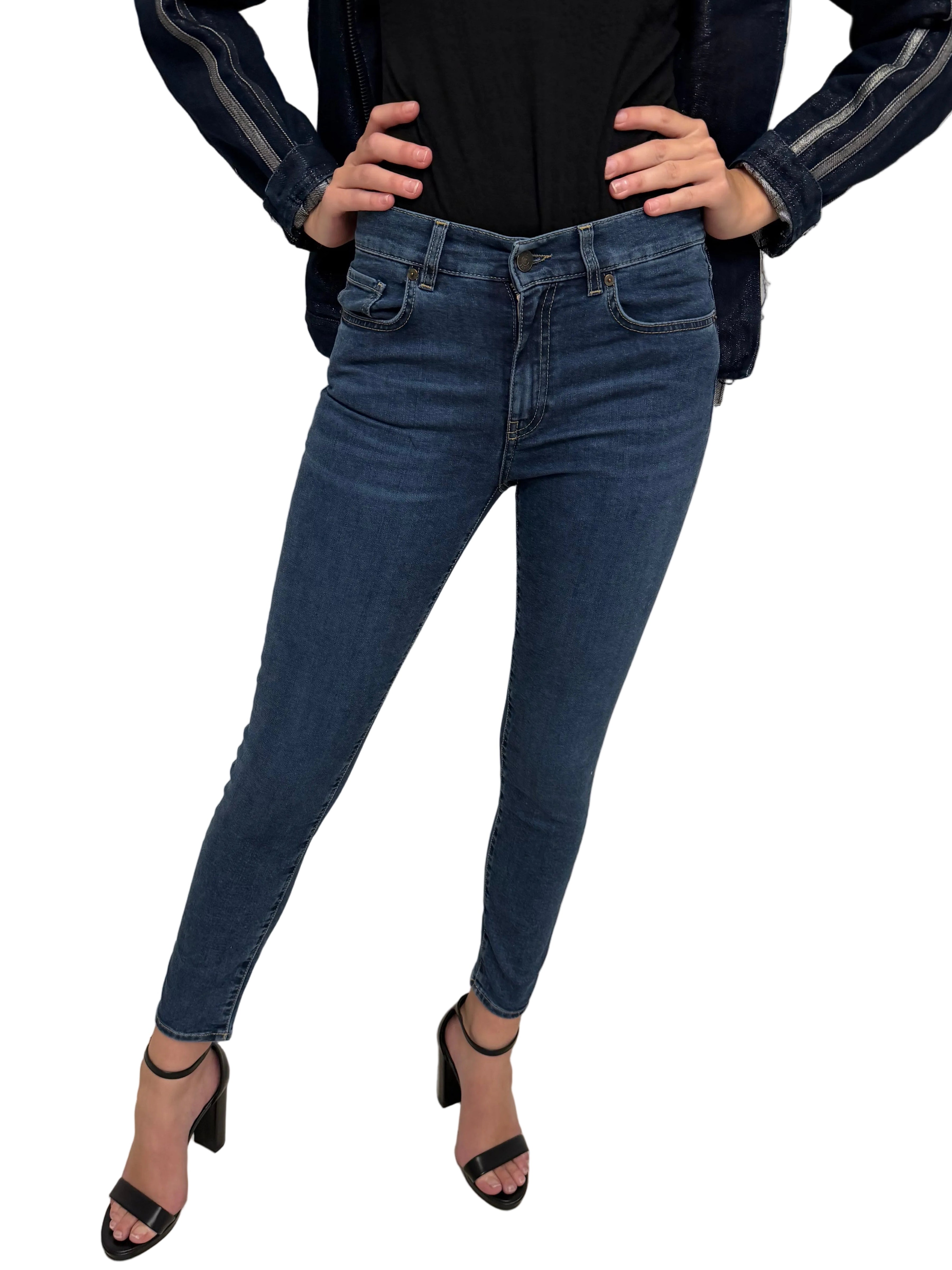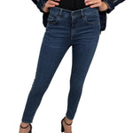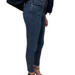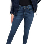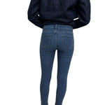 Pantalone skinny in denim blu, caratterizzato da una vestibilità aderente che valorizza la silhouette.