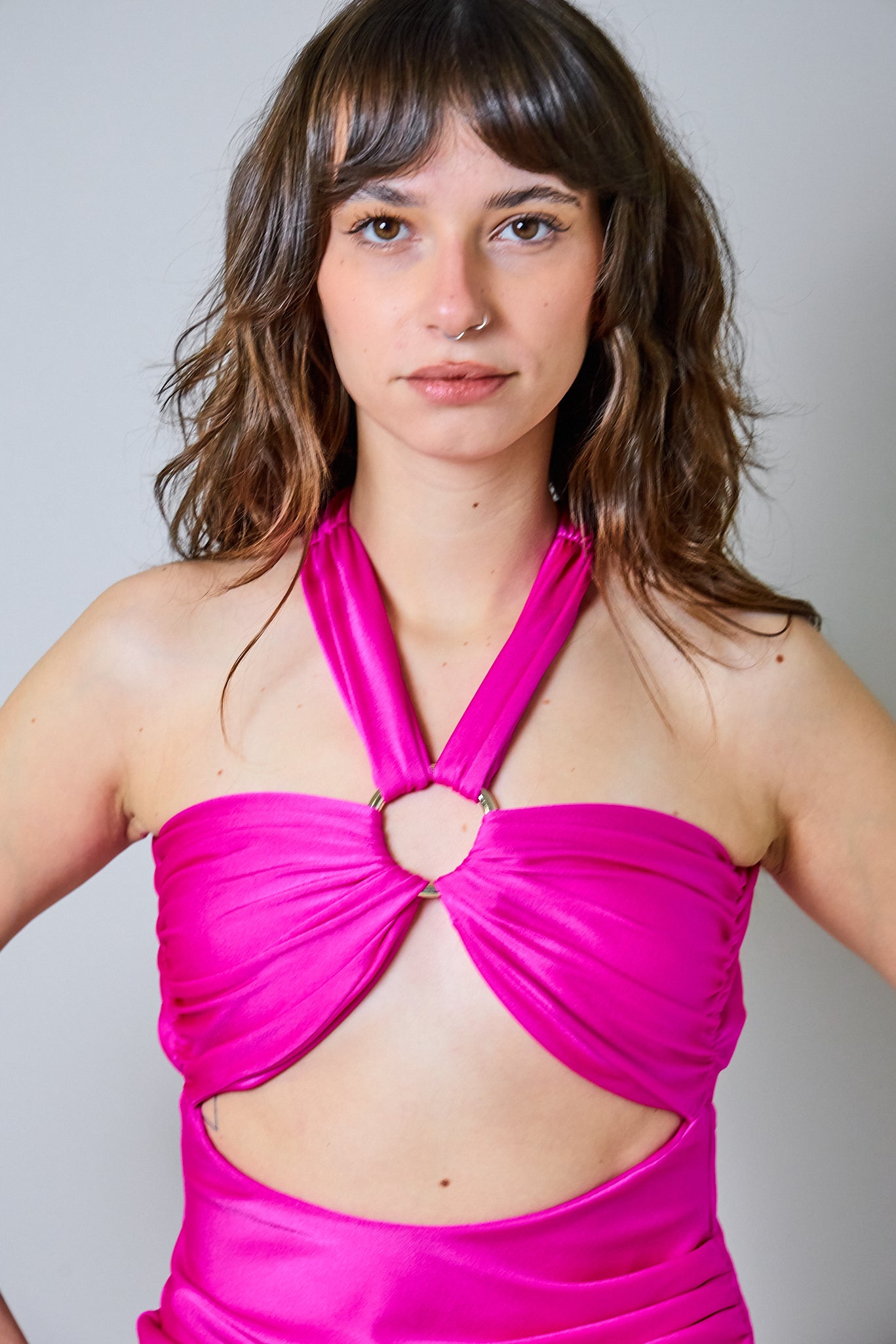 Il design con cut-out e dettaglio ad anello sul décolleté valorizza la silhouette, mentre il tessuto effetto satin dona luce e sensualità ad ogni movimento.