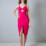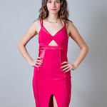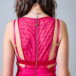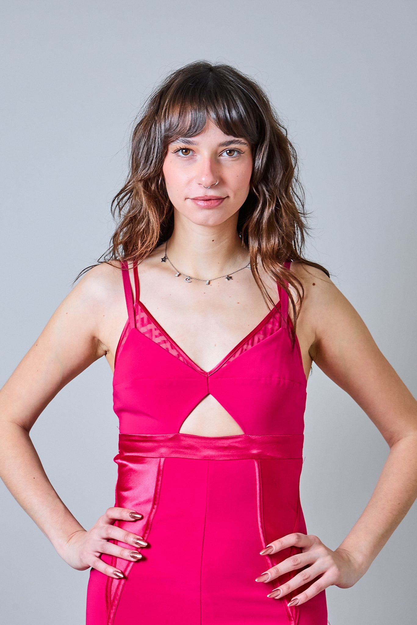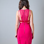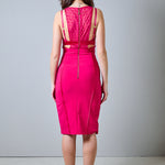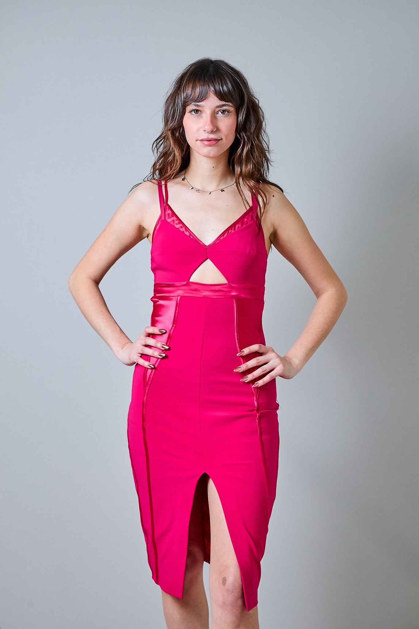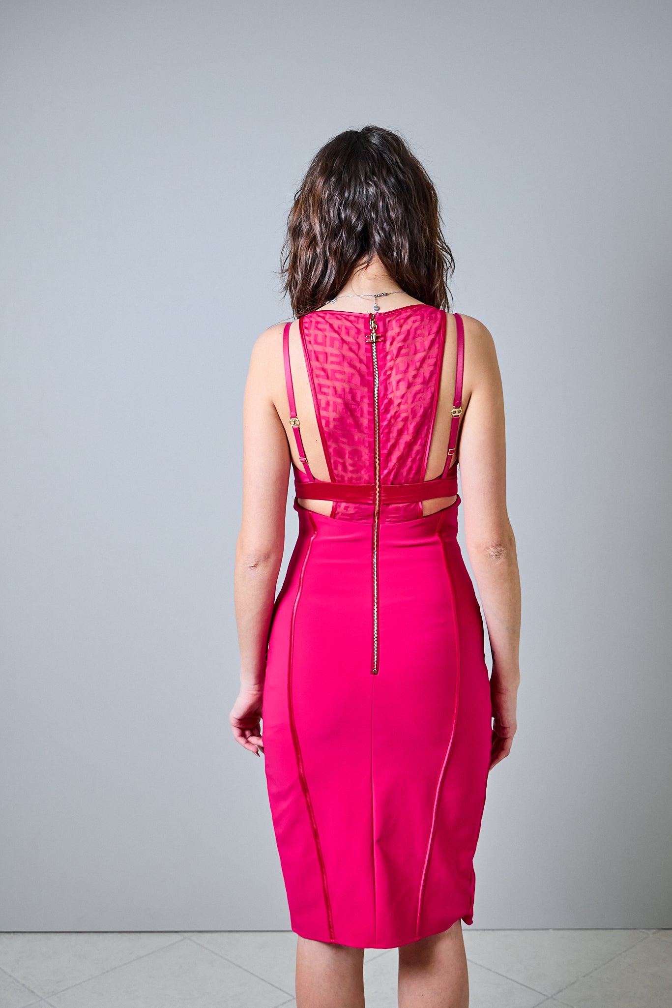 Elegante e seducente, questo abito tubino fucsia è il capo ideale per valorizzare la silhouette con un tocco sofisticato e glamour. Realizzato in tessuto elasticizzato, avvolge le forme con una vestibilità aderente, mentre gli inserti in pizzo e tulle creano un raffinato effetto vedo-non-vedo.