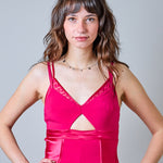 Il design senza maniche con scollatura a cuore esalta il décolleté con eleganza, mentre lo spacco anteriore dona movimento e sensualità. Sul retro, la chiusura con zip a vista impreziosita da dettaglio gioiello aggiunge un elemento distintivo e ricercato.