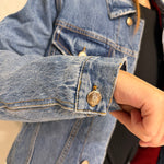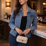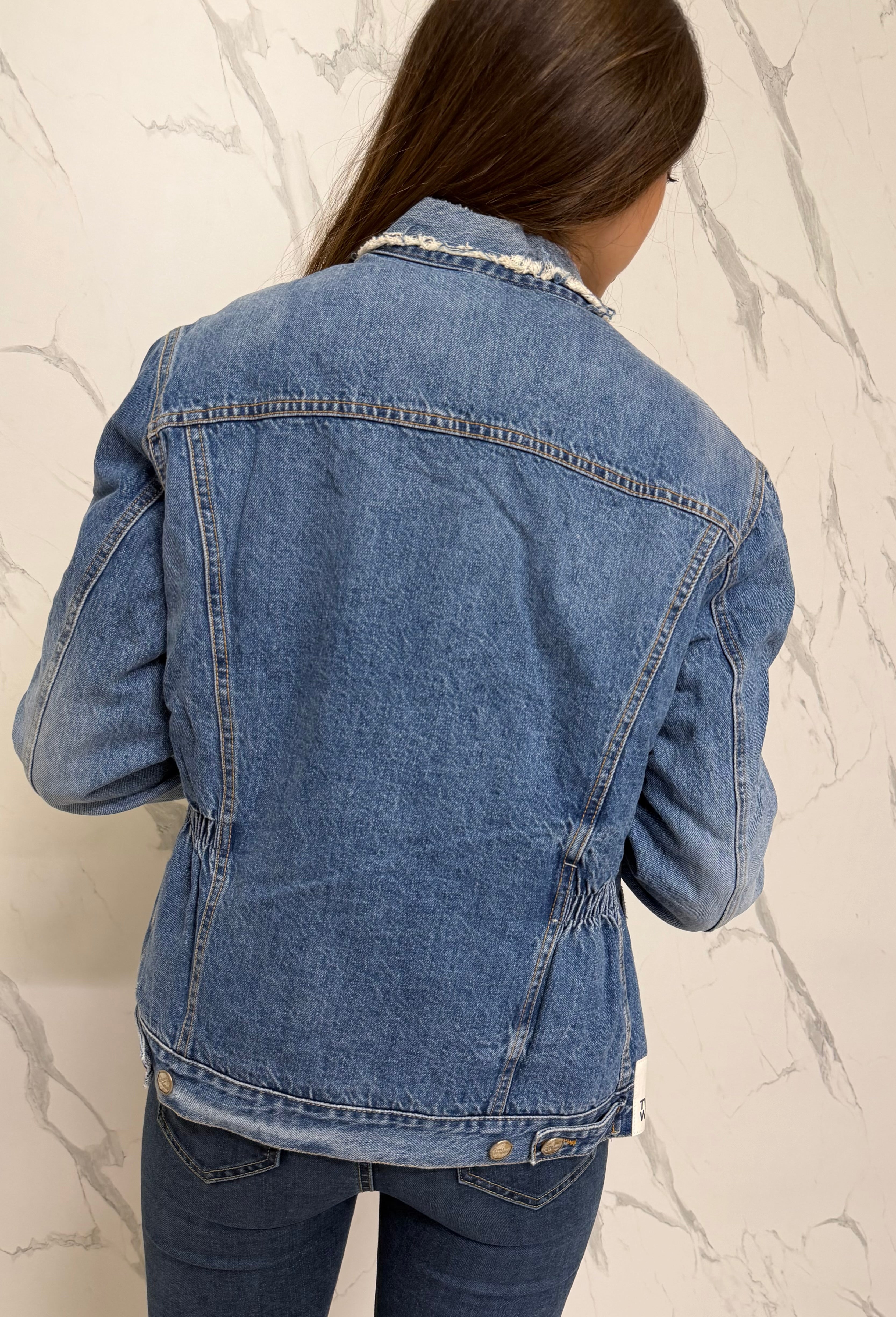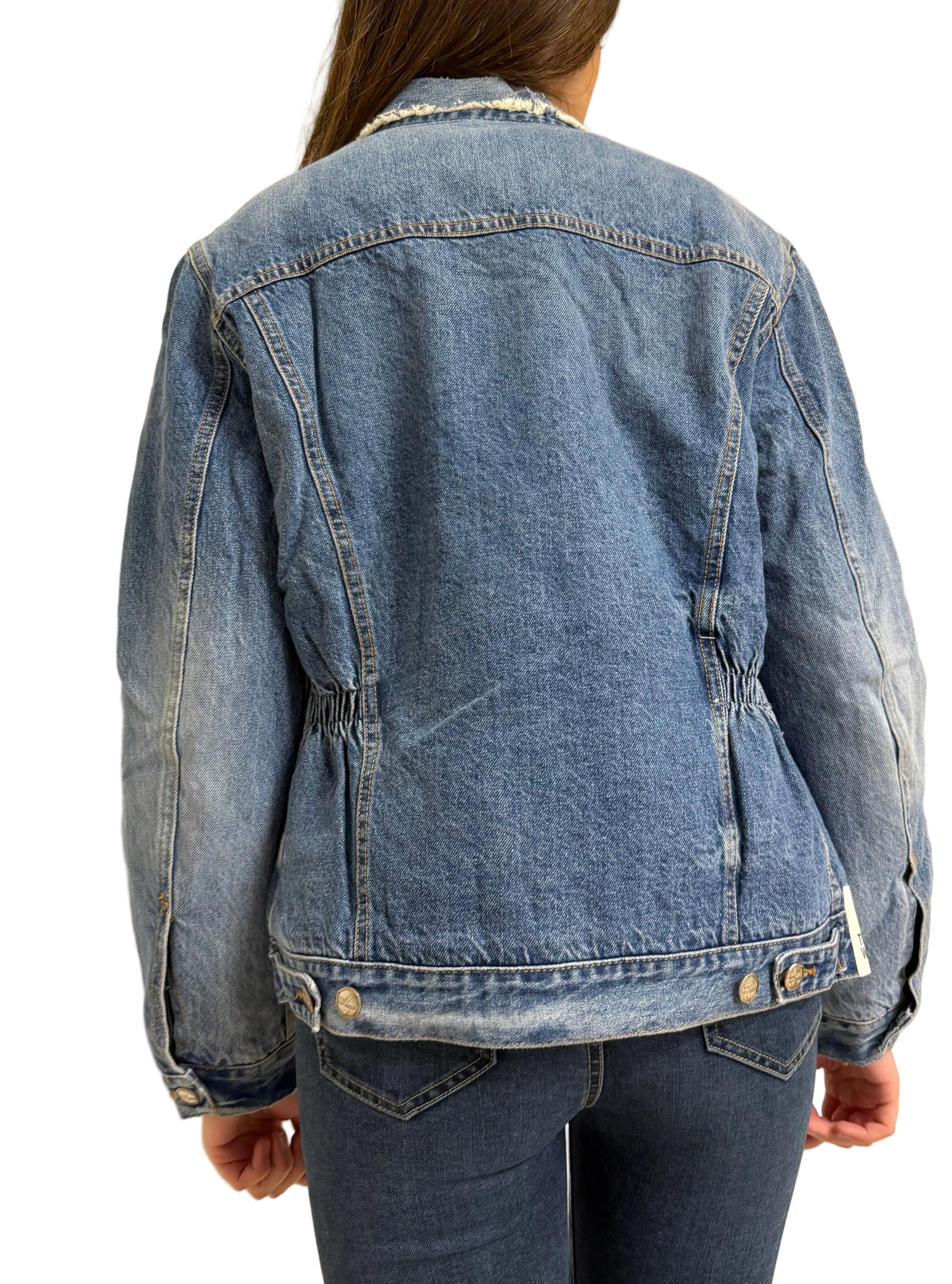 Realizzata in denim di alta qualità, questa giacca presenta una linea strutturata ma confortevole, valorizzata da un elastico interno sul retro che definisce delicatamente la silhouette. Il colletto con bordo sfrangiato aggiunge un tocco moderno, mentre i bottoni metallici logati e le tasche frontali con pattina richiamano il design classico del giubbotto in denim.