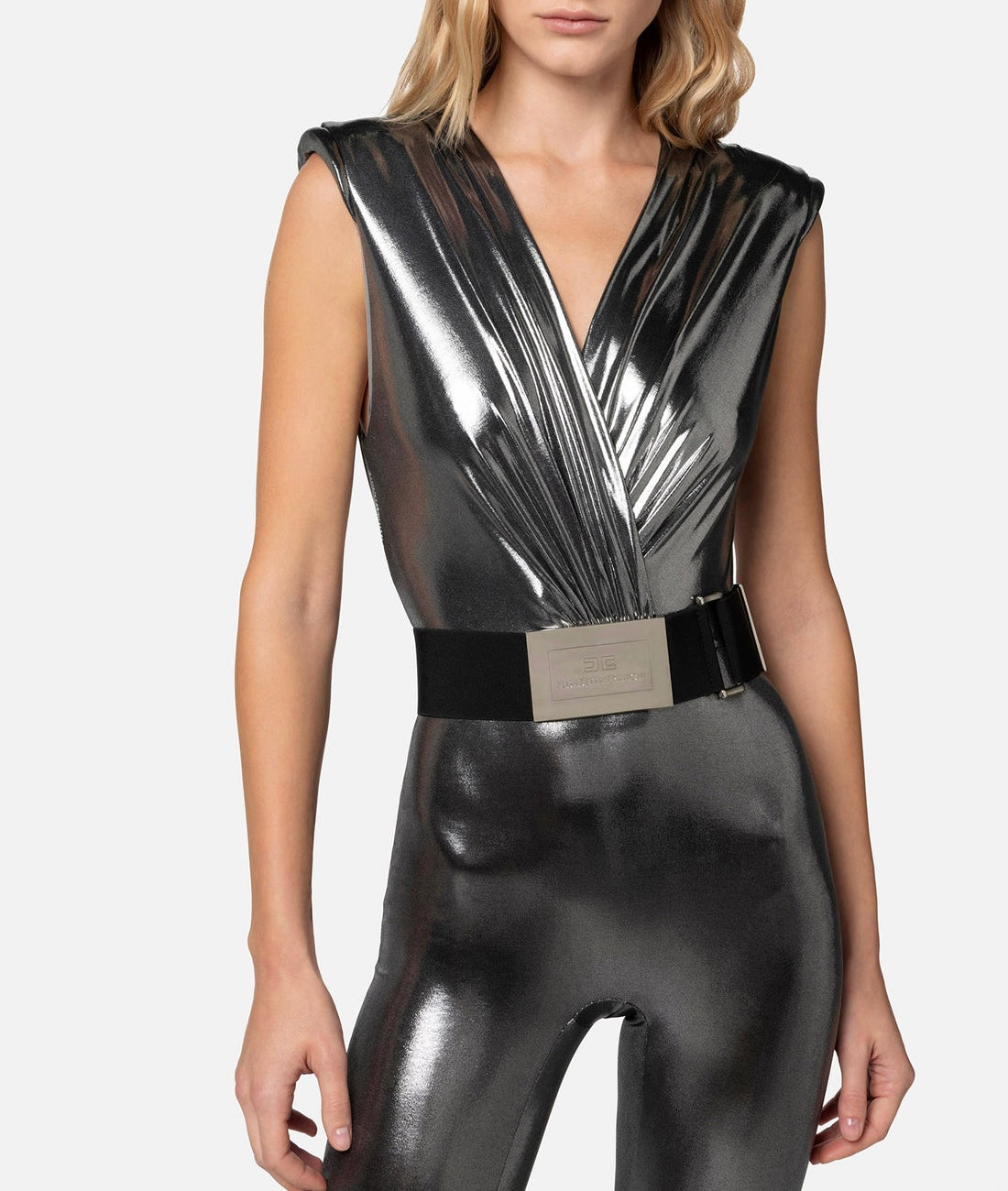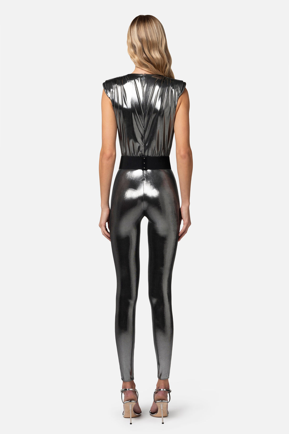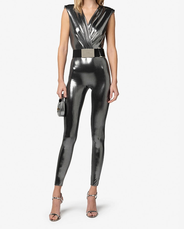 Macacão sem mangas em jersey laminado com decote drapeado profundo e leggings. A cintura é realçada por um cinto de material sintético com efeito couro e fivela de metal prateado.